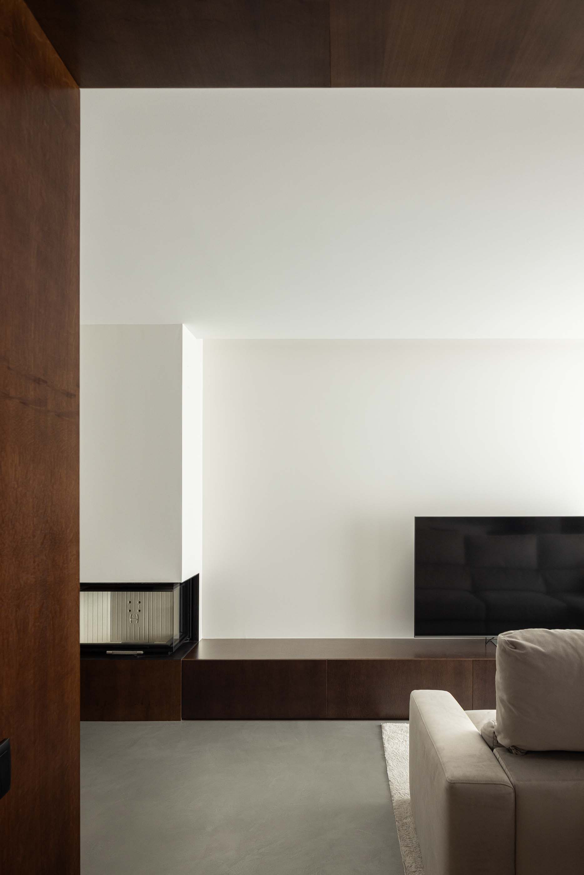 프로젝트의 중심에는 맞춤 제작 가구가 놓인다. 식탁은 주방과 거실 사이에서 물리적 벽 없이 공간을 구획하는 전이 요소로 작동한다. 업무용 책상 역시 별도로 설계되어 공간에 자연스럽게 통합되었다. 양면 벽난로는 서로 다른 영역 사이의 시각적 연속성을 강화하며, 현관에는 맞춤형 수납장이 설치되어 집에 들어서는 순간부터 프로젝트의 언어를 드러낸다.