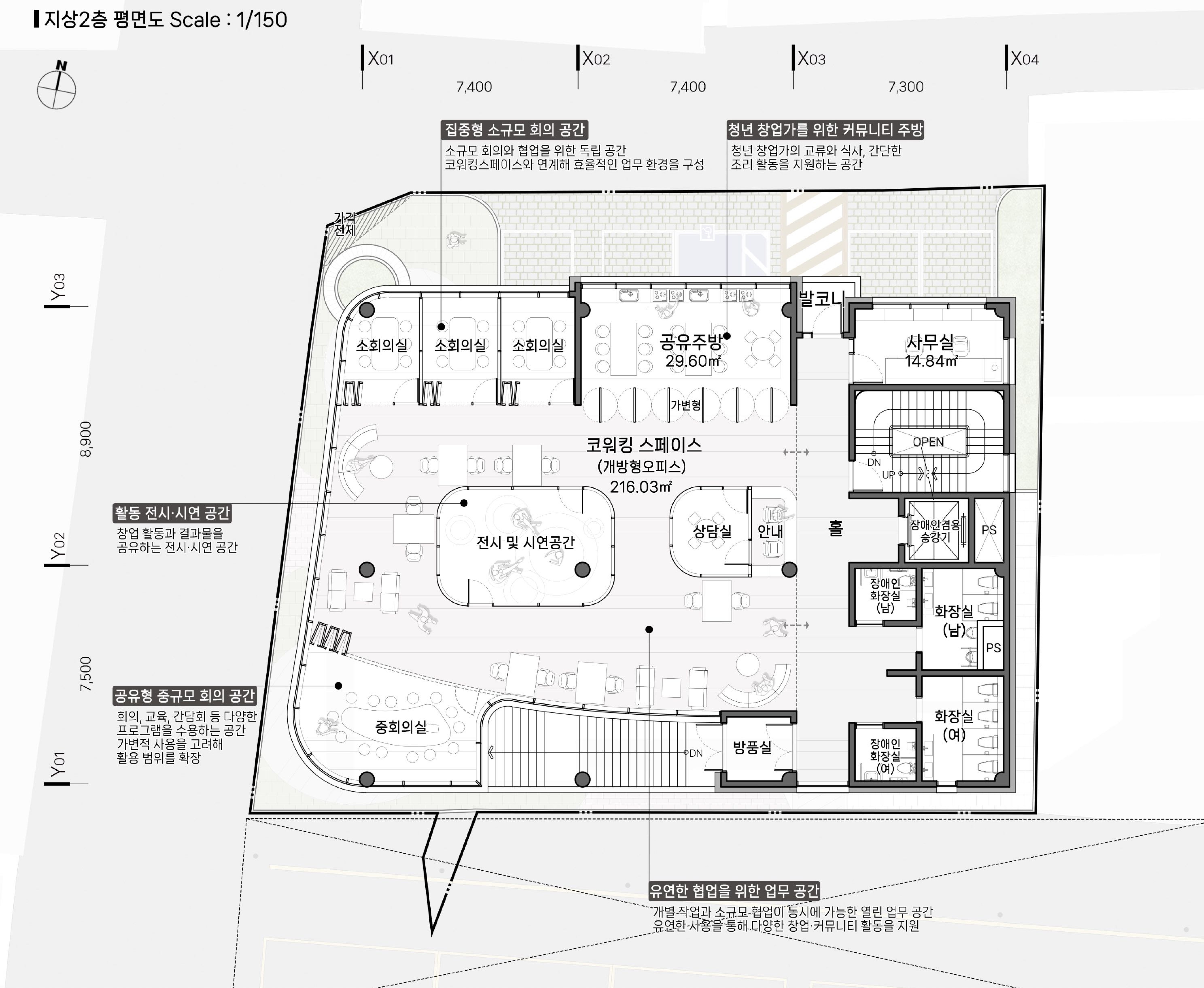 2층은 청년 창업가를 위한 코워킹스페이스를 중심으로 구성했다. 개방형 레이아웃 안에 다양한 좌석 유형과 소규모 회의실, 상담실, 전시·시연 공간을 배치해 협업과 교류가 자연스럽게 발생하도록 했다. 1층과 직접 연결되는 동선을 통해 전시와 프리마켓이 즉각적으로 이루어질 수 있도록 연계성을 강화했다.