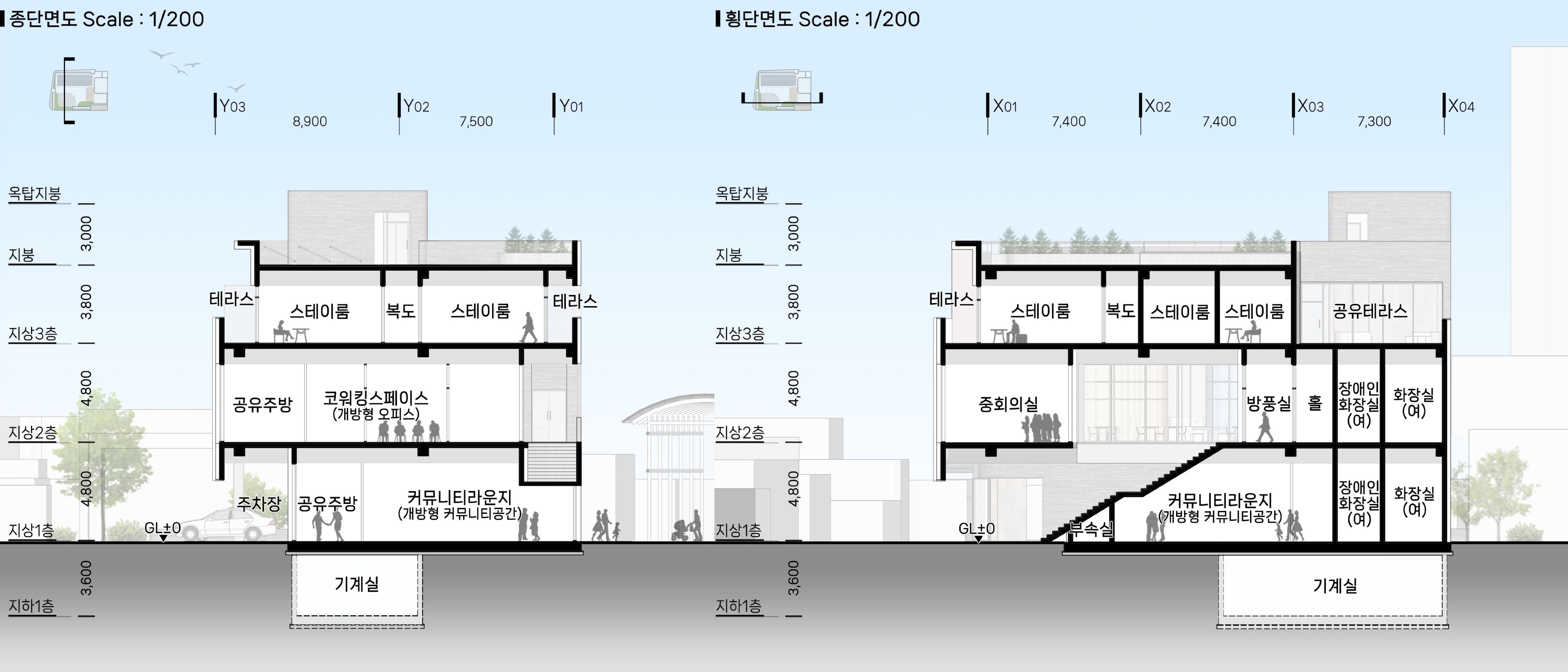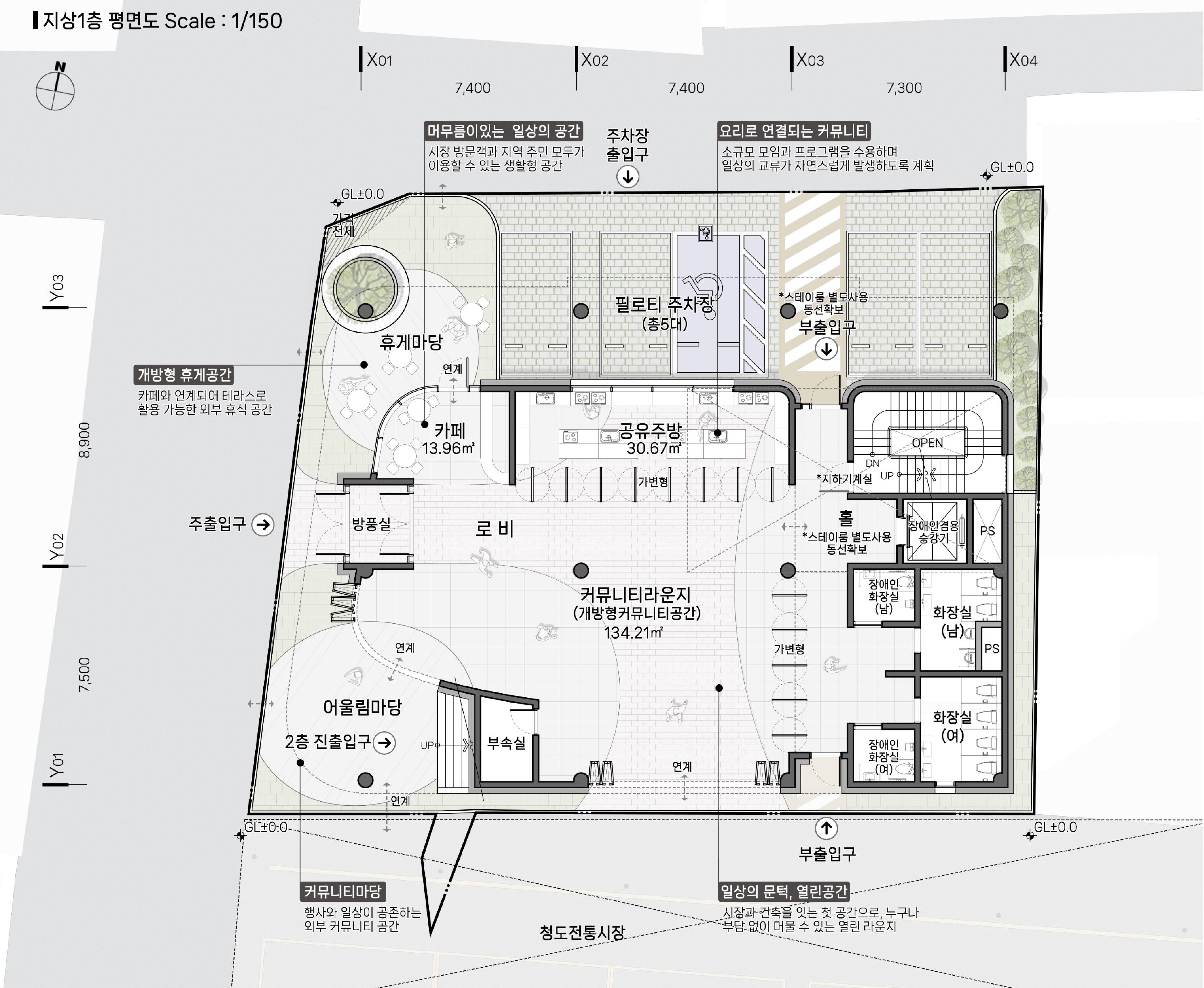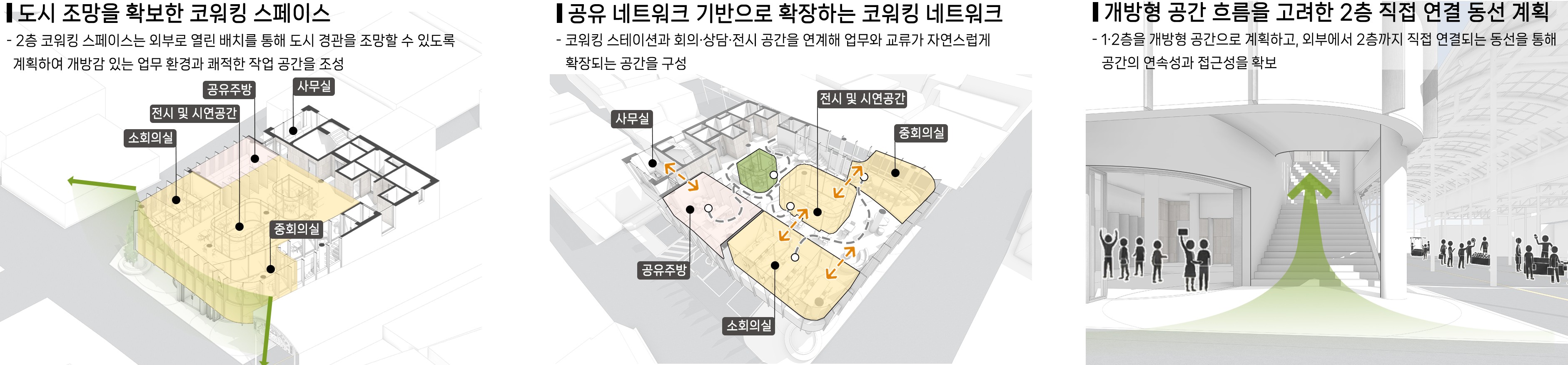 1층 커뮤니티 라운지는 팝업스토어, 프리마켓, 전시, 조리 이벤트 등 다양한 활동을 수용할 수 있는 가변적 공간으로 구성하고, 시장 방향으로 열린 연계 공간과 전면도로 측 ‘어울림마당’을 통해 내부 프로그램이 외부로 확장되도록 했다. 어울림마당을 통해 진입하는 계단은 2층 코워킹스페이스와 직접 연결되어, 창작 활동과 이벤트가 수직적으로 이어지는 구조를 만든다.