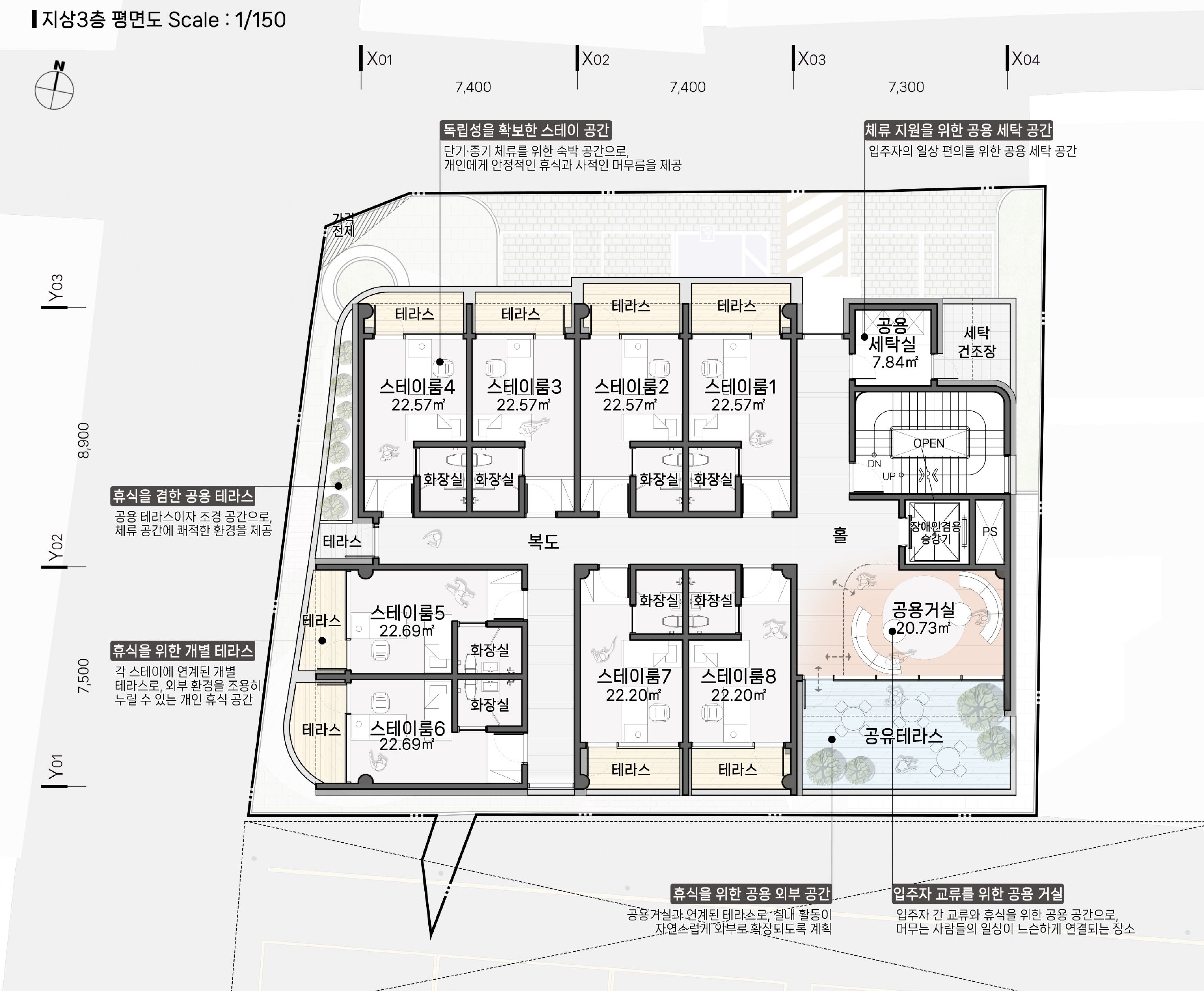 3층은 청년 창업자의 거주 공간인 스테이룸과 공용거실로 구성해 프라이버시와 휴식의 질을 확보했다. 주차장에서 별도 진입이 가능하도록 동선을 분리해 개방 공간과의 혼선을 방지하고, 각 실에는 전용 테라스를 두어 채광과 환기를 확보했다. 남향 공용거실과 공유 테라스는 입주자 간의 교류를 유도하면서도 쾌적한 생활 환경을 제공한다.