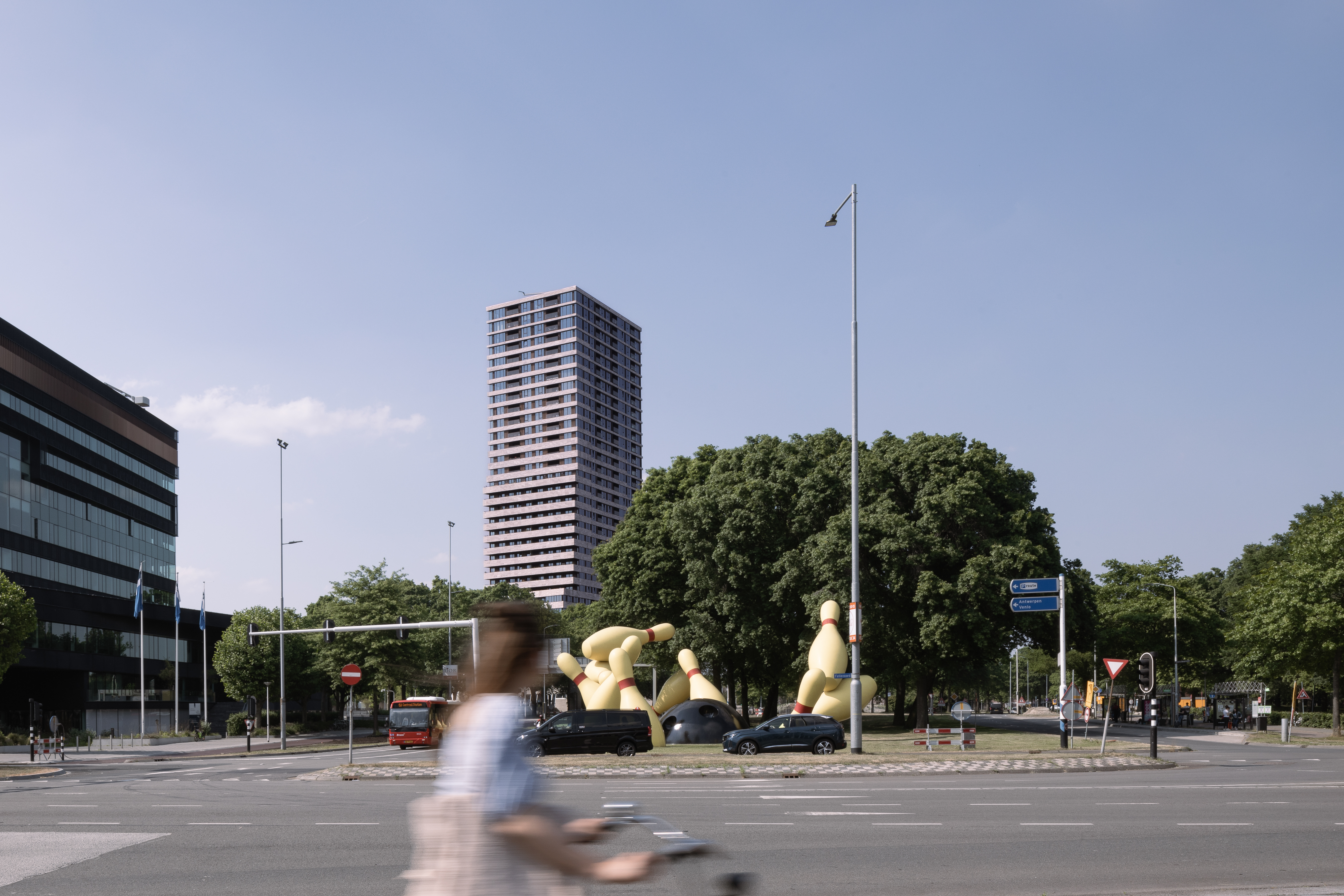 조경은 **델바 랜드스케이프 아키텍처 앤 어바니즘(DELVA Landscape Architecture & Urbanism)**이 담당했다. 기존 포장 주차장은 공공 공원으로 전환되었고, 이는 에인트호번을 가로지르는 녹지 축을 강화하는 전략적 개입이다. 녹지는 빗물 저류와 생물 다양성 확보라는 기능적 역할도 수행한다. 발코니 플랜터에는 18층까지 식재가 도입되어, 건물과 공원이 시각적으로 연결된다.