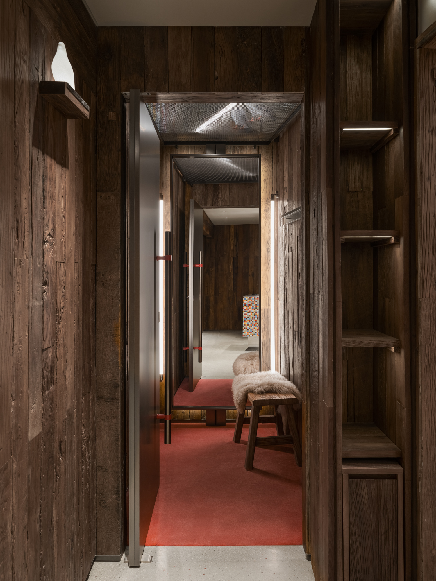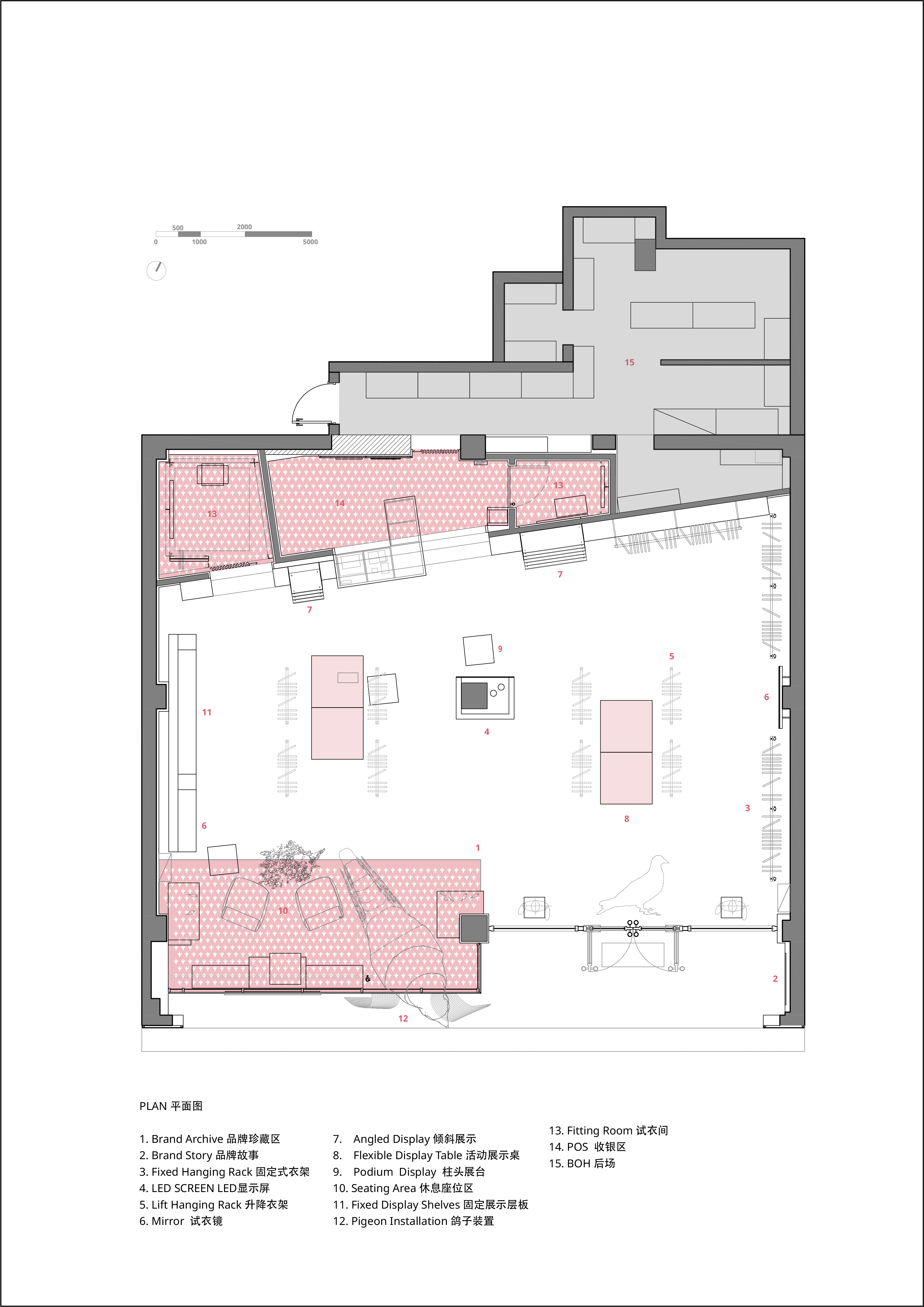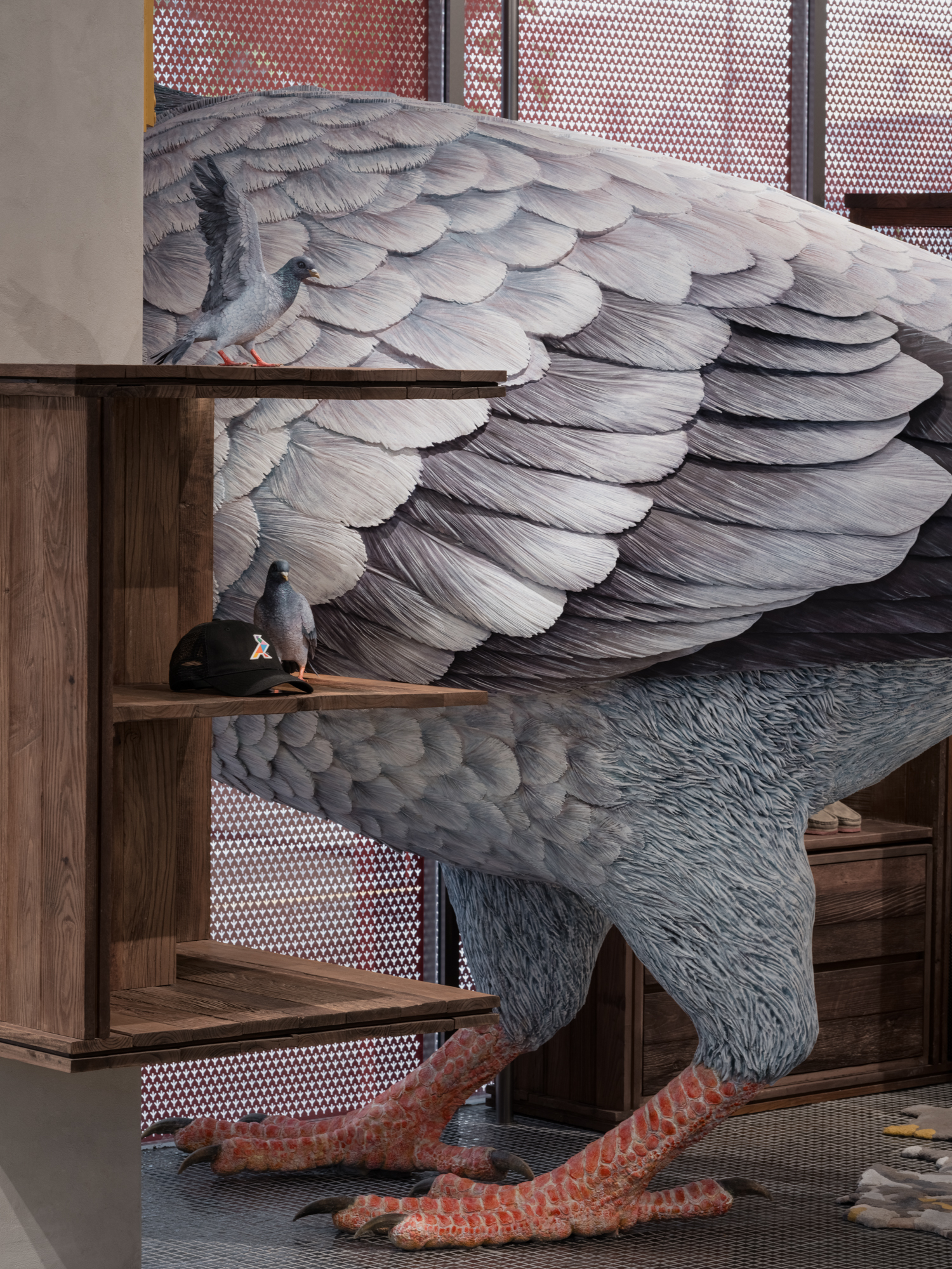 입구를 지나면 브랜드 아카이브 공간이 이어진다. 재활용 목재와 메탈 메시를 사용해 ‘비둘기 집’을 연상시키는 거친 분위기를 만들었고, 뉴욕 공사장 스캐폴딩 구조를 차용해 약 30년에 걸친 브랜드 역사를 전시한다. 뒤편 라운지에는 핑크 소파와 ‘비둘기 배설물’ 패턴 카펫이 배치되어 유머러스한 사회적 공간을 형성한다.