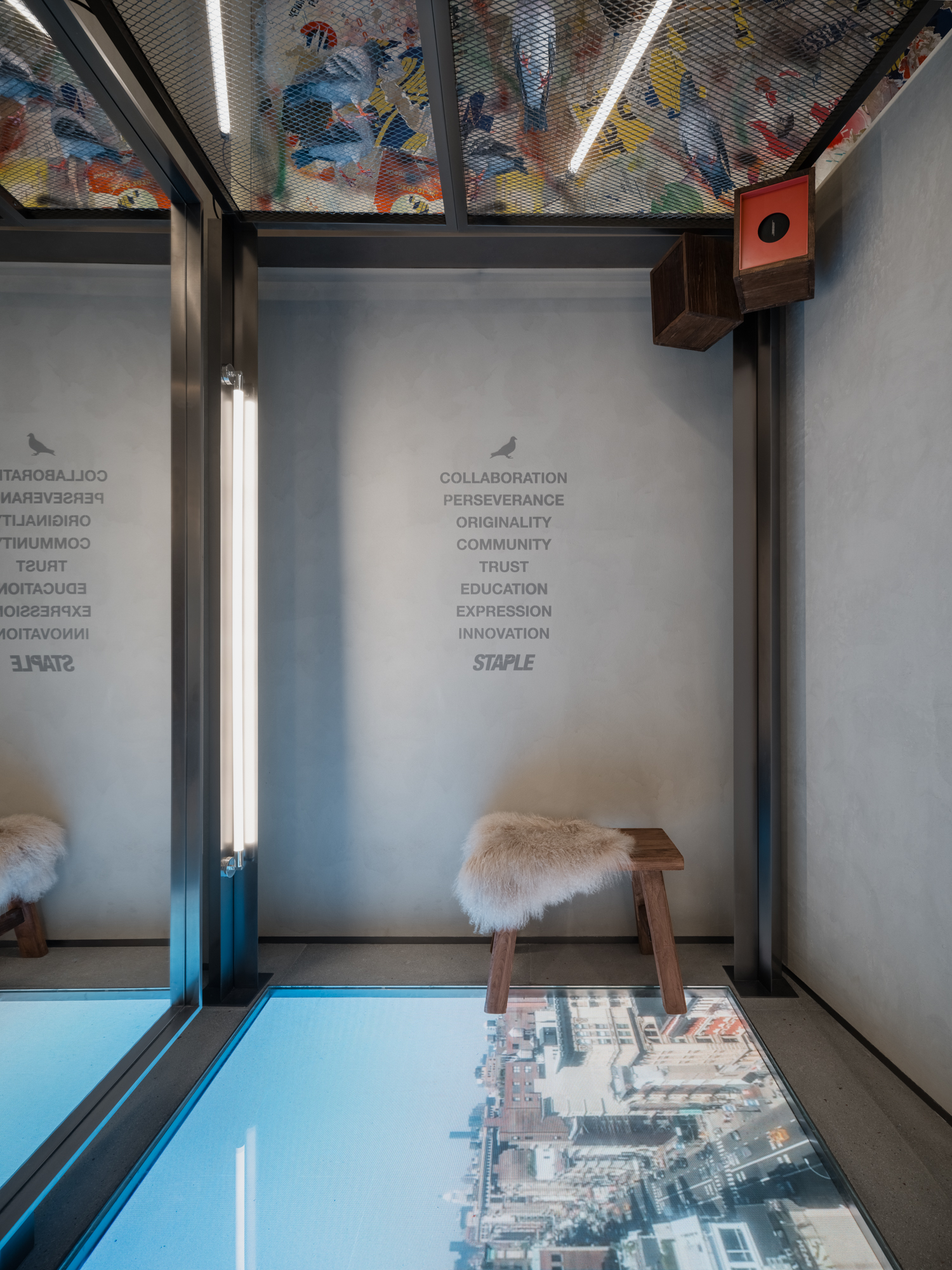 피팅룸은 ‘뒤집힌 시점’을 구현한다. 메탈 메시 천장과 노출 조명, 비둘기 설치물은 도시를 상공에서 내려다보는 감각을 연출한다. 메인 피팅룸 바닥에는 뉴욕과 상하이 스카이라인 영상이 반복 재생되어 두 도시를 가로지르는 경험을 만든다. 작은 피팅룸은 재활용 목재 벽과 핑크 카펫으로 구성되어 친밀하면서도 스트리트 감성을 유지한다.