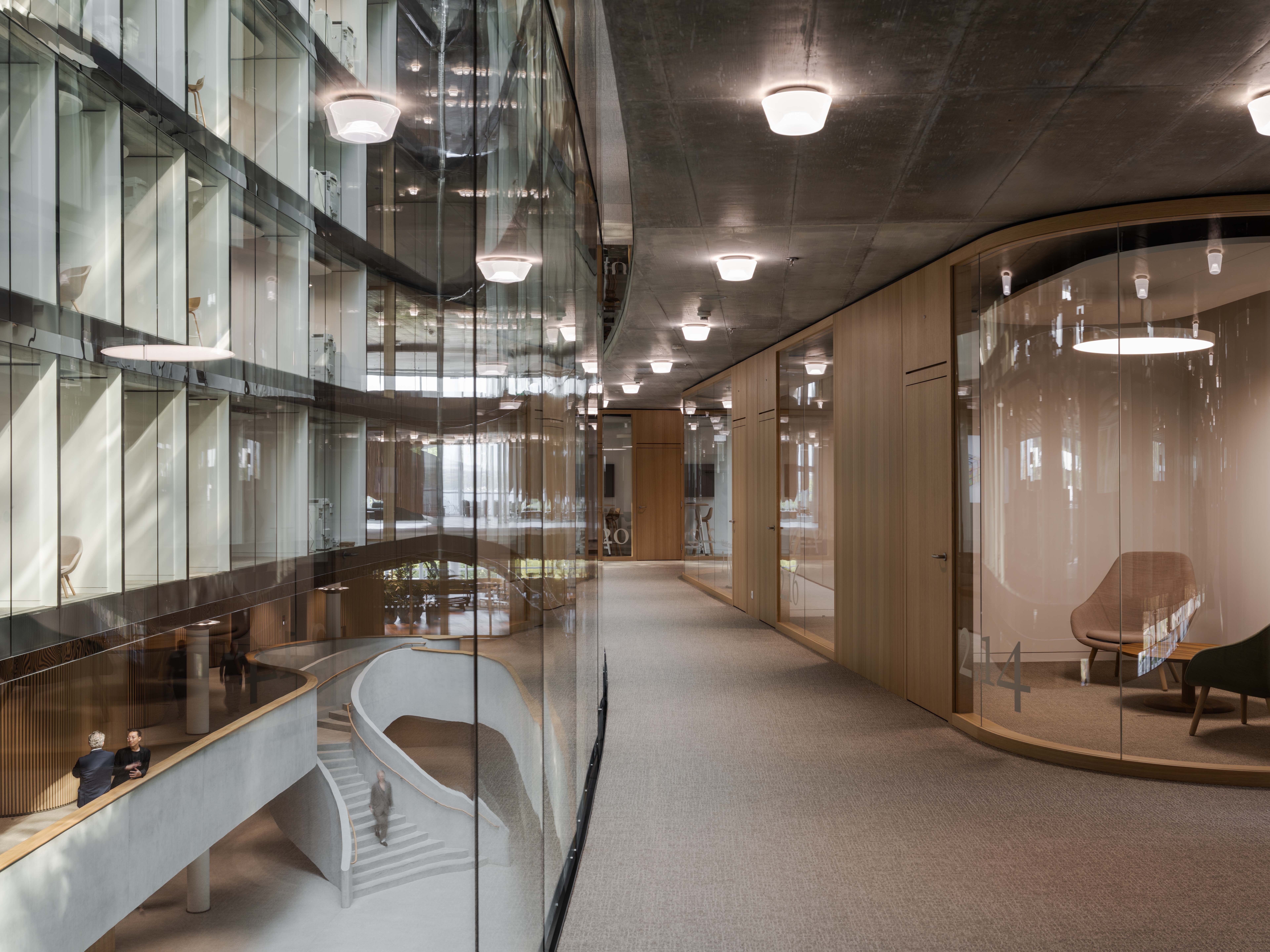 공간 구성은 협업과 커뮤니티를 중심에 둔다. 두 개의 복층 협업 공간과 레스토랑은 호수를 향해 열려 있으며, 직원 누구나 동일한 풍경을 공유할 수 있다. 고객 전용 공간 역시 호수를 조망하도록 배치되어 업무 공간과 자연 경관을 연결한다. 그리스 원형극장을 연상시키는 강당은 정원을 향해 열리며, 500명 이상을 수용한다. 전면은 개별 좌석, 후면은 벤치형 좌석으로 구성되어 상황에 따라 다양한 사용이 가능하다.