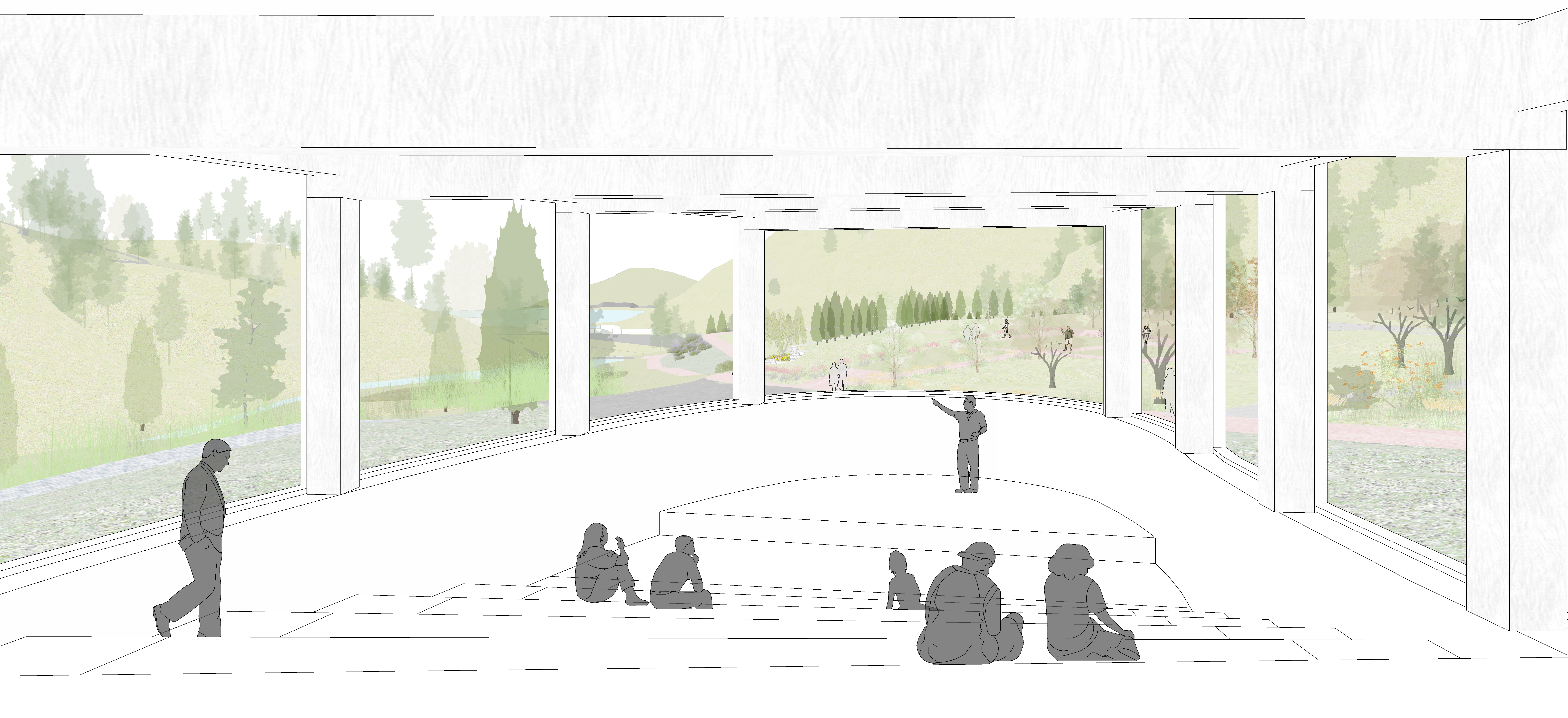 진입회랑을 경계로 나뉜 주민개방시설은 개방형화장실과 수유실, 다목적실로 구성된다. 다목적실은 지형을 활용해 자연스러운 단차로 무대가 조성되어 주민을 위한 공공적 프로그램이 운영됩니다. 정원과 온실은 남측으로 열린 실구성과 지붕재료인 ETFE를 활용한 천창으로 식물 생장을 고려하여 계획합니다. 지형의 흐름을 따라 거닐며 만나는 전시동선의 끝에는 외부의 연결마당과 닿게 되고 카페로 이동하여 봉학골정원과 용산저수지가 내려다보이는 자연풍경을 감상할 수 있다.