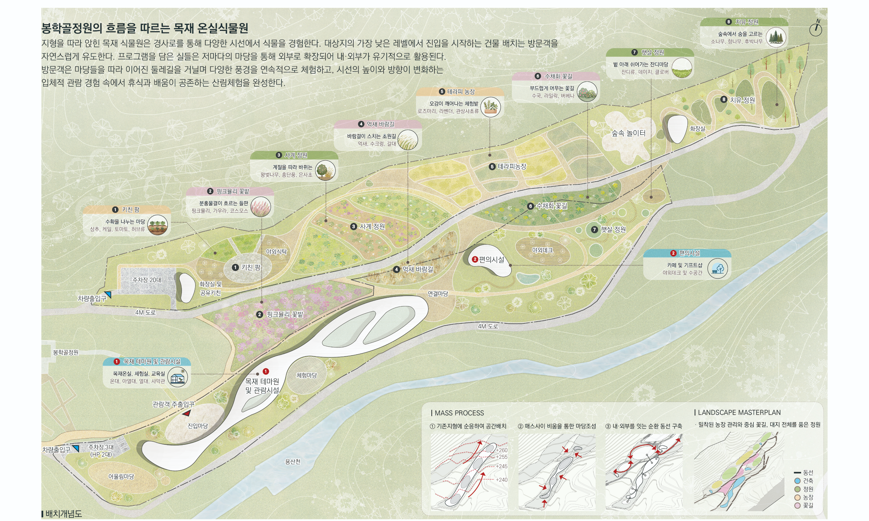 전체 설계대상지를 활용성 증대를 위해 목재 온실식물원 뿐 아니라 카페, 야외화장실, 공유키친 등을 포함하는 편의시설의 계획과 키친팜, 사계정원, 테라피농장 등 야외 식재공간을 통해 관람의 편의성과 다양성을 확보한다.