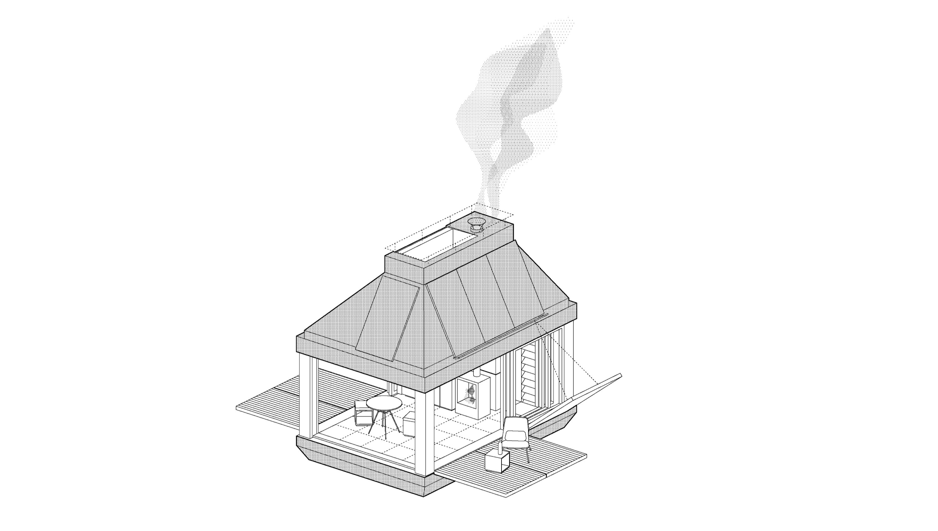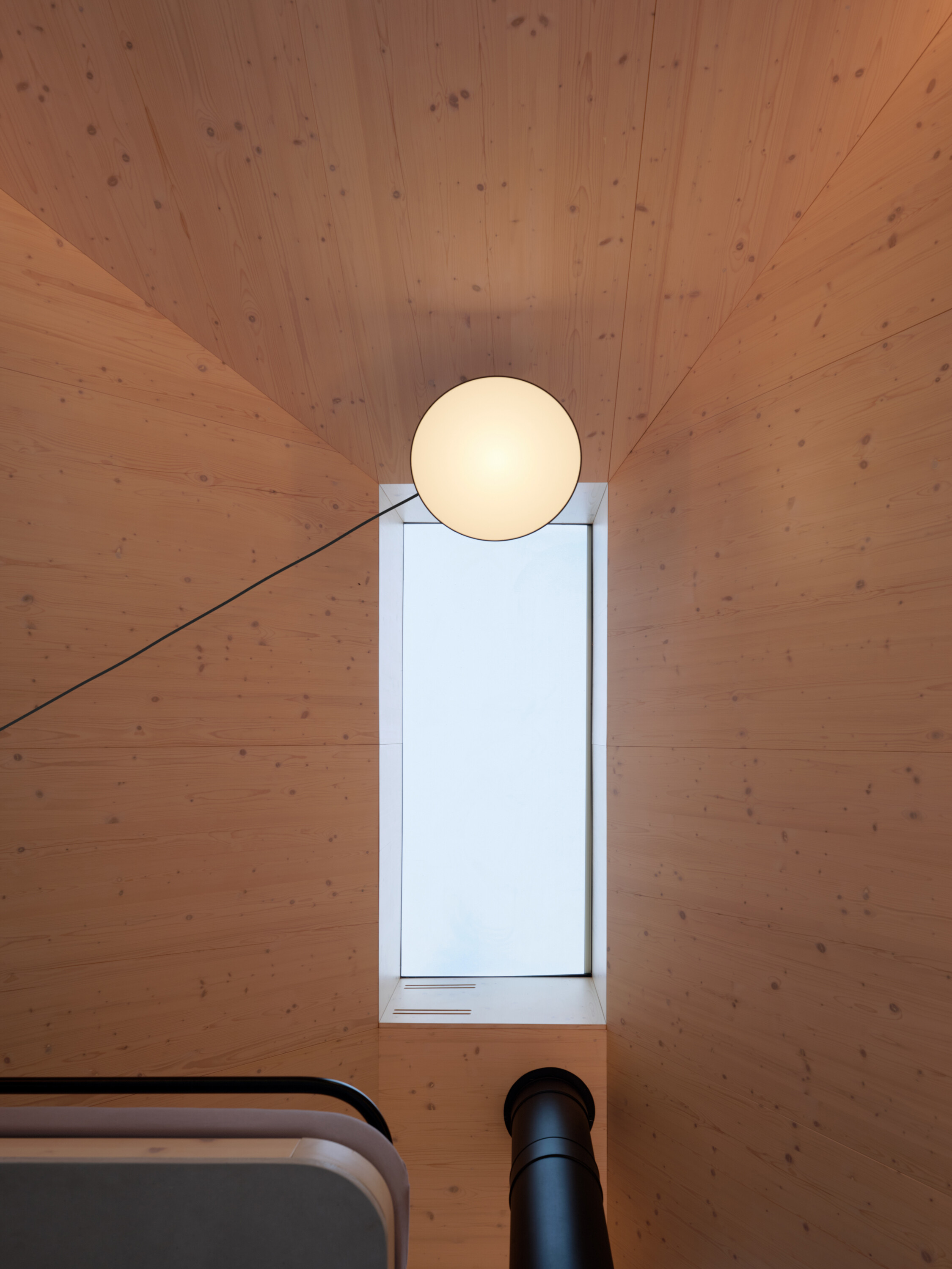 주 생활 공간 뒤편에는 콤팩트한 키친과 샤워실이 이어진다. 맞춤 제작된 콘크리트 세면대는 창틀 안에 직접 배치되어 숲을 향한 시선을 유도한다. 일상의 동작이 자연과 다시 연결되도록 의도한 장치이다. 저녁이 되면 공간은 또 다른 표정을 드러낸다. 로프트에서 내려오는 펜던트 조명을 당기면 숨겨져 있던 침실이 모습을 드러낸다. 고정 계단을 두지 않고, 필요할 때만 꺼내는 접이식 사다리를 수납장 안에 통합했다. 상부는 유리 대신 단단한 지붕 외피로 감싸여 보다 밀도 높은 내밀함을 형성하고, 천창은 별빛을 받아들인다.