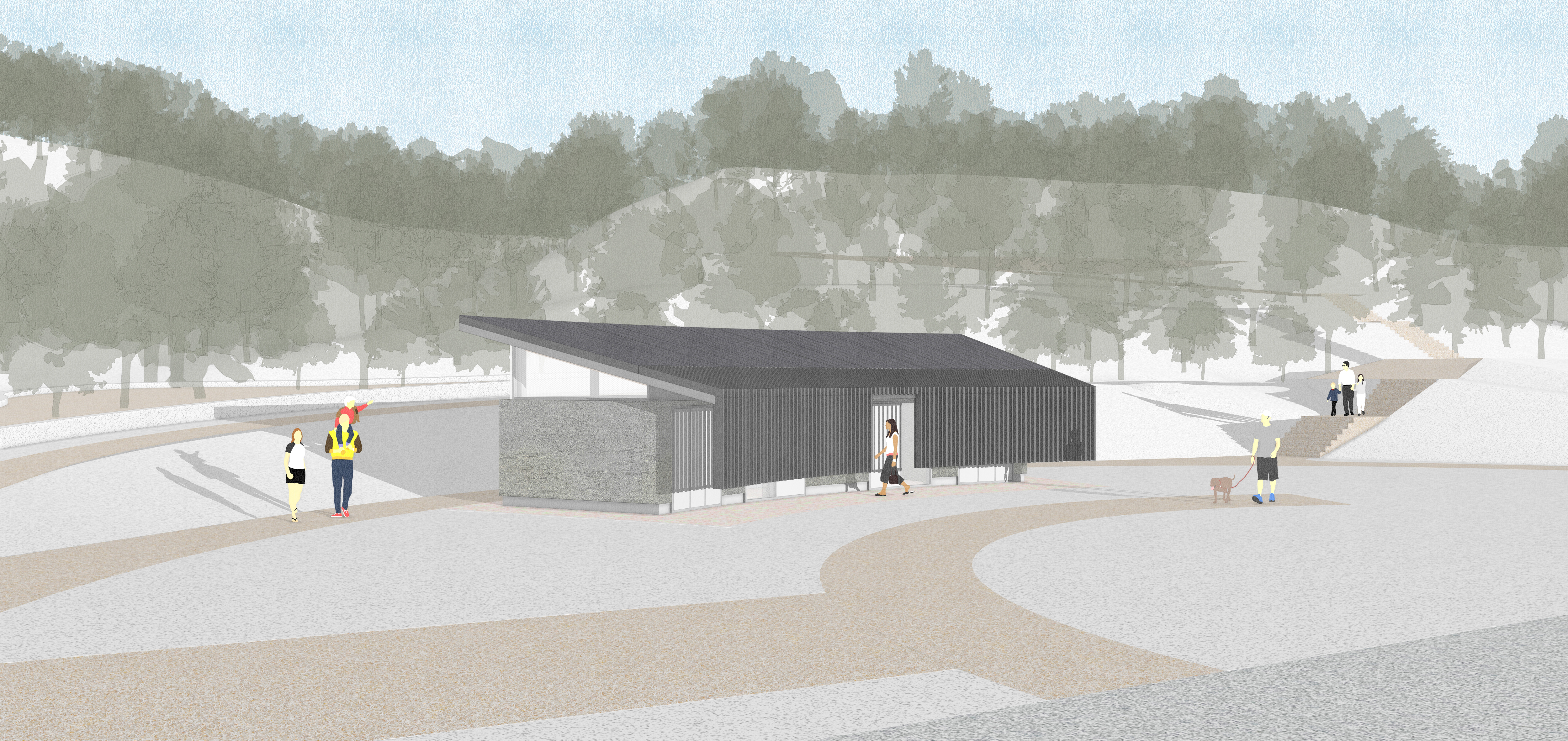 도시의 소란함을 뒤로하고 숲의 입구에 들어설 때, 건축은 자연을 맞이하는 정중한 인사가 된다. 경계의 연속체로서 제안된 세 개의 동은 땅의 숨결을 종이처럼 펼쳐낸 대지의 전개도이다. 흩어져 있던 대지의 조각들은 지형을 따라 유연하게 흐르는 지붕-스케이프를 통해 하나의 유기적인 경관으로 묶인다. 인위적인 선을 덜어낸 자리에 남은 단순한 기하학은 숲의 본질을 투영하는 장치이며, 방문객의 시선이 자연스럽게 자연에 닿도록 유도하는 감각적 풍경이 된다. 대지의 물성이 응결된 세 개의 건축적 매스는 도시의 속도를 숲의 느린 호흡으로 치환하며, 일상의 끝에서 마주하는 고요한 전이 공간을 형성한다.