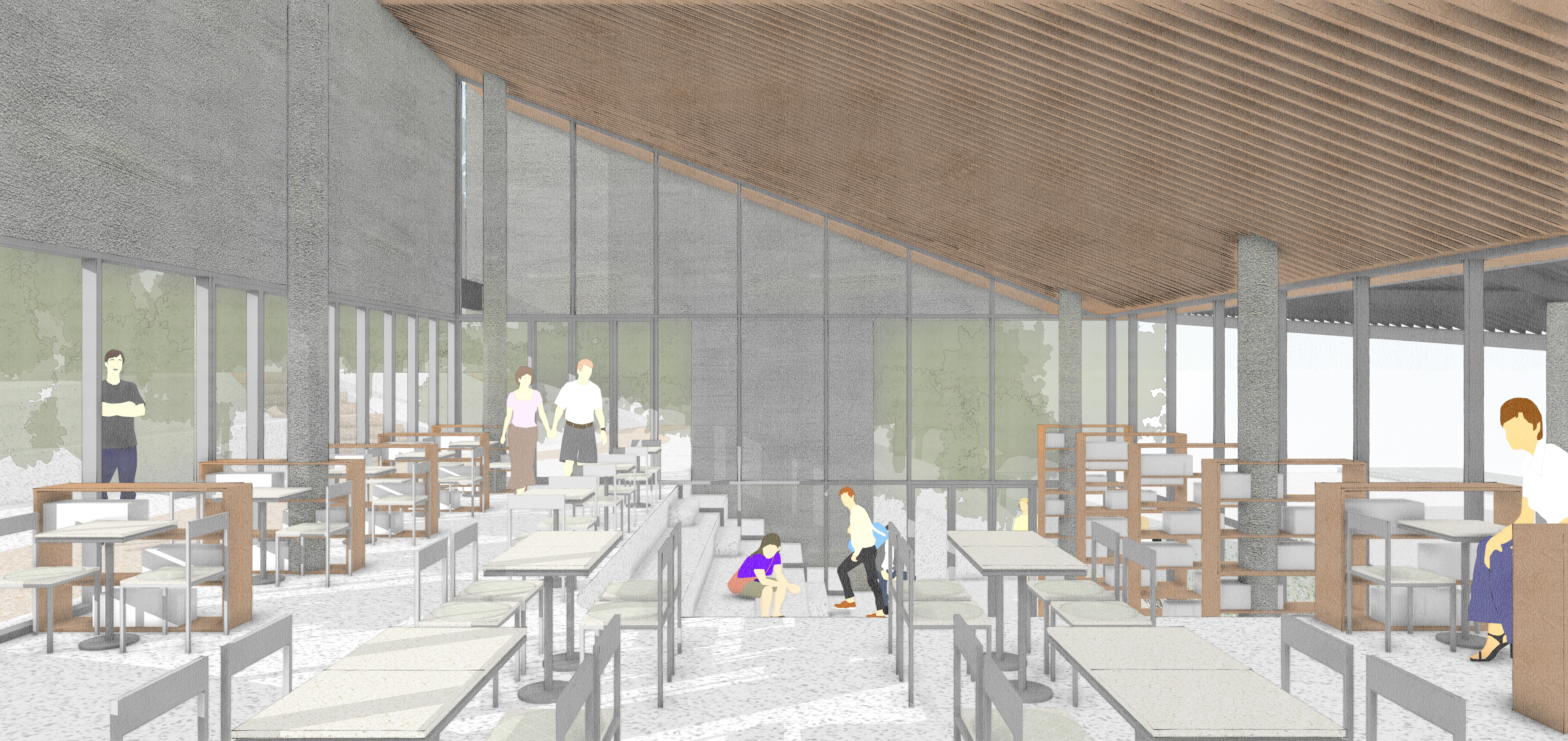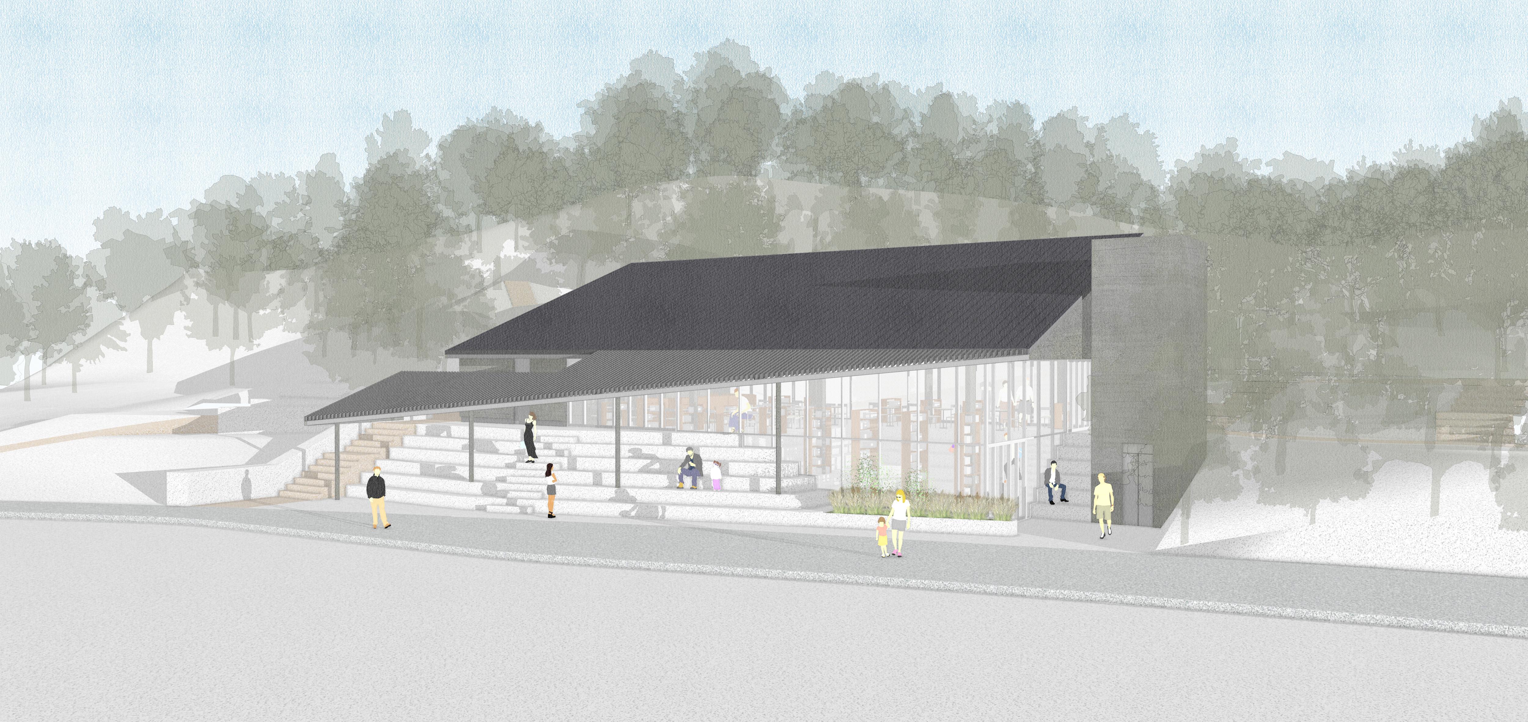 도시에서 숲으로 향하는 진입의 시퀀스Sequence를 제안한다. 땅의 흐름을 흡수하여 흐르는 지붕의 선은 숲의 내면으로 방문객을 안내하는 시각적 이정표가 된다. 도시의 소란함을 뒤로하고 자연의 호흡으로 진입하는 첫 번째 감각적 통로이다.