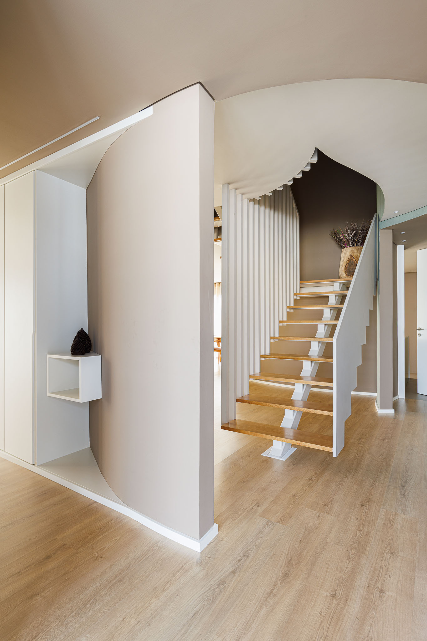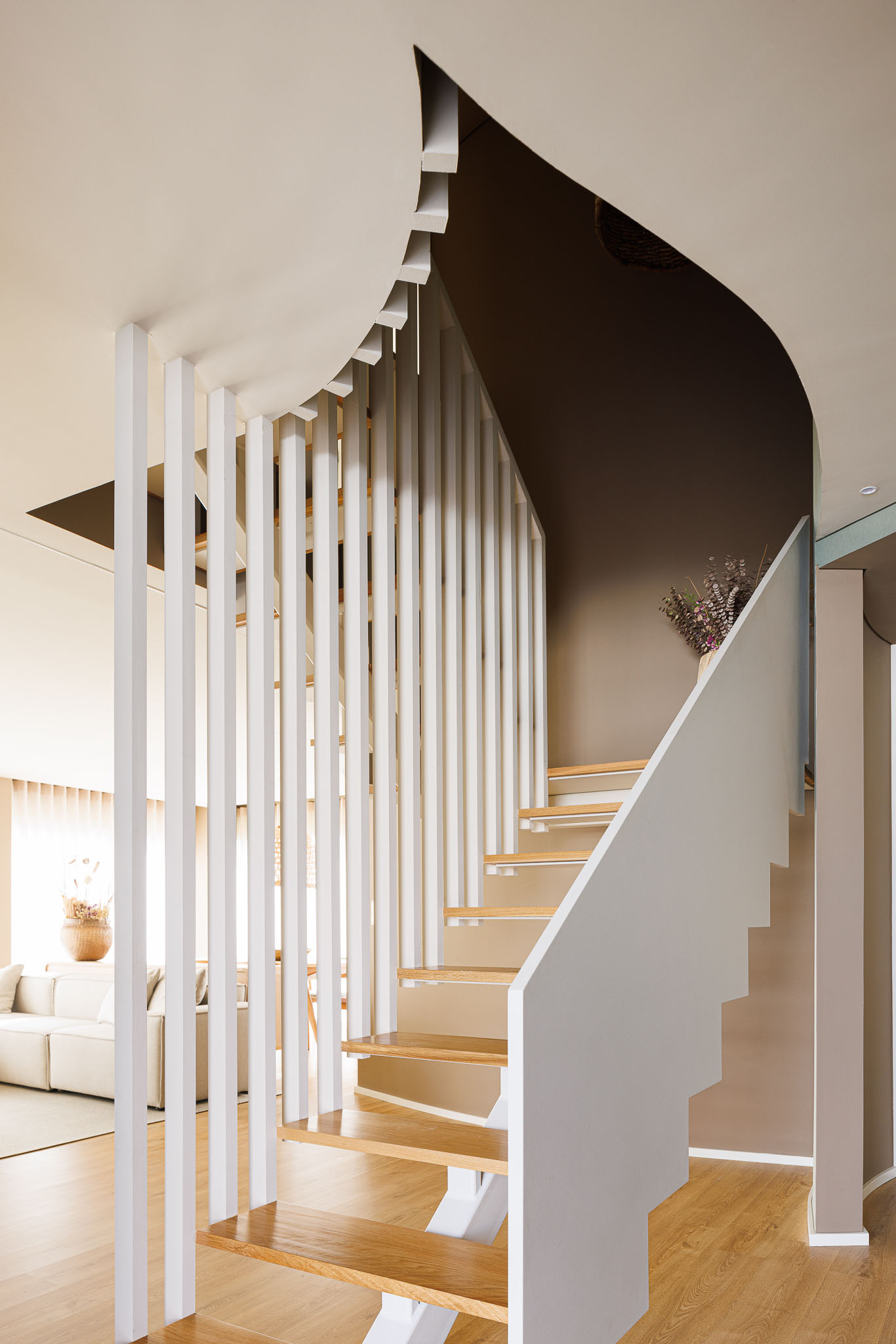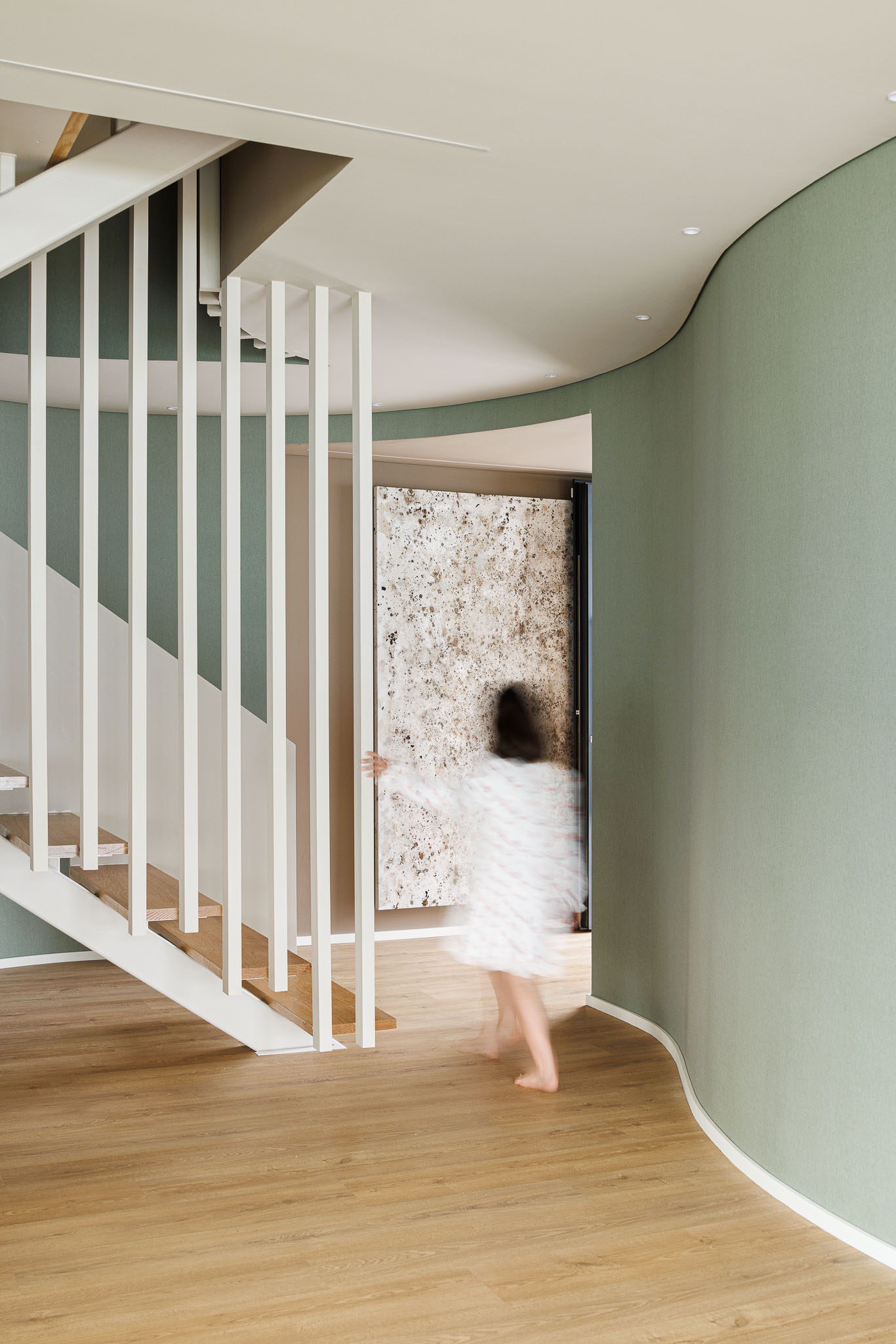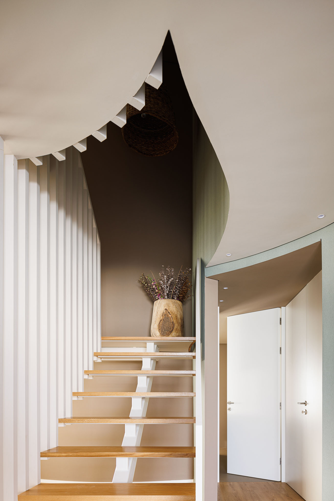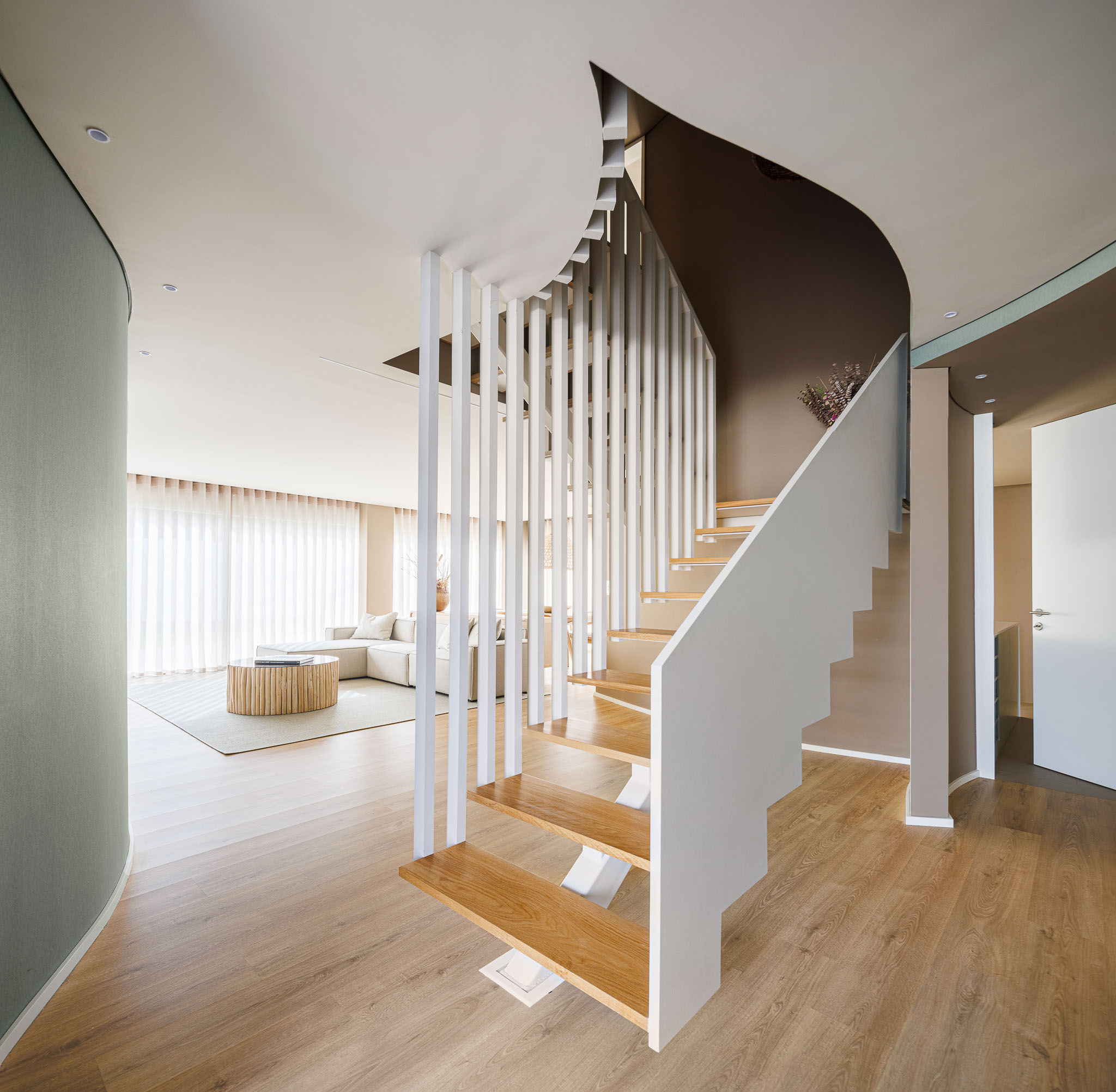 내부에서는 곡선 벽이 동선을 이끈다. 이 벽은 때로는 공간을 나누고, 때로는 연결한다. 시각적으로는 열린 상태를 유지하면서도, 기능적으로는 각 영역의 자율성을 확보한다. 오픈 플랜 개념을 유지하되, 공간마다 고유한 분위기가 형성된다. 계단은 이 집의 심장이다. 상·하층을 연결하는 수직 동선은 곡선 벽과 함께 연속성을 만든다.