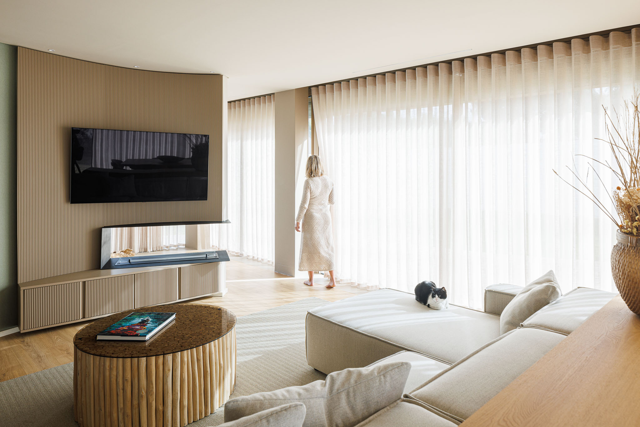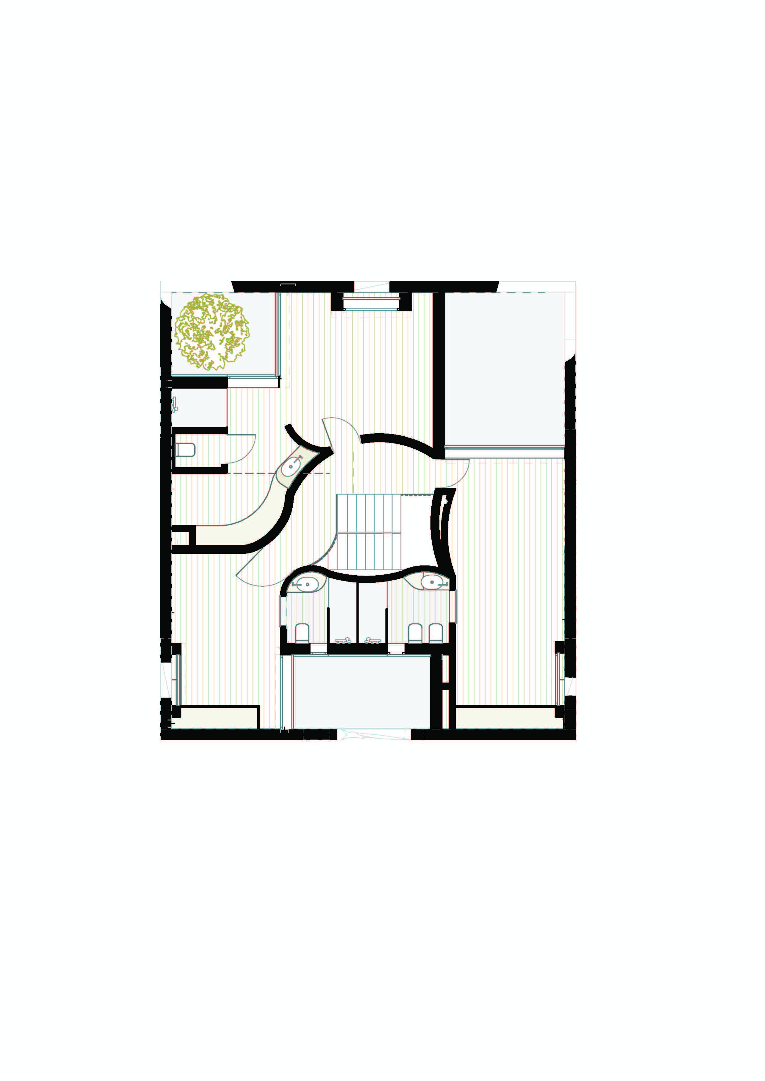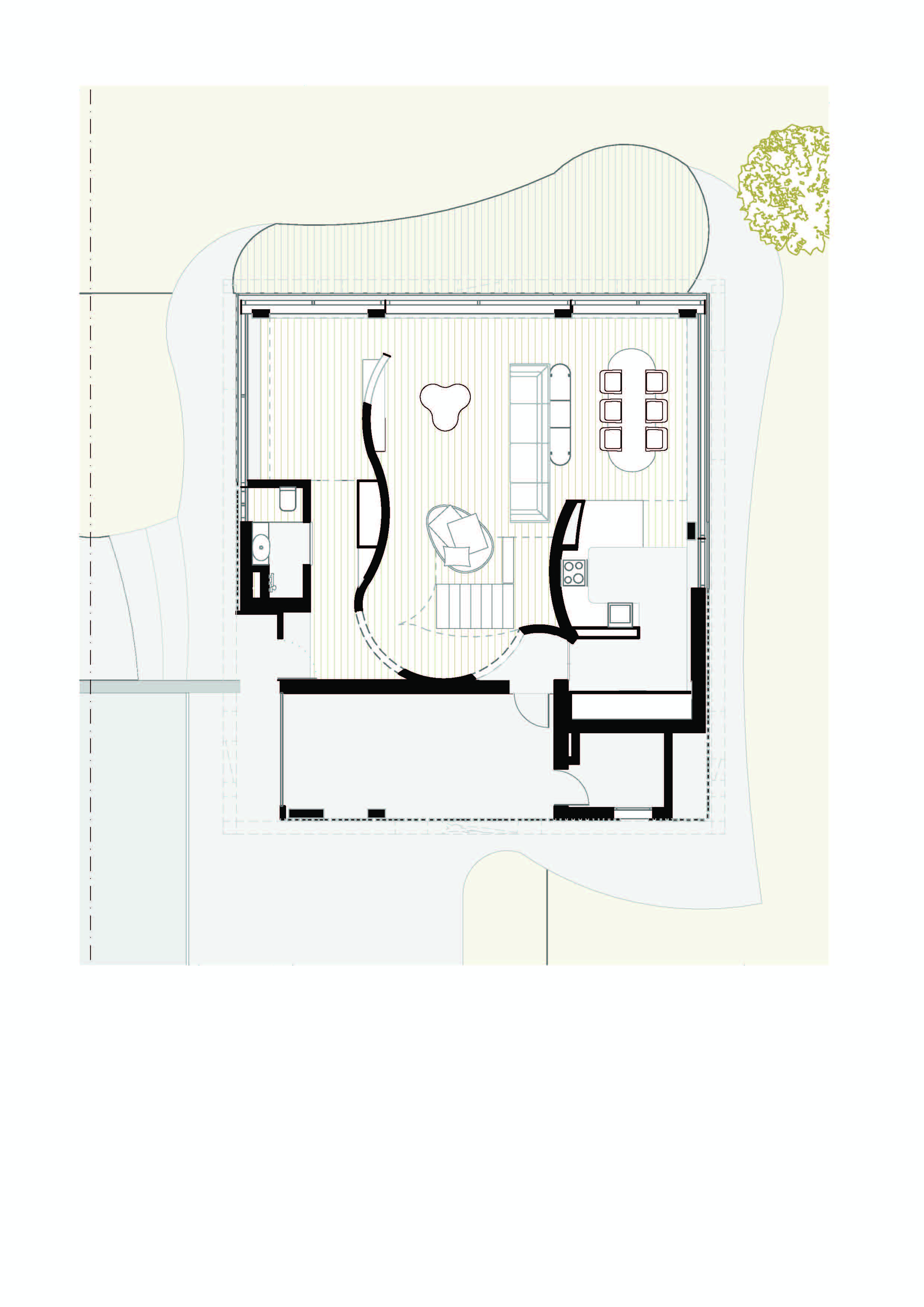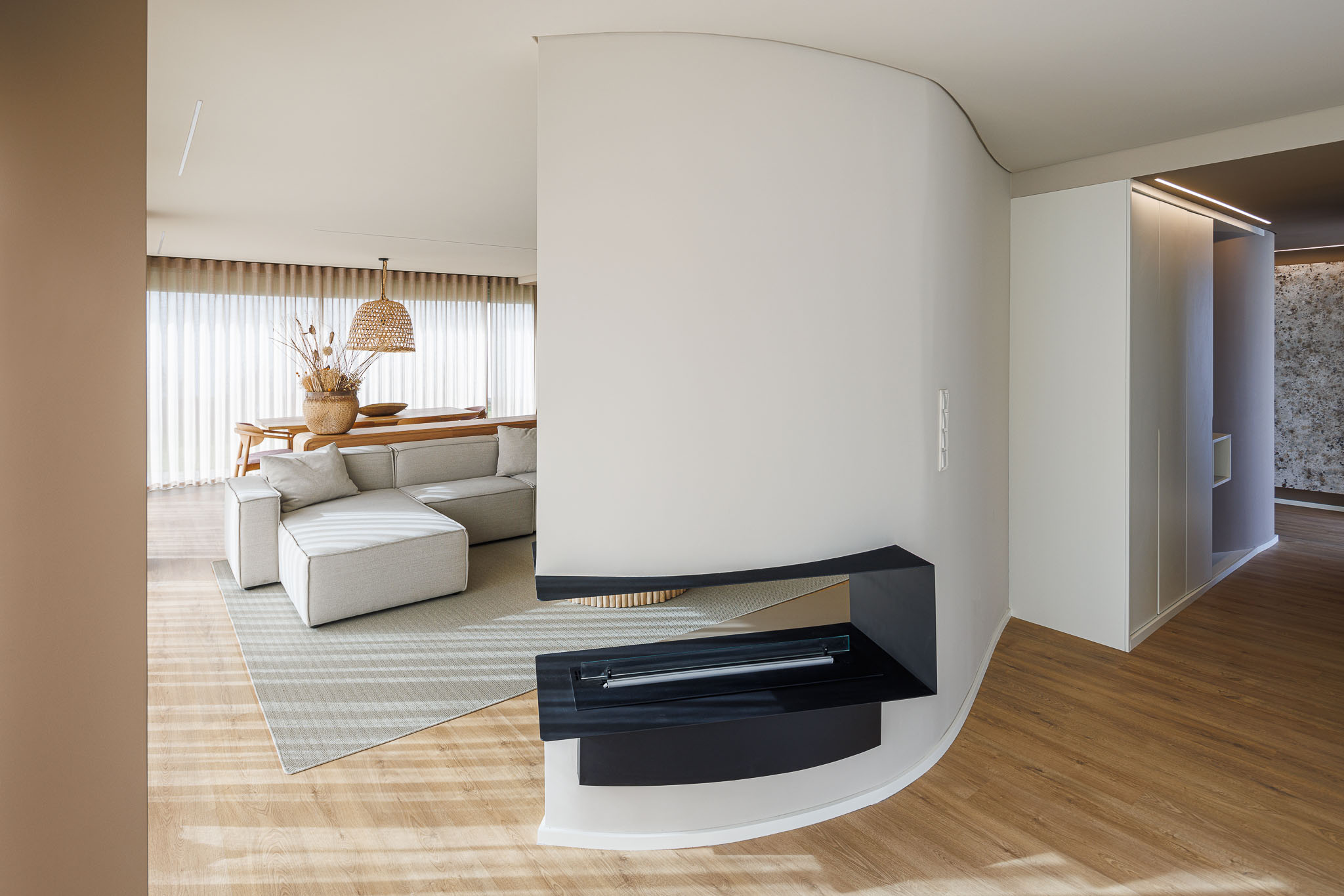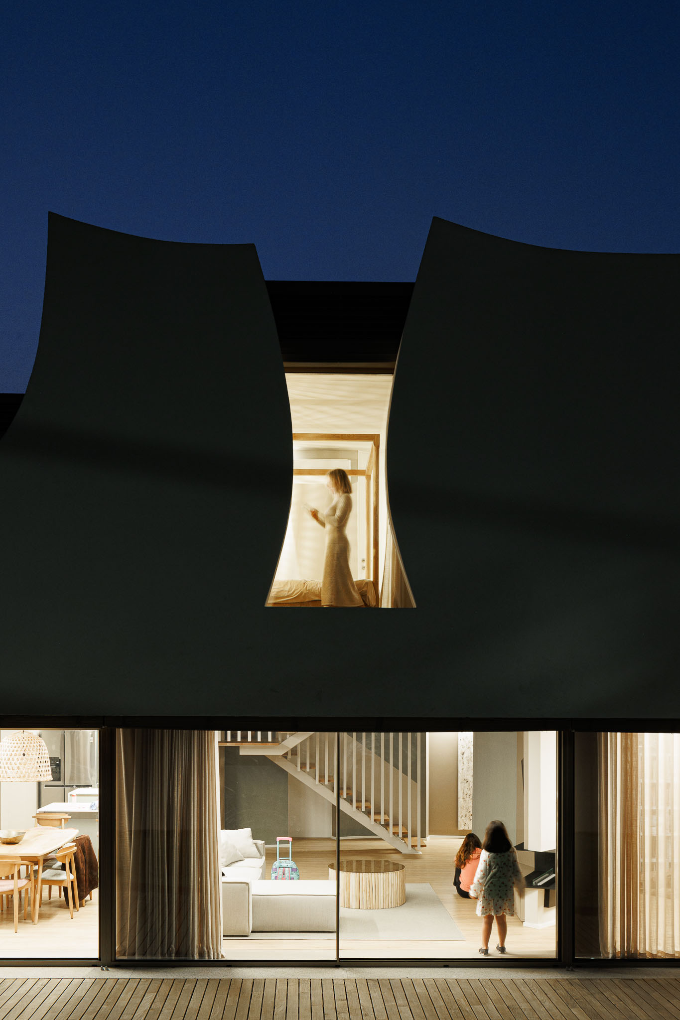 내부에서는 곡선 벽이 동선을 이끈다. 이 벽은 때로는 공간을 나누고, 때로는 연결한다. 시각적으로는 열린 상태를 유지하면서도, 기능적으로는 각 영역의 자율성을 확보한다. 오픈 플랜 개념을 유지하되, 공간마다 고유한 분위기가 형성된다. 계단은 이 집의 심장이다. 상·하층을 연결하는 수직 동선은 곡선 벽과 함께 연속성을 만든다.