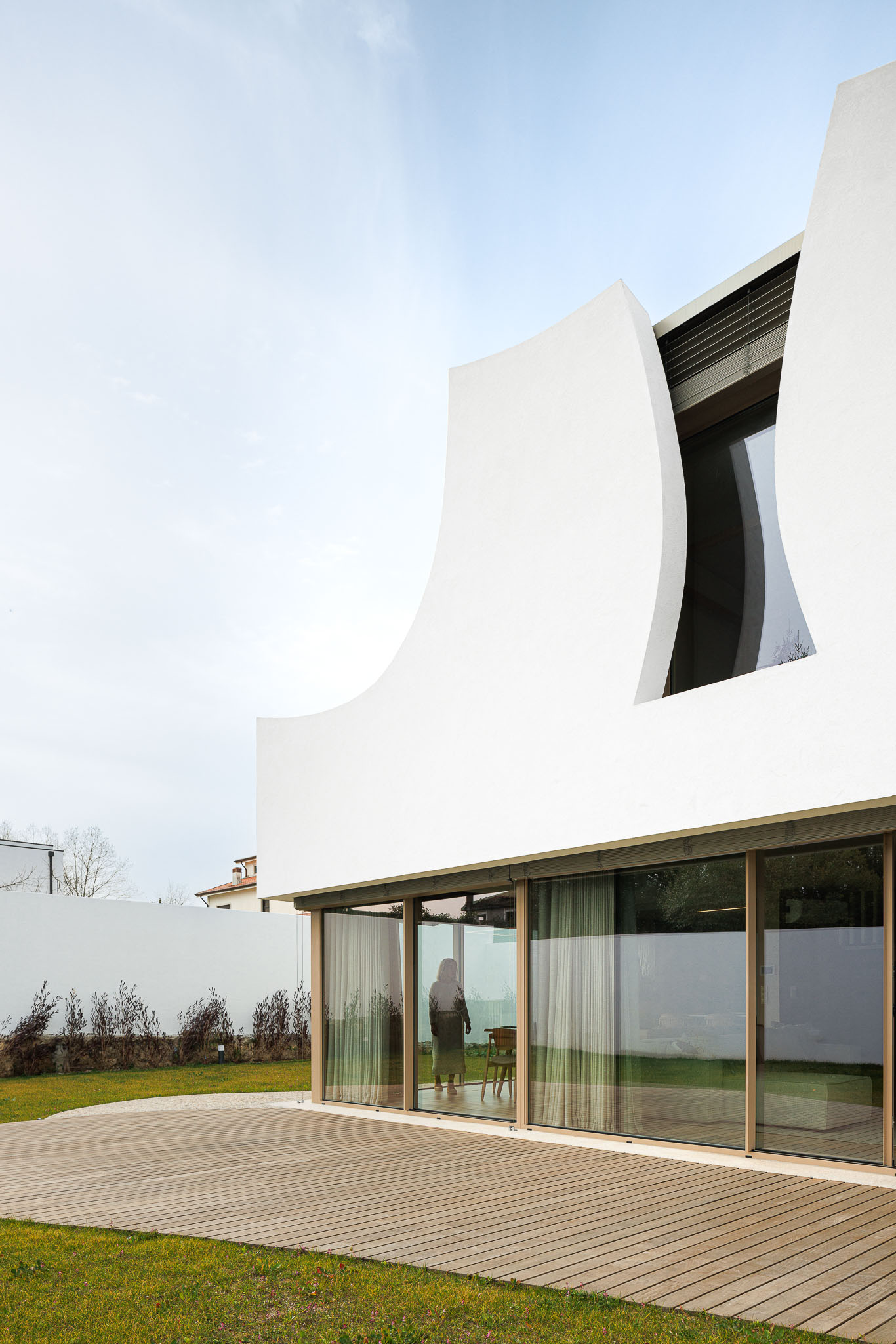 프로젝트의 개념은 명확하다. 꽃이 햇빛을 받으며 보호받듯, 이 집 역시 빛과 그림자 사이에서 스스로를 조절한다. 1층은 커다란 U자형 유리 입면으로 구성되며, 백색의 상부 볼륨이 그 위에 가볍게 내려앉는다. 구조적 역할을 수행하는 내부의 곡선 벽과 계단은 집의 중심을 형성한다. 이 벽은 단순한 구조체가 아니라, 공간을 조직하는 장치이다.