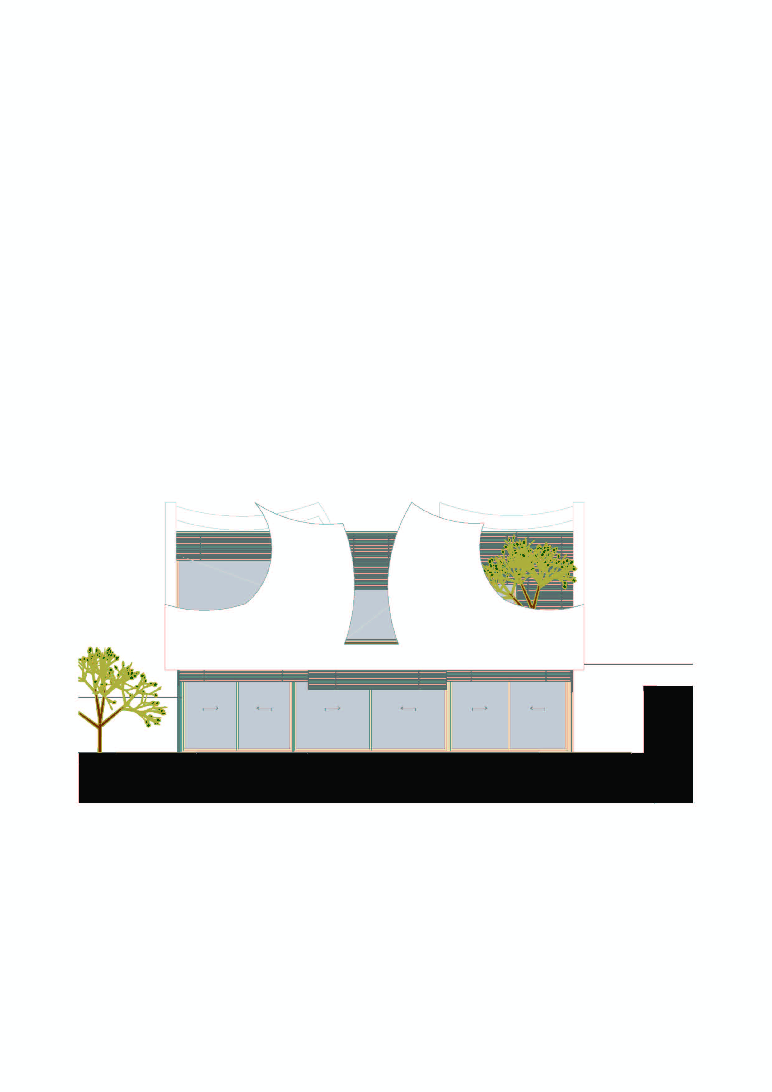 상층부는 꽃잎을 연상시키는 백색 매스로 구성된다. 유기적으로 휘어지는 곡선의 흐름 속에서 개구부와 파티오가 드러난다. 설계는 세 가지 재료로 표현을 제한한다. 화이트, 알루미늄, 유리. 재료의 절제가 오히려 형태의 존재감을 강화한다. 꽃잎은 재료의 대비 속에서 더 또렷해진다.