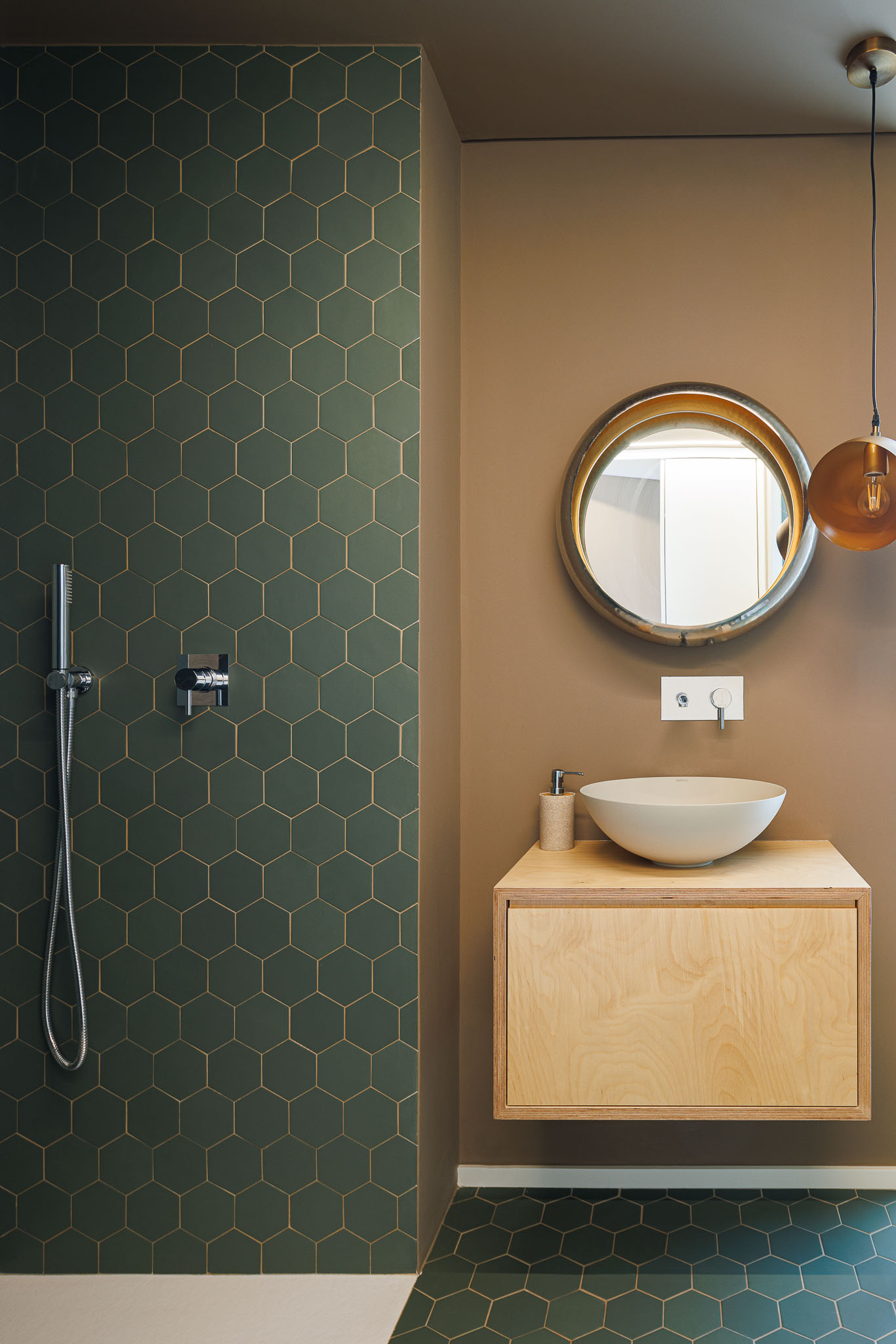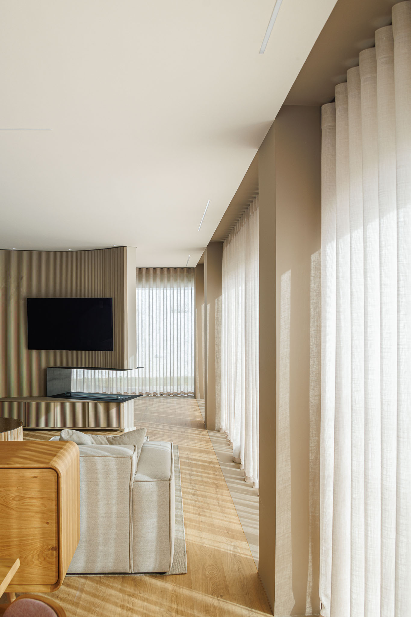 인테리어는 건축적 개념을 연장한다. 파스텔과 크루 톤의 팔레트가 사용되며, 자연 소재와 중성 색조의 가구가 공간의 평온함을 강화한다. 대나무와 라탄 조명, 위커 소재의 오브제, 건조 플라워 등은 자연의 이미지를 반복한다. 때로는 ‘올드 골드’ 디테일이 삽입되어 공간에 긴장감을 더한다. 서비스 욕실에서 그 대비가 분명하게 드러난다.
