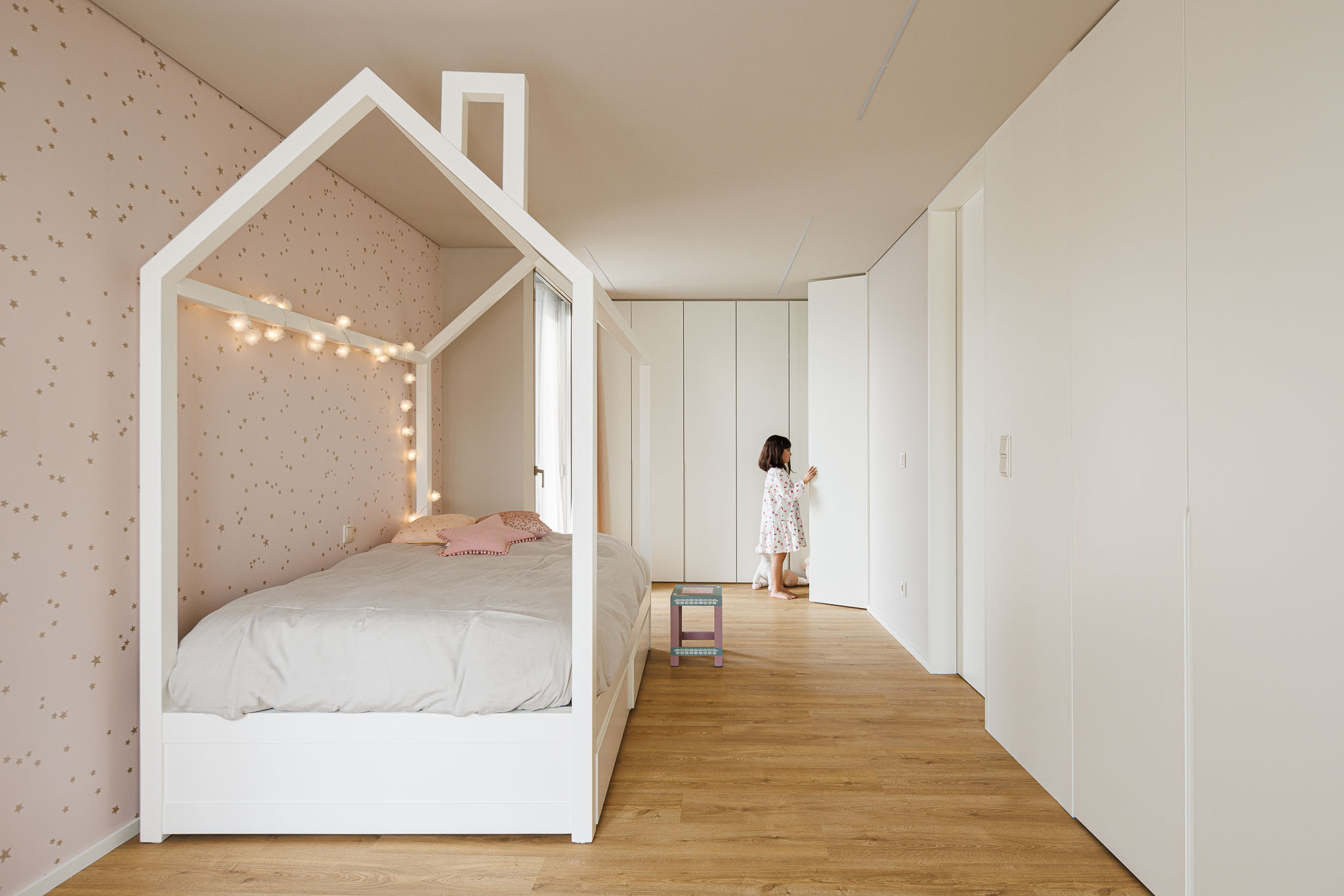 상층에는 세 개의 스위트룸이 배치된다. 각각은 자신만의 파티오와 직접 연결된다. 외부 공간은 단순한 채광 장치를 넘어, 꽃잎 사이에 형성된 보호된 안식처처럼 기능한다.