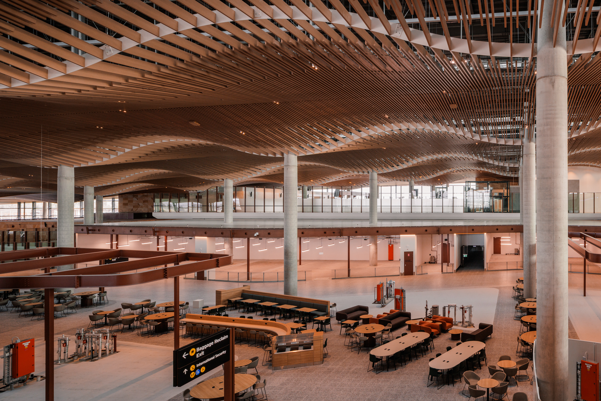 건축가는 컴벌랜드 평원의 광활한 수평선과 블루마운틴의 지형에서 영감을 얻었다. 부드러운 곡선과 수평적 형태는 주변 풍경을 반영하며, 천장 구조는 유칼립투스 나무 사이로 스며드는 빛의 움직임을 재해석했다.조형적 핵심은 대형 알루미늄 서스펜디드 천장이다. 약 188km 길이의 알루미늄 익스트루전 바텐이 물결 형태로 조립되었으며, 자연채광을 극대화하도록 설계되었다. 이 천장은 ‘Great Australian Light’를 공간 경험의 중심 요소로 삼는다. 빛이 여과되며 사람들의 이동, 방향 인지, 감정의 상태까지 조율한다.
