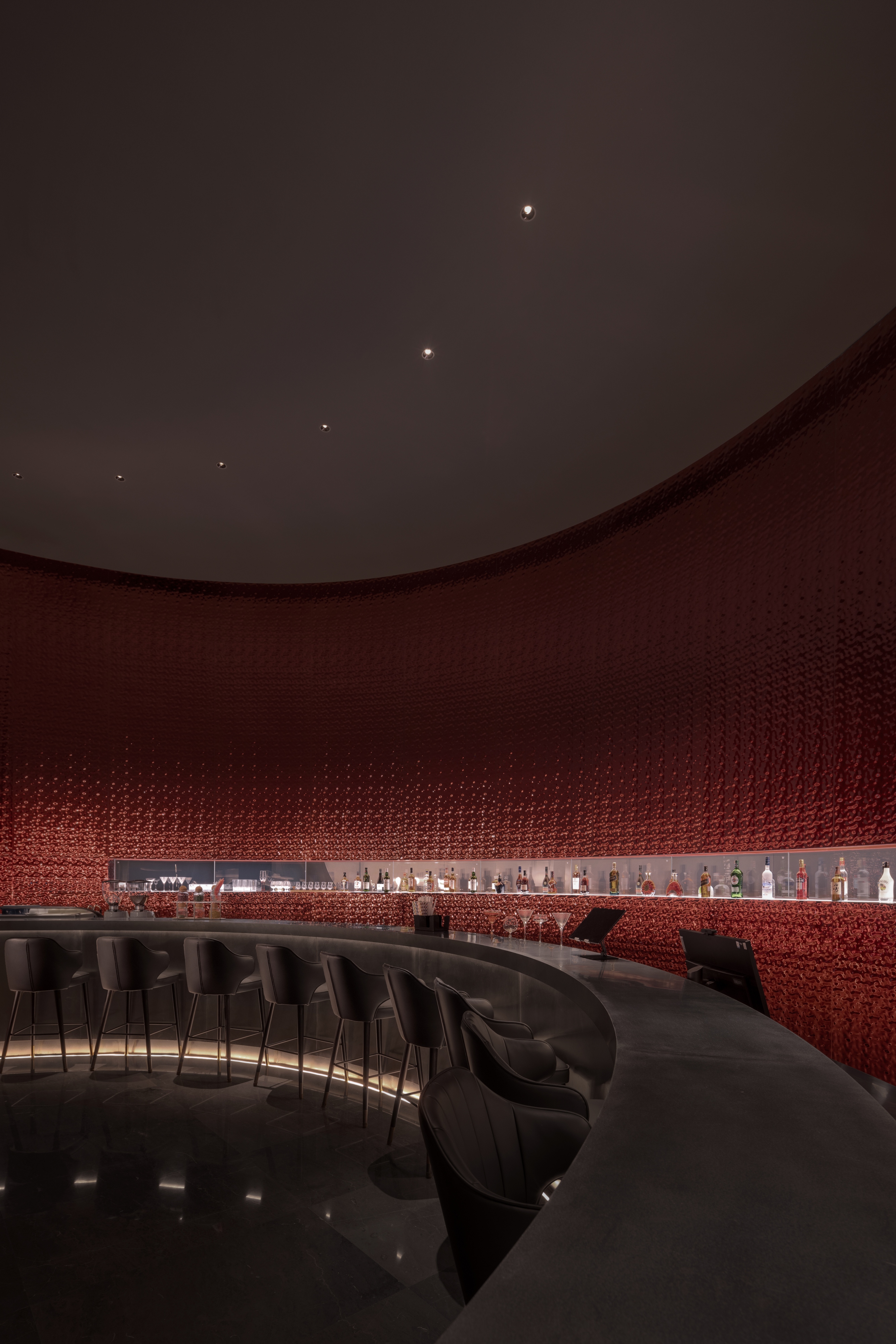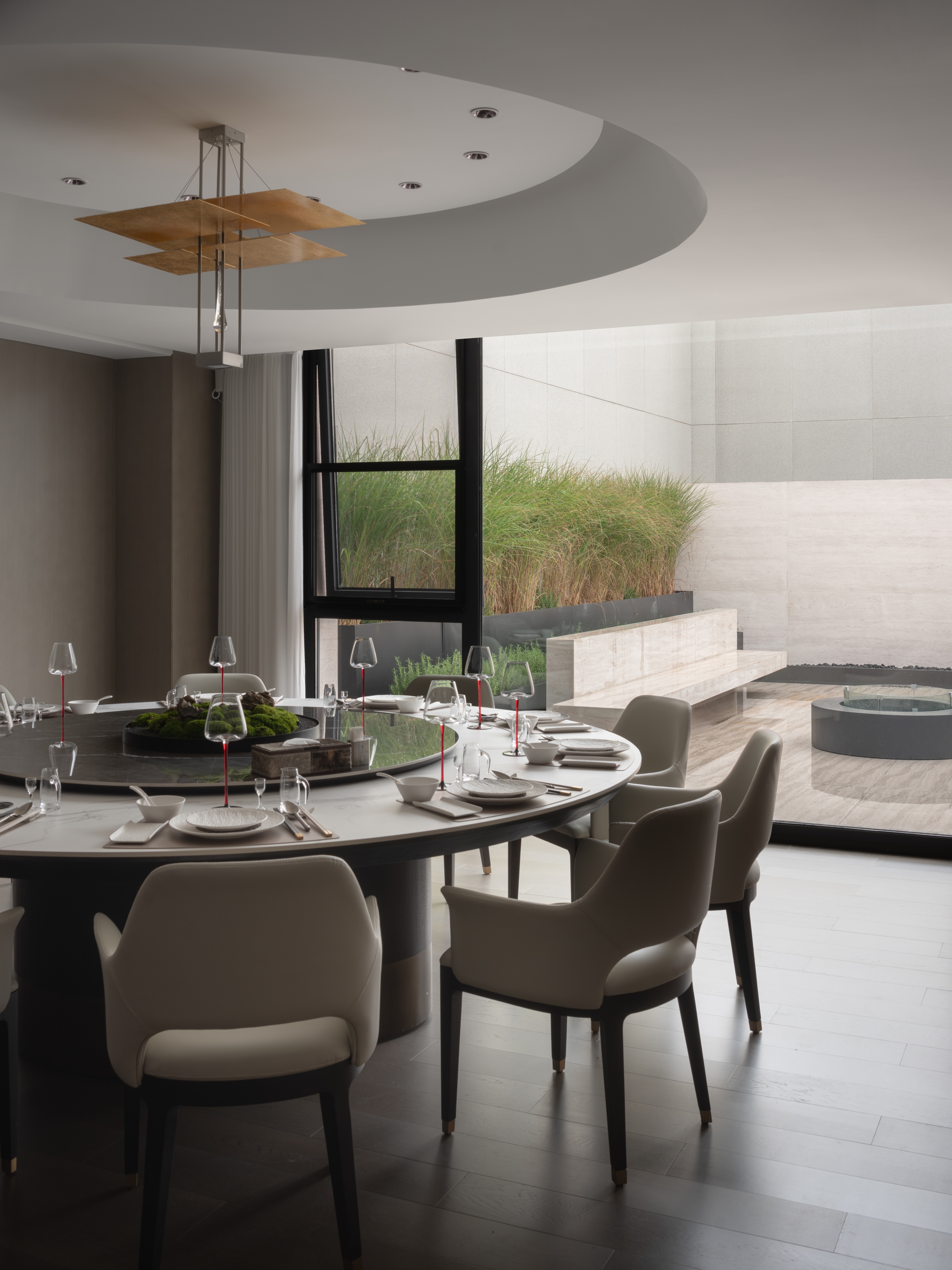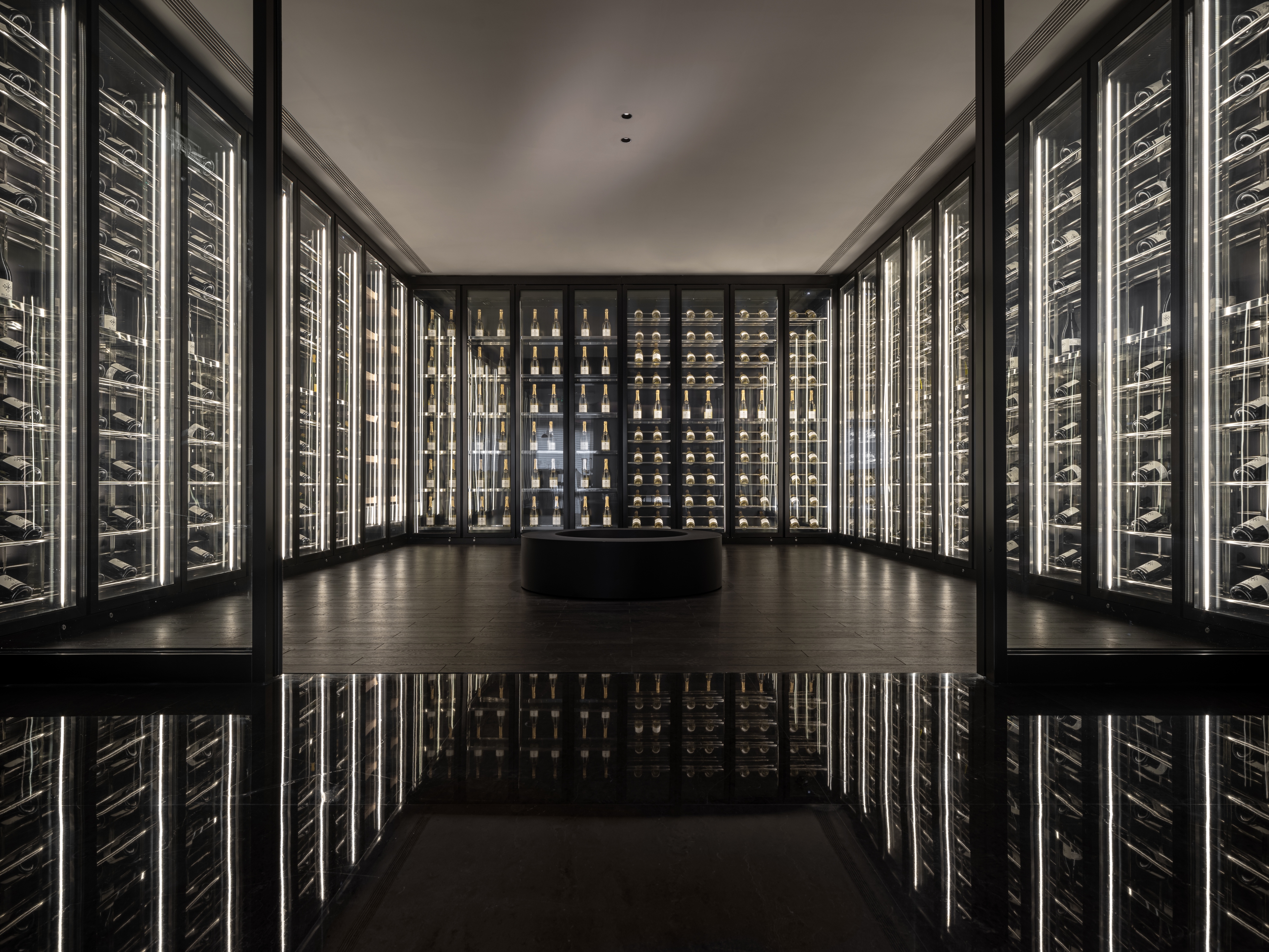 레스토랑과 바 공간은 동양적 의례 문화를 현대적으로 재해석한다. 원형과 사각의 구성은 ‘천원지방’의 우주관을 상징하며, 와인 캐비닛과 수평적으로 확장된 바는 곡수(曲水)의 흐름을 암시한다. 시각, 청각, 후각, 미각이 단계적으로 확장되며 하나의 감각적 동선이 완성된다.