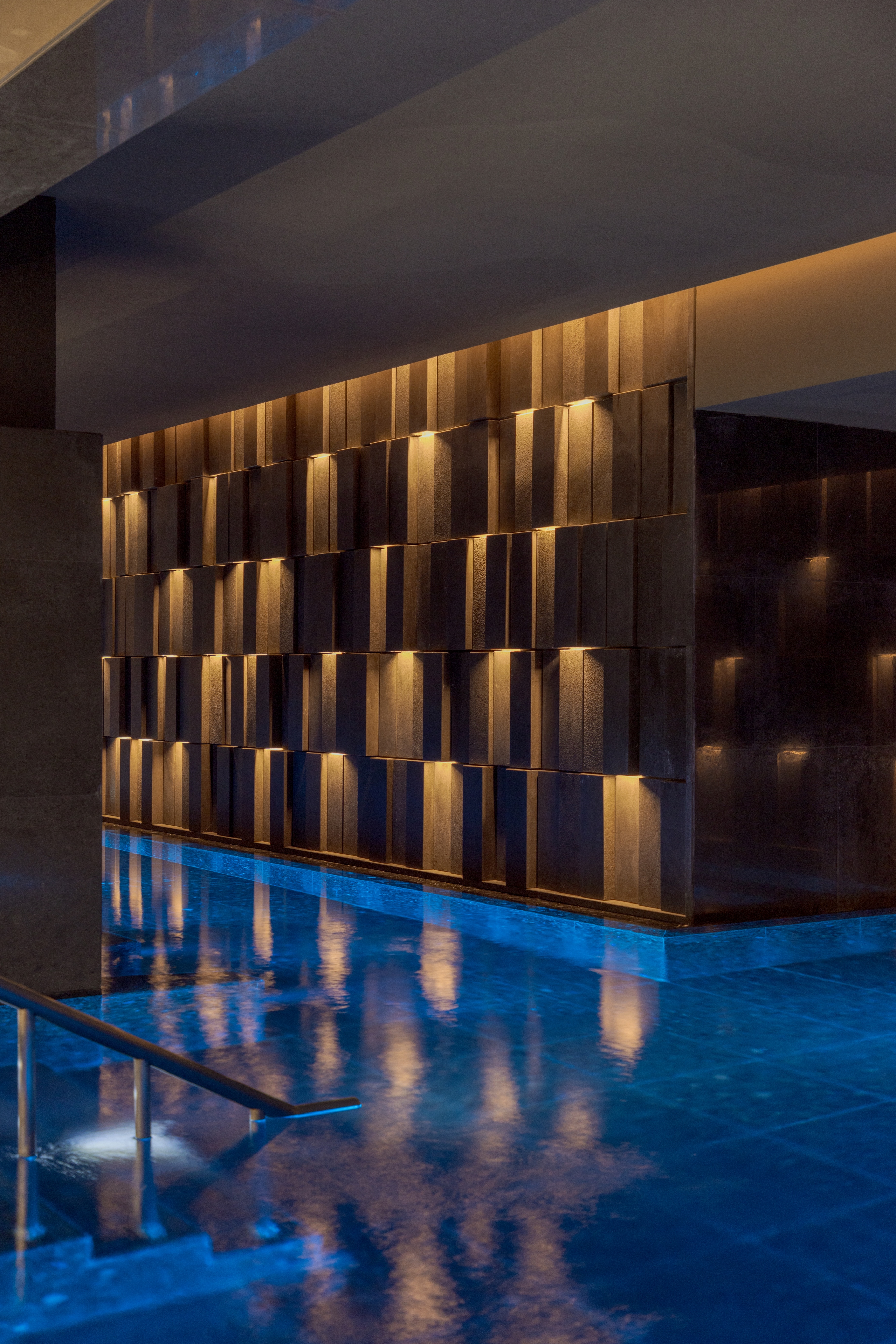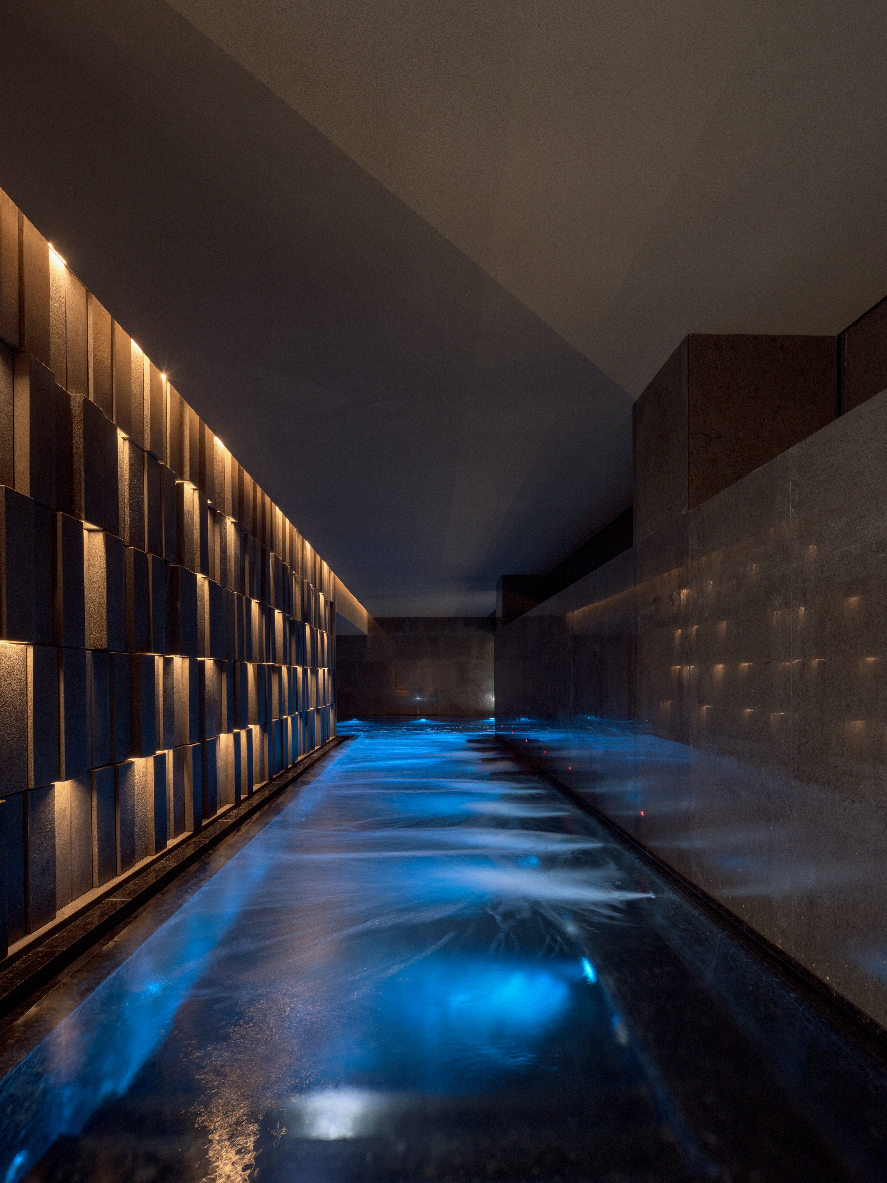 스파 공간은 자연을 모티프로 구성됐다. 물소리와 조명, 재료의 질감이 결합되며 감각을 자극한다. 암석과 폭포를 추상화한 공간 안에서 은은한 청색 조명이 깊이를 더하고, 수증기가 부드럽게 퍼지며 몰입감을 형성한다. 전통적인 도가적·선적 치유 개념과 현대 스파 기술을 결합해, 건축·조명·프로그램이 통합된 웰니스 환경을 구현했다.