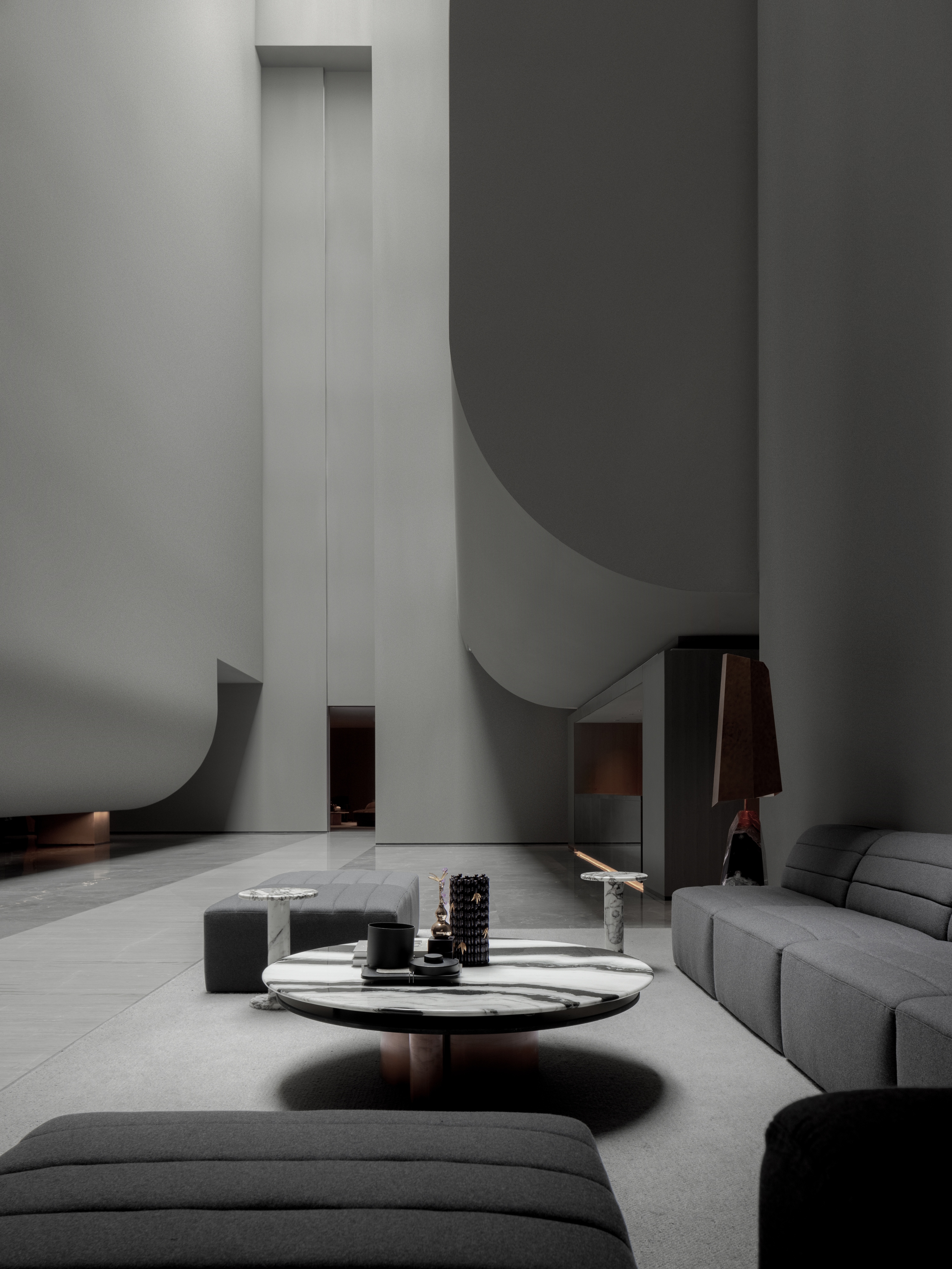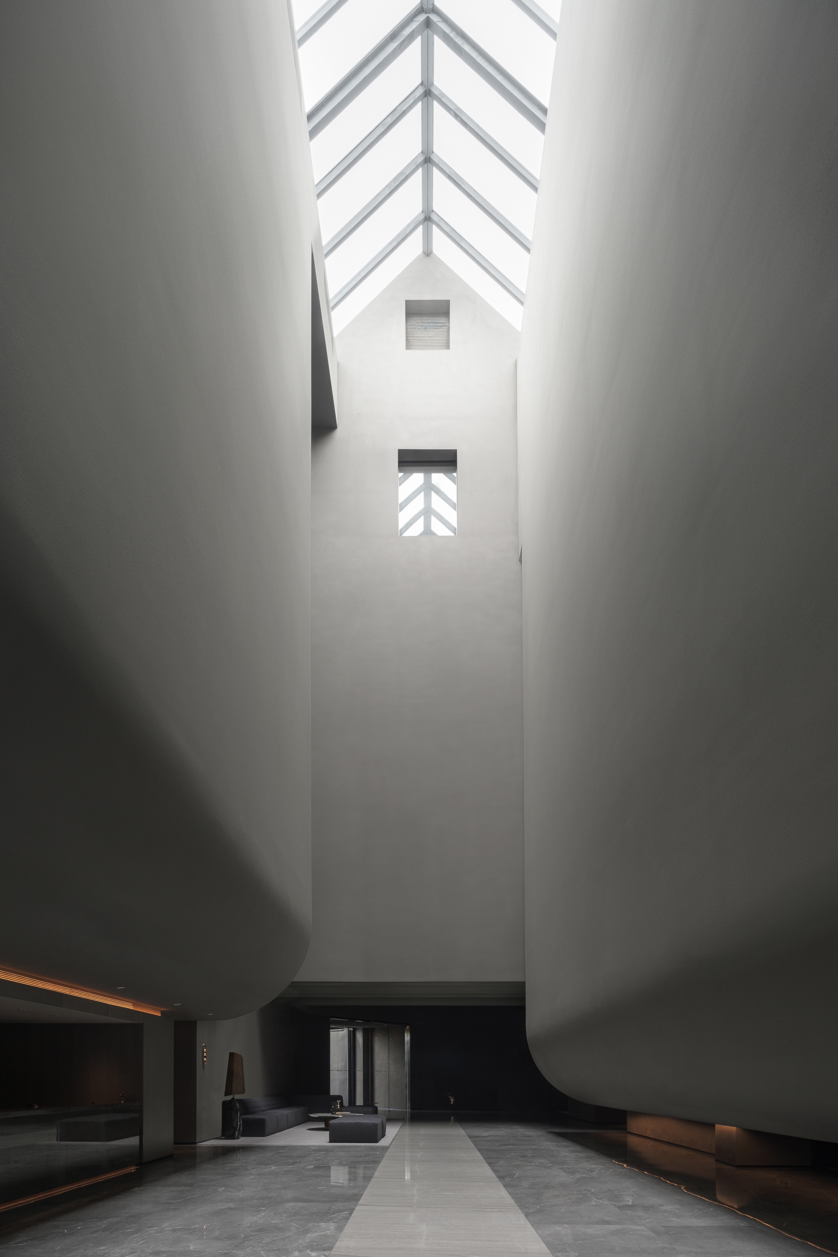 로비는 협곡을 연상시키는 수직적 공간으로 계획됐다. 상부 천창을 통해 유입되는 자연광은 벽체를 따라 흐르며 공간에 깊이를 만든다. 거대한 벽면은 폭포처럼 떨어지거나 두루마리처럼 펼쳐지며, 건축적 장면을 연출한다. 이러한 장면 전개는 단순한 장식이 아닌 ‘도시 속 미시적 휴양’이라는 개념을 공간적으로 실현하는 장치다.