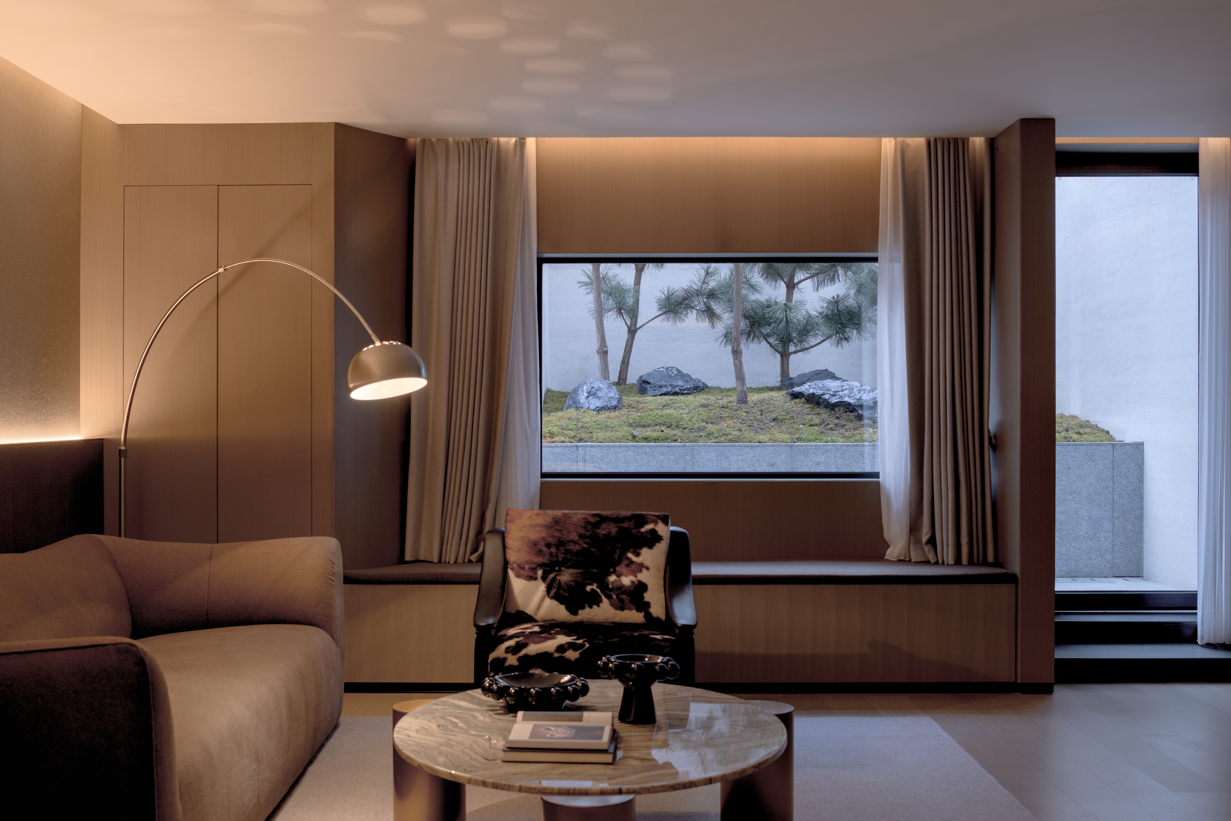 객실은 중앙 대칭 회랑을 따라 배치되며, 질서와 프라이버시를 동시에 확보한다. 일부 객실은 선큰 구조를 도입해 시각적 깊이를 확보하고, 프레임처럼 구성된 중정 풍경을 통해 정적인 사색의 장면을 제공한다.