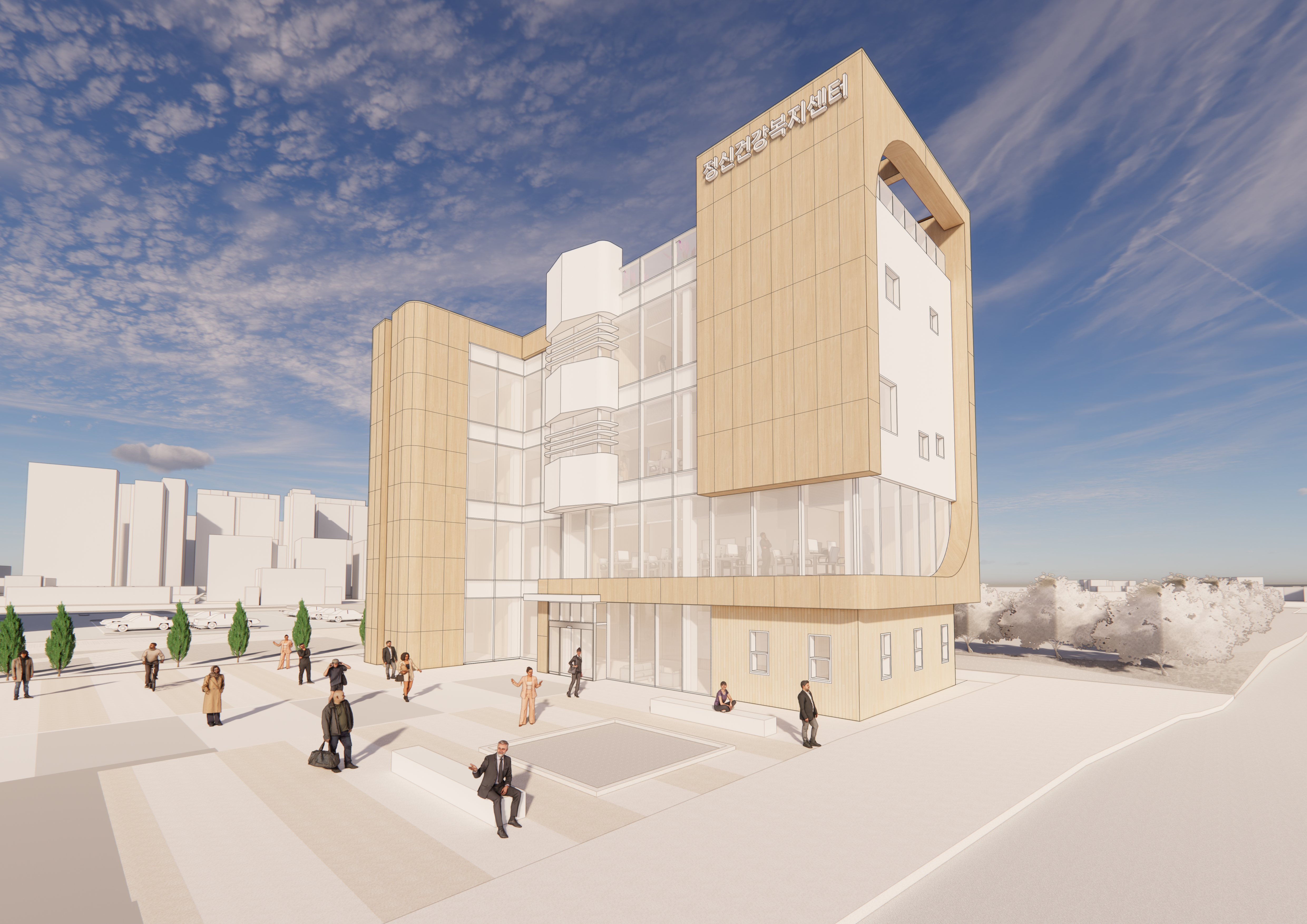 치매안심센터와 다목적체육관 사이로 펼쳐진 나지막한 대지에 앉은 정신건강복지센터는 치유가 필요한 사람에게는 마음을 감싸는 따뜻한 공간이 되고, 시민을 위해 일하는 사람에게는 일상을 연결하는 공공 치유 플랫폼이 된다. 기존의 환경과 대지의 질서를 존중하면서도 정신건강복지센터만의 ‘따뜻한 포옹’을 전하는 정체성을 구현해 낼 수 있도록 고민하였다.