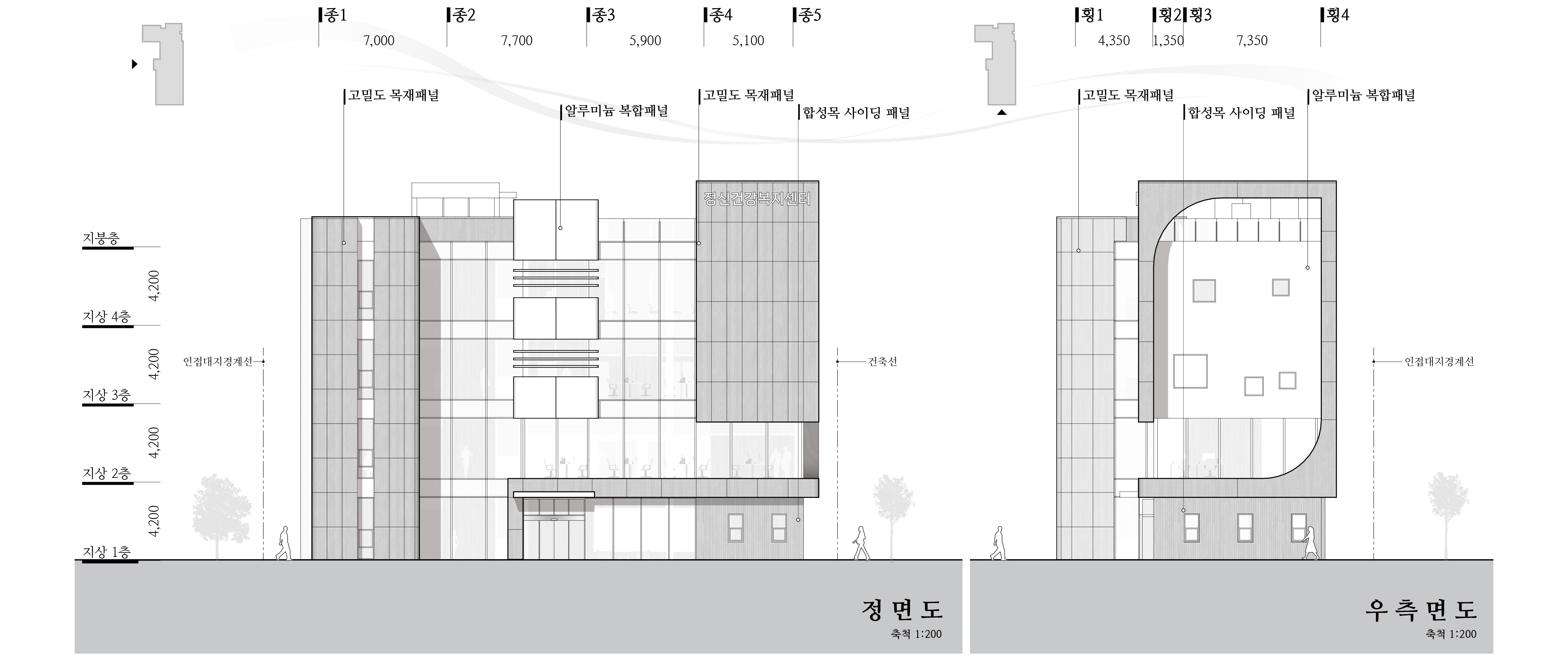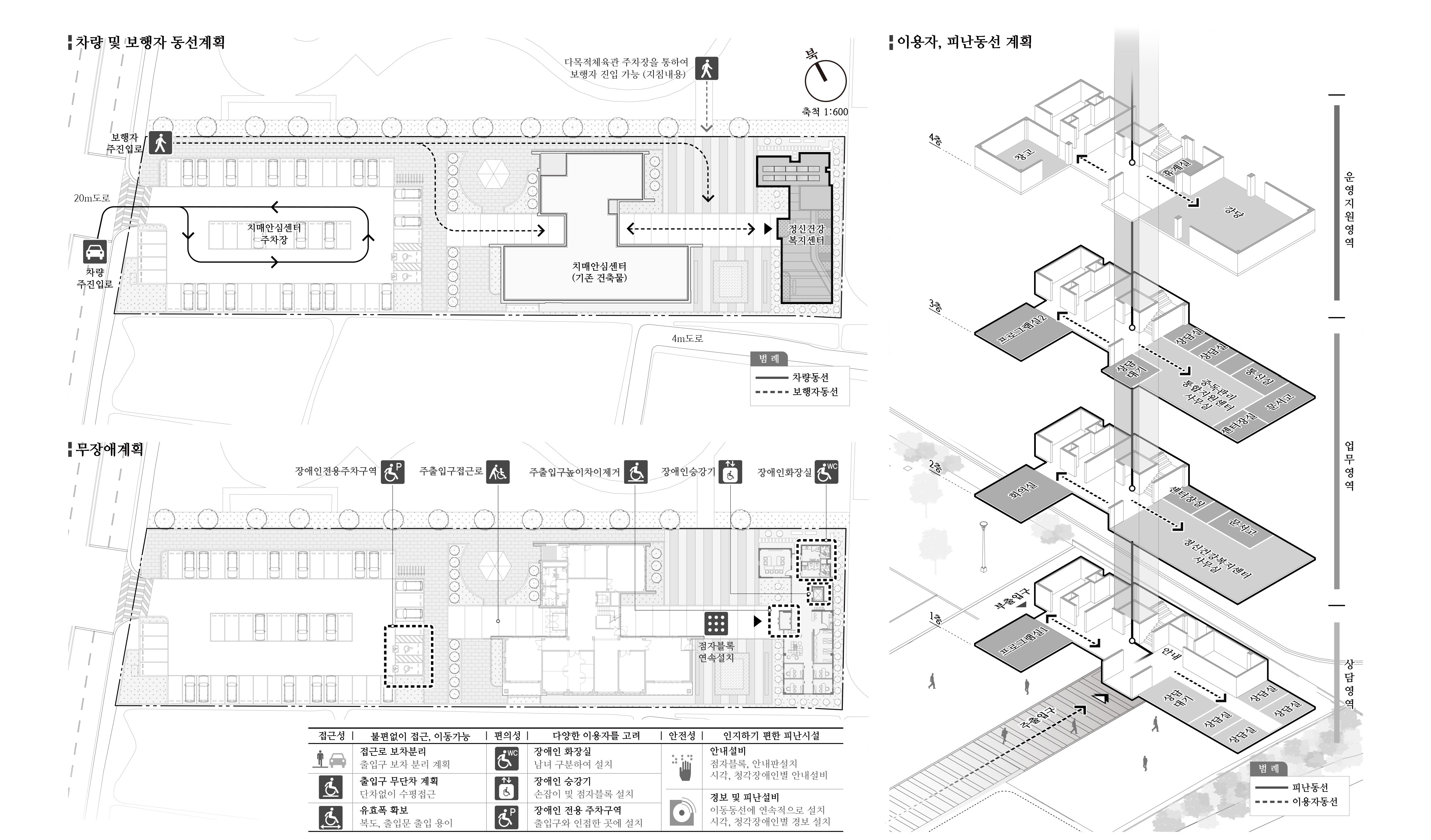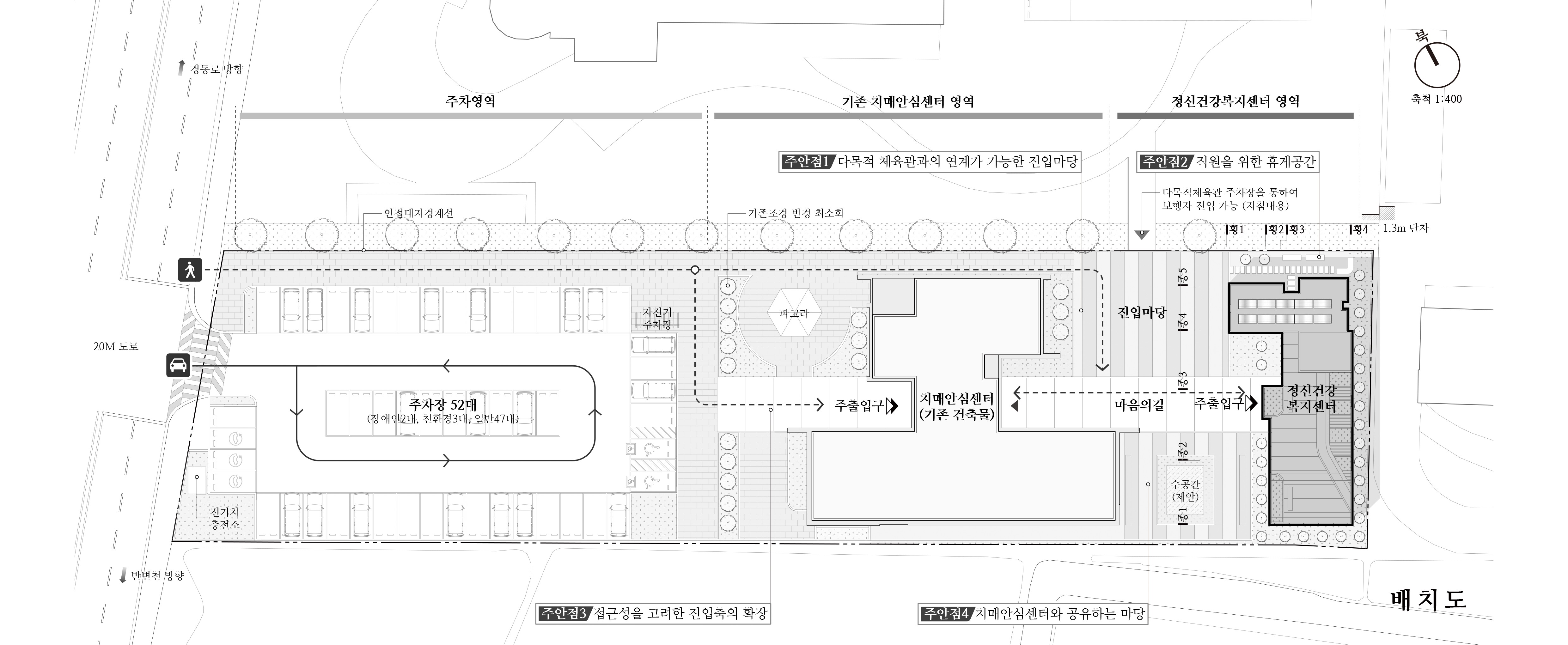 부지 내 기존 치매안심센터의 진입동선체계를 유지하는 동시에 확장하여 금회 정신건강복지센터까지 자연스럽게 스며들도록 하였다. 기존 질서를 품어 확장된 질서가 되도록 계획하였다.