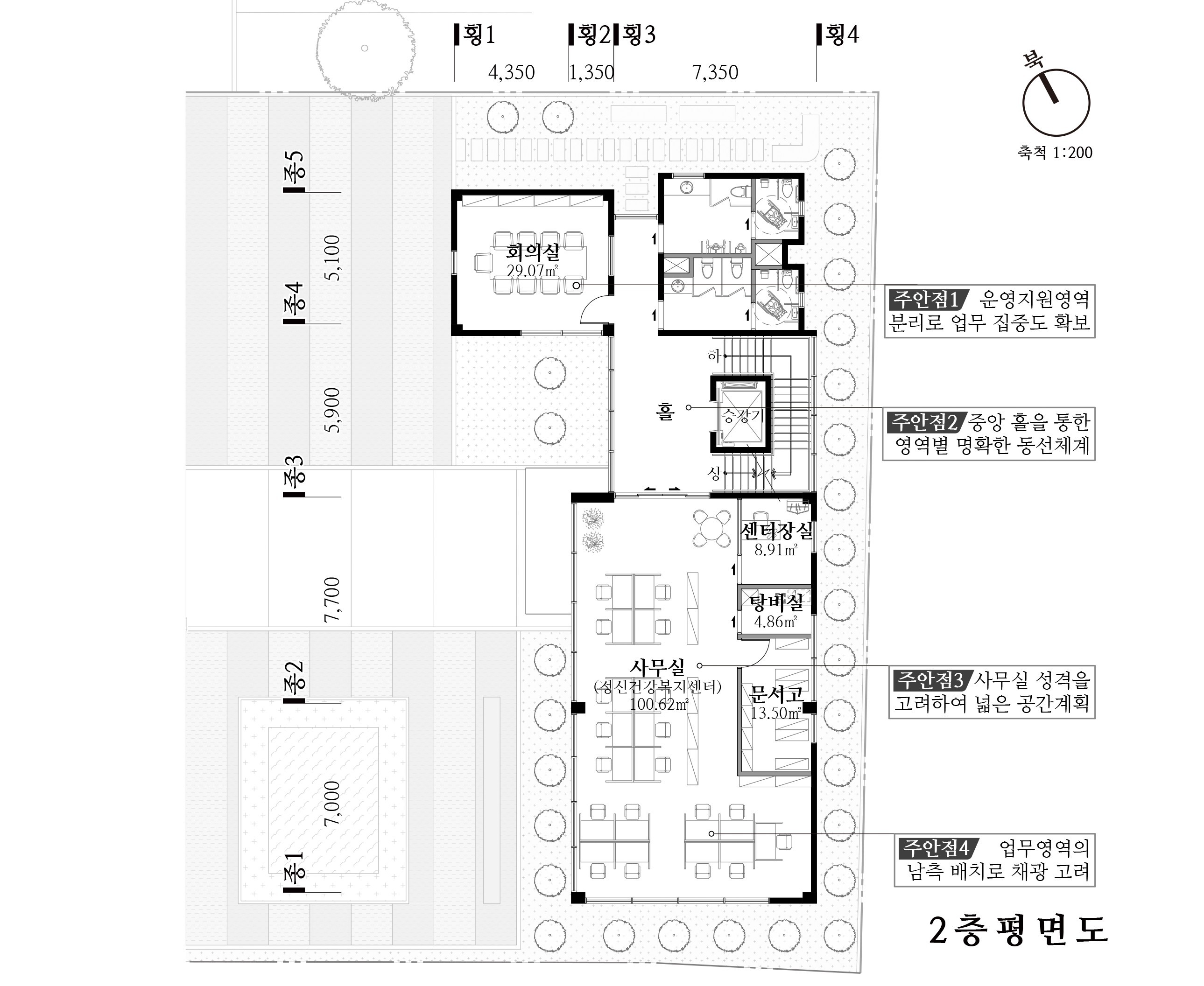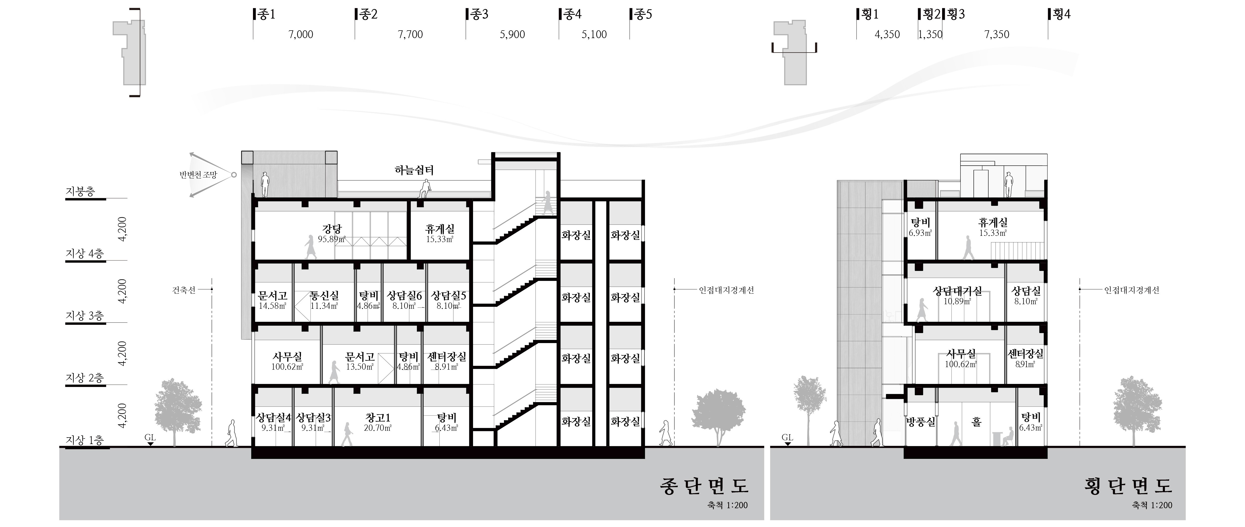상담영역은 저층부에, 업무영역은 중층부에 배치하여 이용자별 편의성을 고려하였고, 홀을 중심으로 운영지원영역과 업무영역의 기능적 독립성을 부여하였다. 명료한 코어 계획을 통해 제한된 건폐율 내 공공업무시설로서 공간 활용도를 극대화하였다.