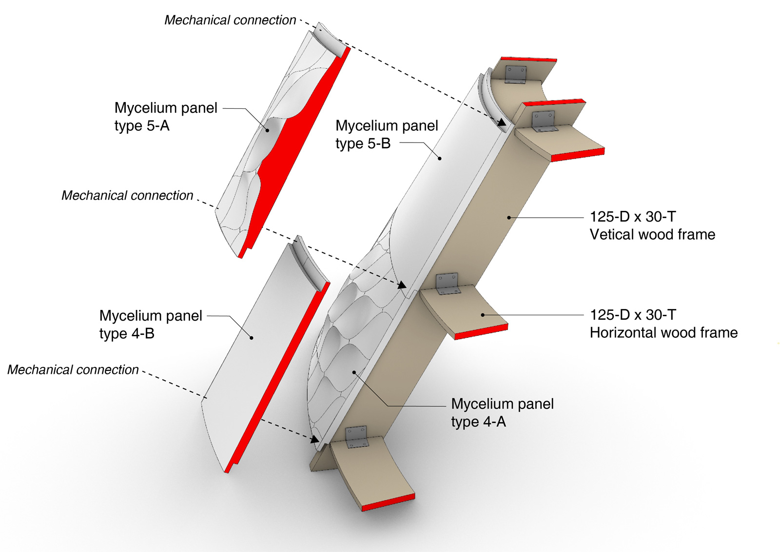 ‘균사재(Mycelial Hut)’는 생태계에서 필터 역할을 하는 버섯의 균사체를 건축에 접목한 실험적 프로젝트다. 균사체와 로봇 3D 프린팅 기술을 결합해 맞춤형 몰드를 제작하고, 이를 통해 대규모 시공 가능성을 탐색한다. 목재 프레임이 구조적 역할을 수행하는 생체 하이브리드 파빌리온으로 계획되었으며, 외피는 맞춤형 균사체 패널 시스템으로 구성된다.
