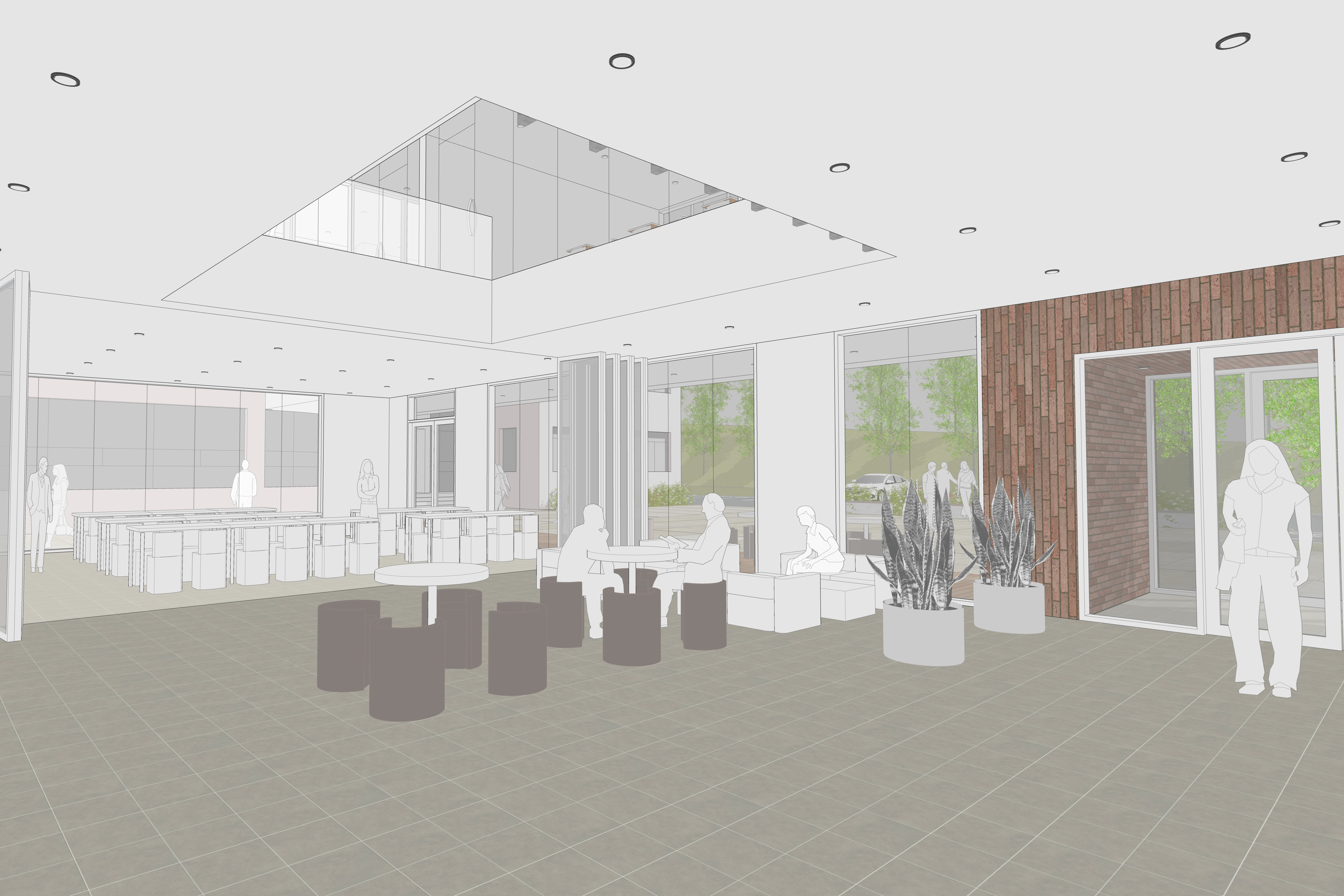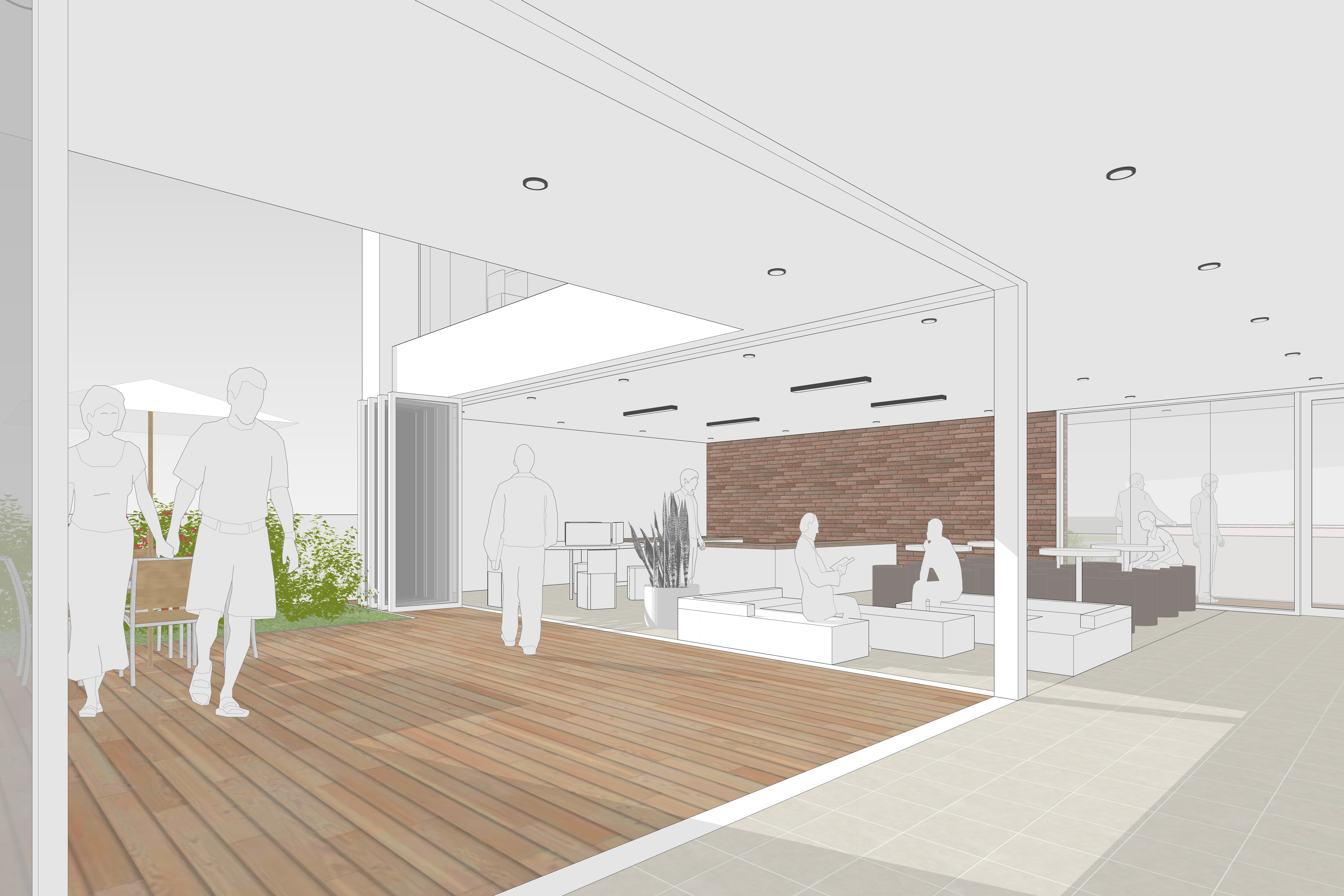 중심 보행가로를 따라 배치된 외부 공간들은 서로 마주보며 연속적인 장면을 형성하고, 평상시에는 내부 프로그램과 자연스럽게 연계되어 확장된 활동 영역으로 작동한다. 더불어 단지 내 입주 기업들의 휴게 및 행사 시에는 유연하게 대응하는 다목적 공간으로 활용되며, 다양한 커뮤니티 활동이 일상 속에서 자연스럽게 스며드는 열린 장소로 기능한다.