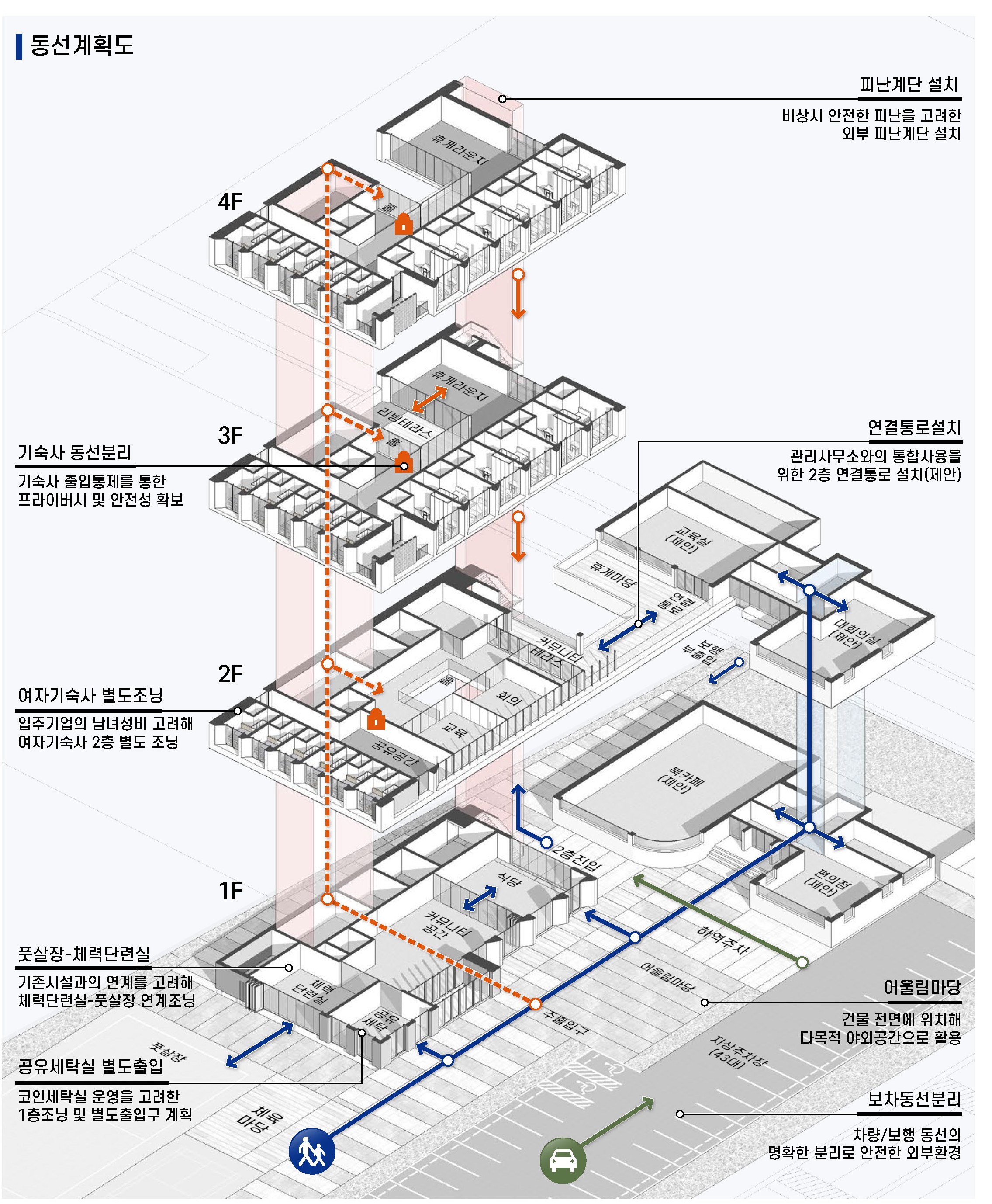 웰컴 플랫폼은 거주와 문화가 공존하는 복합 커뮤니티 공간으로, 기존 시설과의 유기적인 연결을 통해 자연스러운 교류를 유도한다. 교육·문화 프로그램과 외부 마당을 긴밀하게 엮어, 청년들이 머물고 소통하며 관계를 형성하는 단지 내 중심 거점으로 기능하도록 계획되었다.