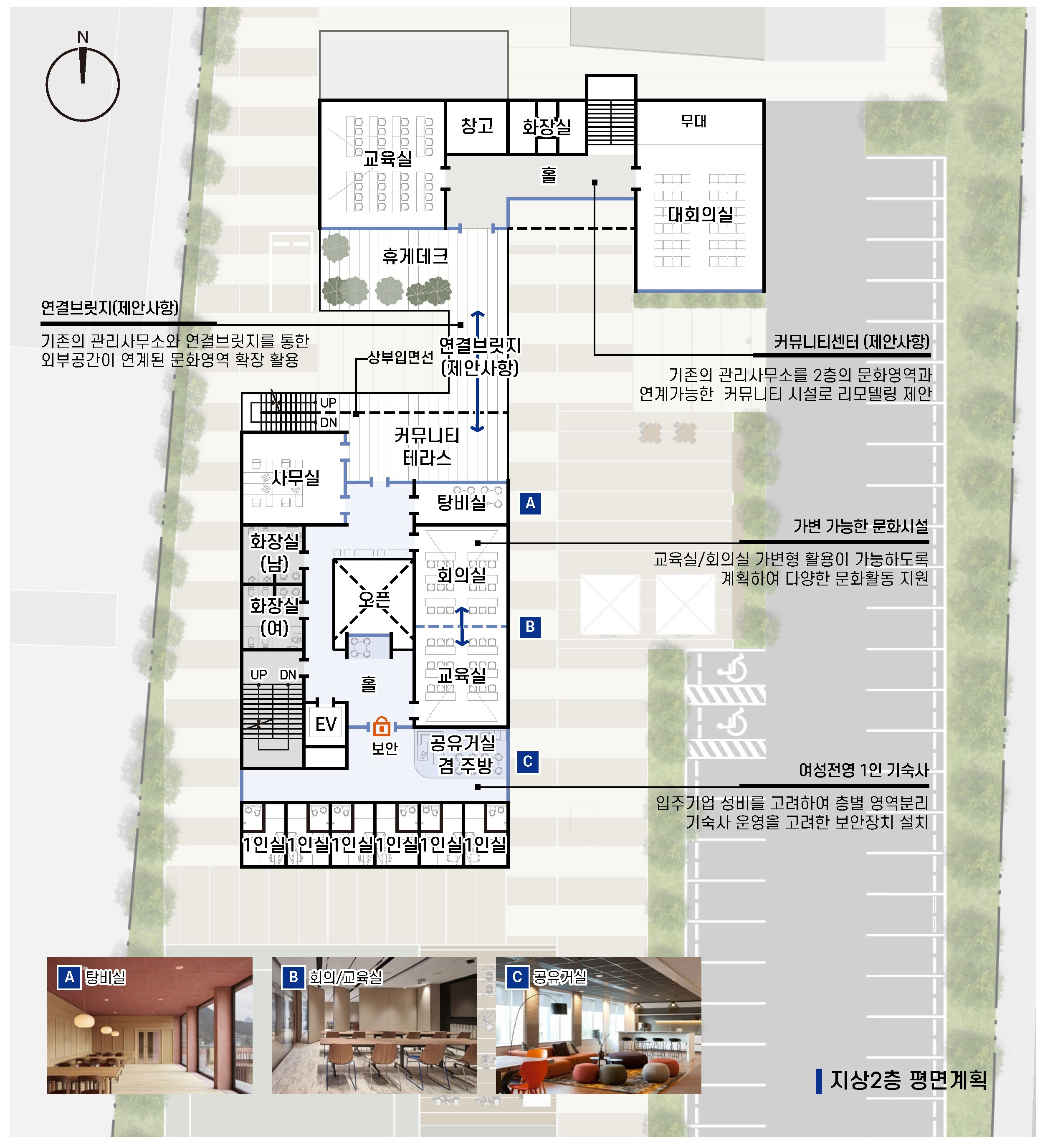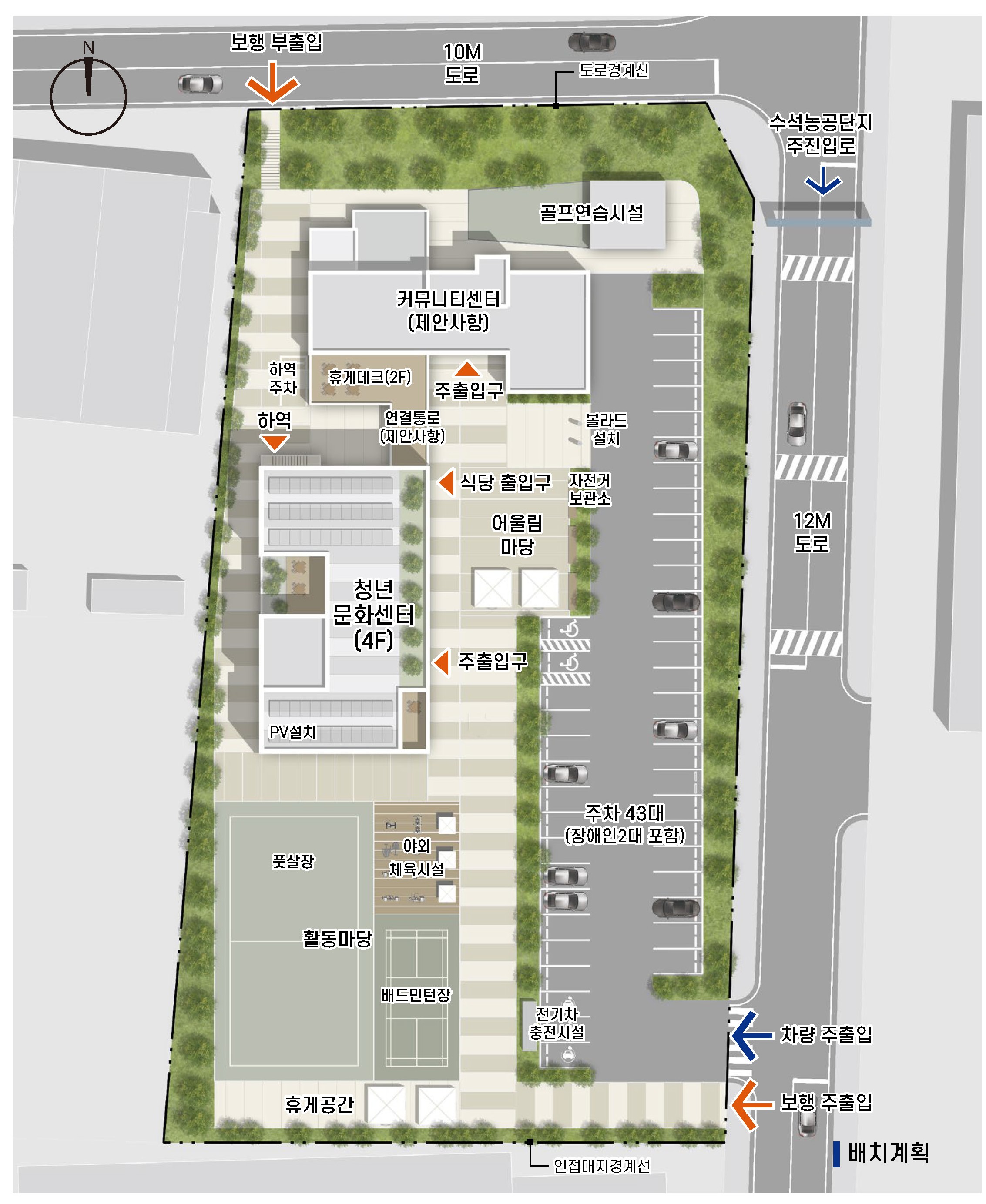 농공단지 초입에 위치한 이 시설은 기존 관리사무소와 연결되며 단지의 첫인상을 형성하는 상징적 관문이다. 정면성을 강조한 배치는 방문자에게 명확한 인지성을 부여하는 동시에 공간의 정체성을 강화한다. 또한 기존에 보행과 차량 동선이 혼재되어 있던 환경을 재정비하여, 보차를 명확히 분리함으로써 보다 안전하고 쾌적한 보행 환경을 구축하였다.