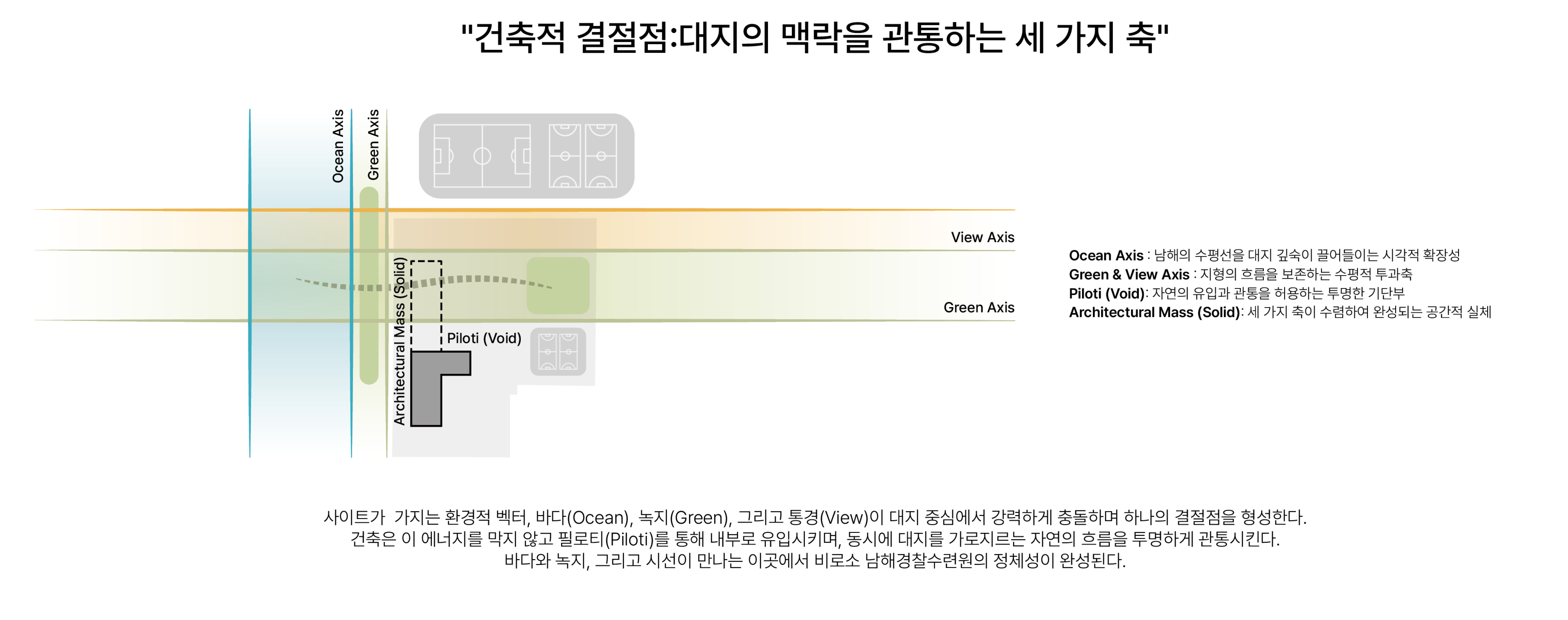 본 설계의 근간은 대지가 품은 자연의 생명력과 인간의 휴식을 잇는건축적 결절점을 구축하는 것에 있습니다. 단순히 기능적인 건물을 세우는 것을 넘어, 남해의 푸른 바다, 풍부한 녹지, 그리고 압도적인 조망이라는 세 가지 물리적 축이 교차하는 지점에 주목하였습니다. 우리는 인위적인 벽으로 자연을 단절하기보다, 풍경을 온전히 투영하는 '프레임(Frame)'으로서의 건축을 제안합니다. 이를 통해 수련원을 찾는 사용자들은 건축적 장치를 매개로 자연과 깊이 교감하며, 일상에서 벗어난 진정한 의미의 ‘치유와 회복’을 경험하게 될 것입니다.
