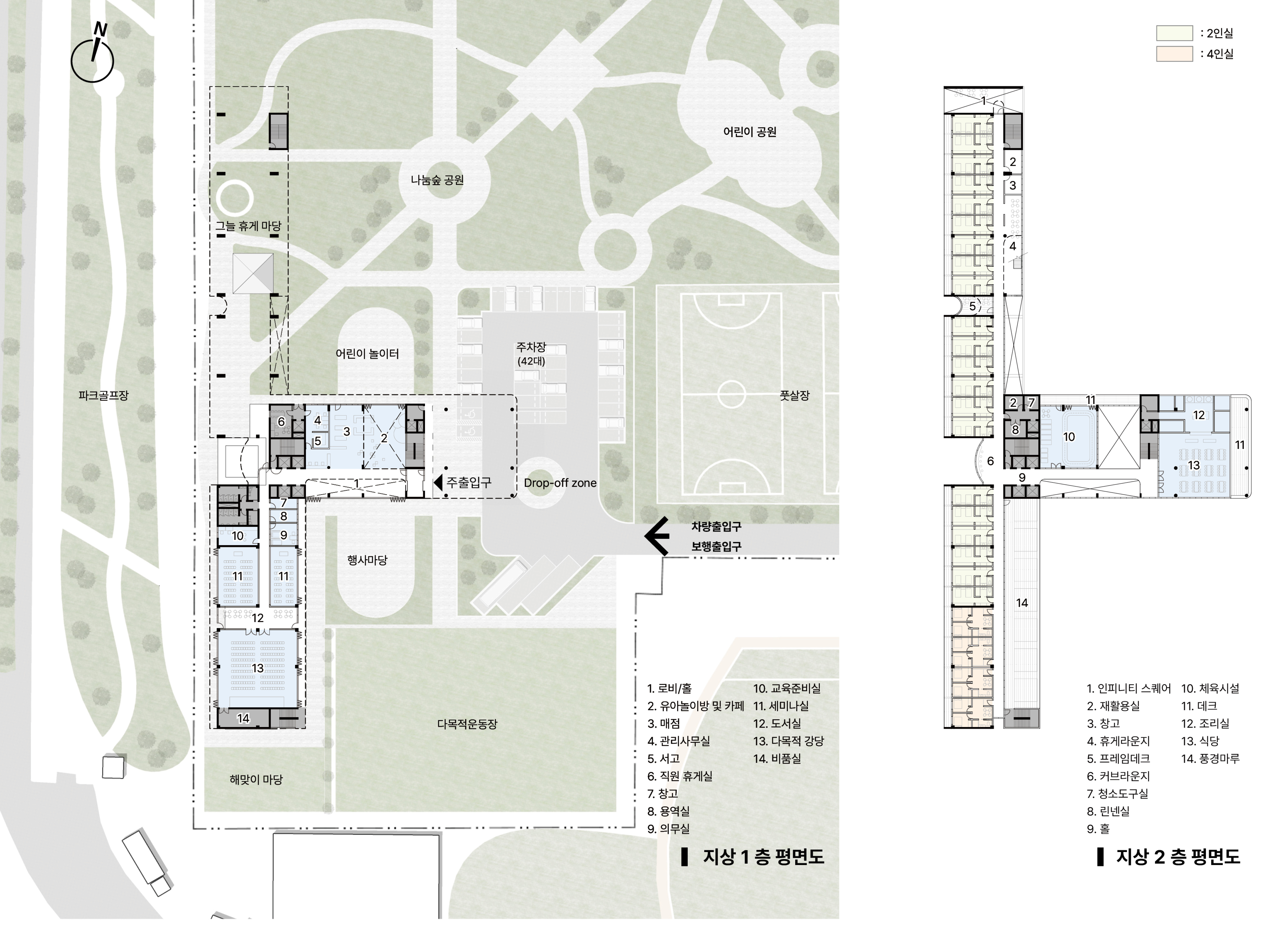 1) 영역의 유연한 분리: 공공 영역과 사적 영역을 입체적으로 분리하여 이용객의 프라이버시를 철저히 보호하는 동시에, 외부 공간은 남해 스포츠파크 이용객 모두에게 열린 ‘개방적 장소’로 제공됩니다.