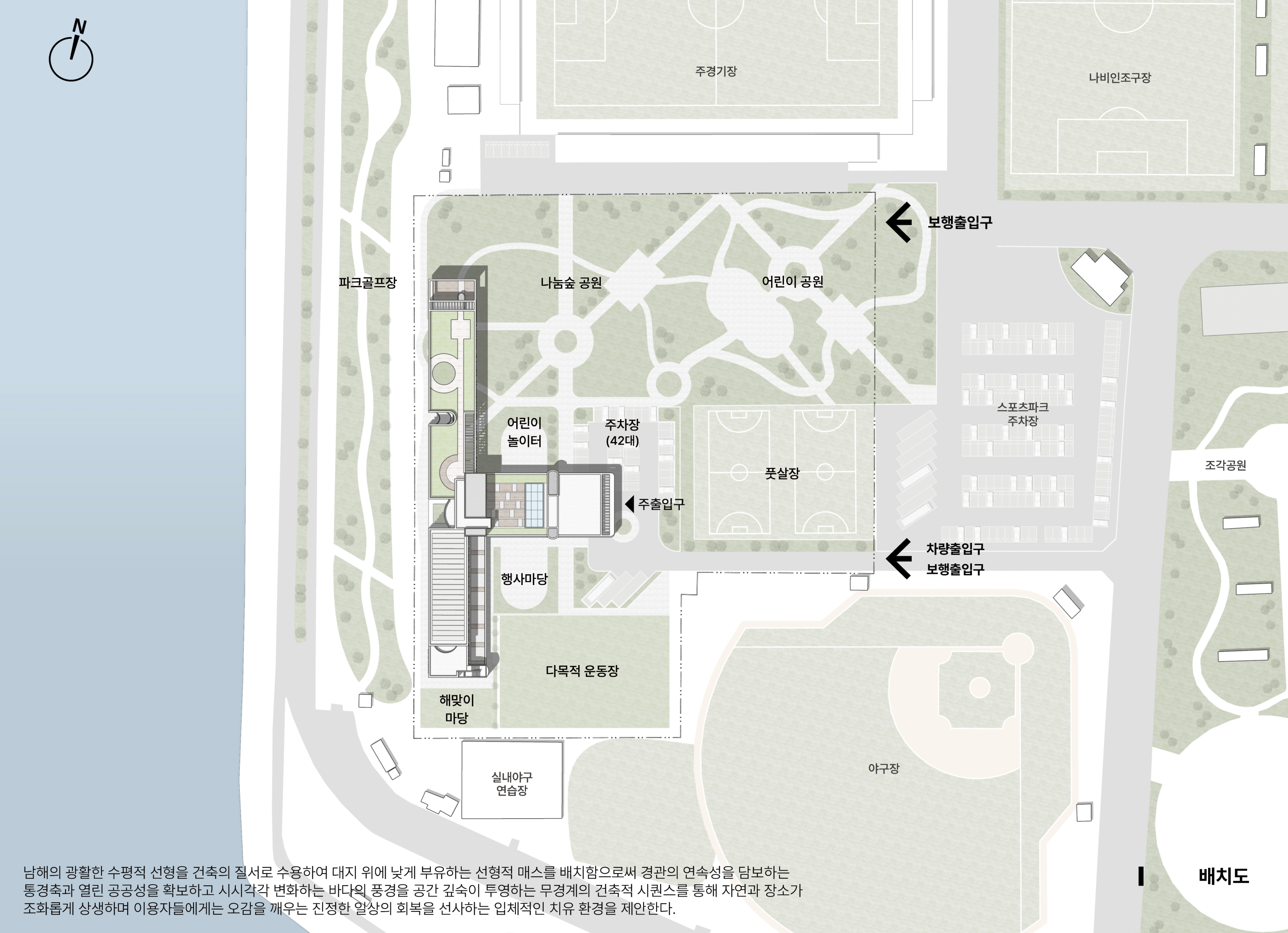 결과적으로 본 계획안은 대지의 문턱을 낮추고, 경관이 가진 공공재적 가치를 모두와 나누는 것에 집중했습니다. 단순한 수련 시설을 넘어, 지역과 상생하며 남해의 새로운 경관적 가치를 창출하는 건축적 이정표가 될 것입니다.