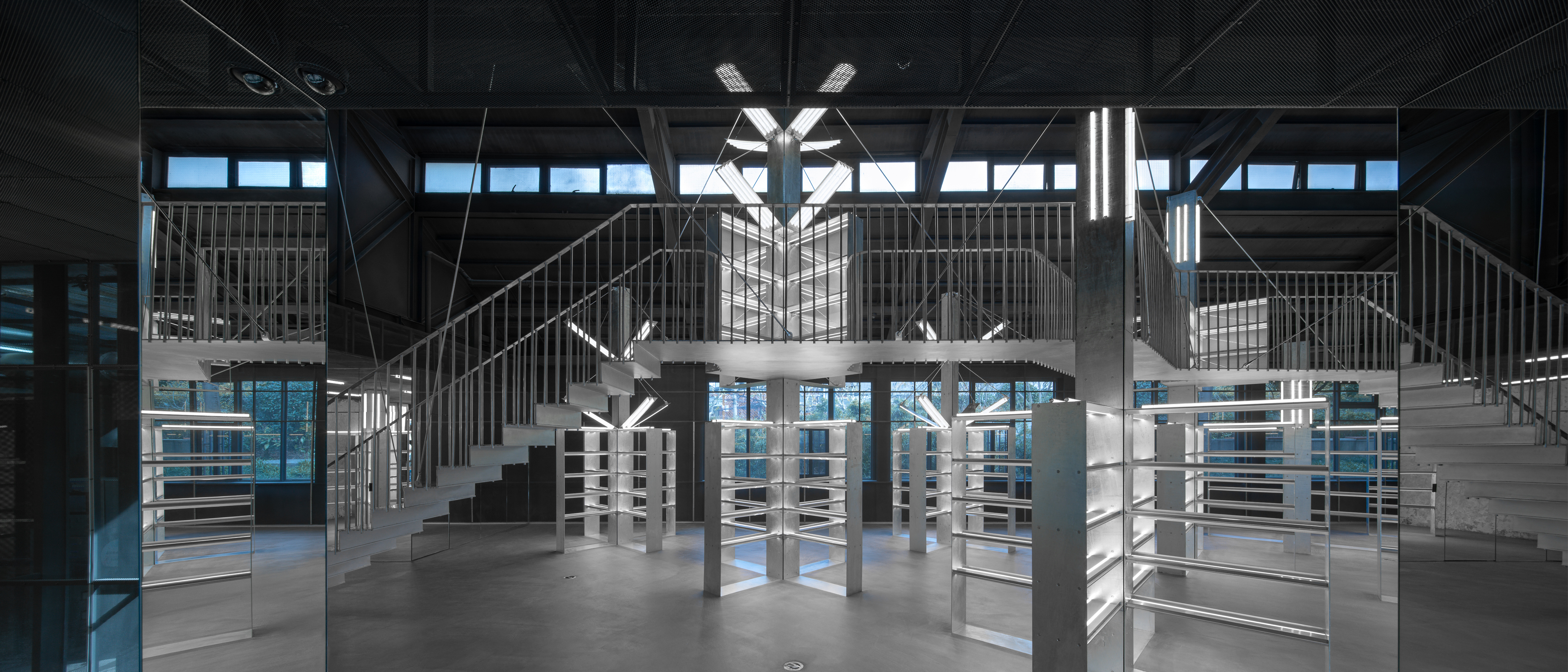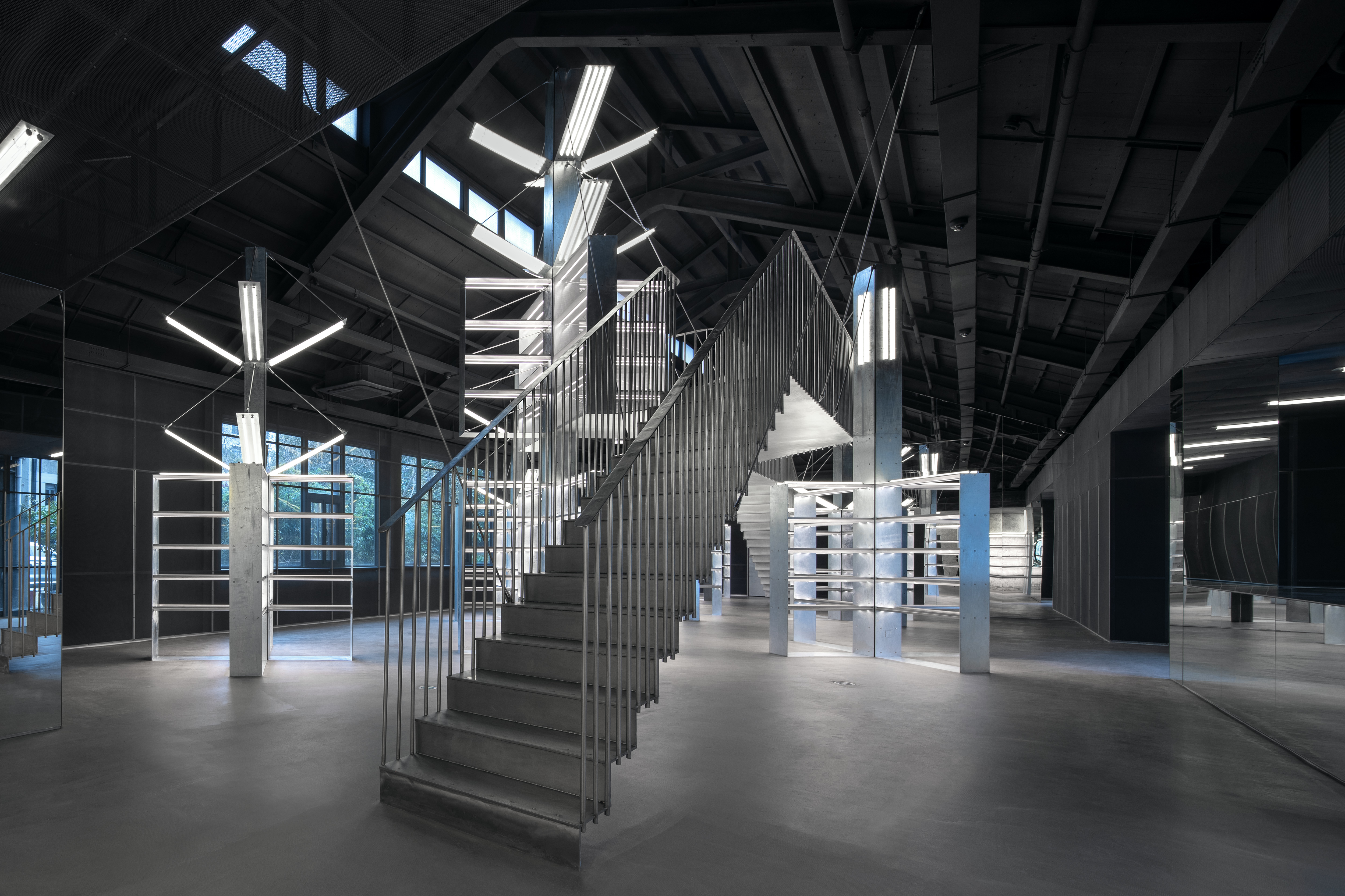 십자형 디스플레이 선반은 공간 전체에 배열되어 미래 도시의 축소된 풍경처럼 읽힌다. 보행로는 지상과 상부를 연결하는 입체적 동선 체계를 만들며, 상부에서 내려다보면 서로 다른 높이의 랙이 마치 금속으로 만들어진 건축물처럼 펼쳐진다. 사선으로 배치된 조명은 날개처럼 보여, 다양한 방향에서 들어오는 빛과 함께 공간 전체에 미래적이고 이상적인 분위기를 만든다.