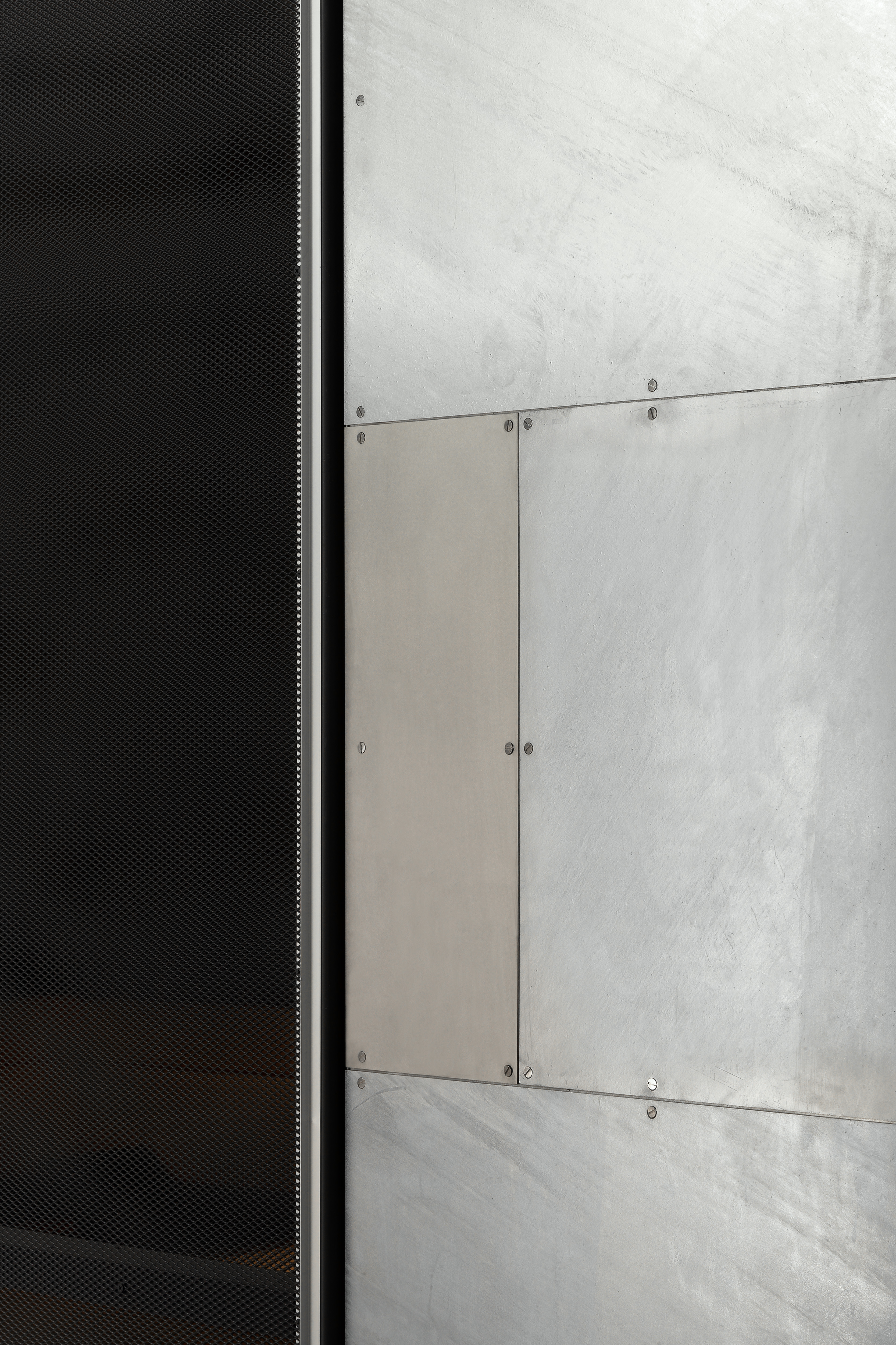 이 프로젝트의 디자인 언어는 전반적으로 통일되어 있다. 금속은 공간 전반에 걸쳐 적극적으로 사용되며, 서로 다른 표면 질감이 공존하면서도 통일된 인상을 만든다. 전시 공간과 바 영역 사이에는 이중 금속 메쉬가 사용되어 공간을 분리하면서도 서로의 분위기를 전달한다. 이로 인해 내부에는 몽환적인 분위기가 형성된다.