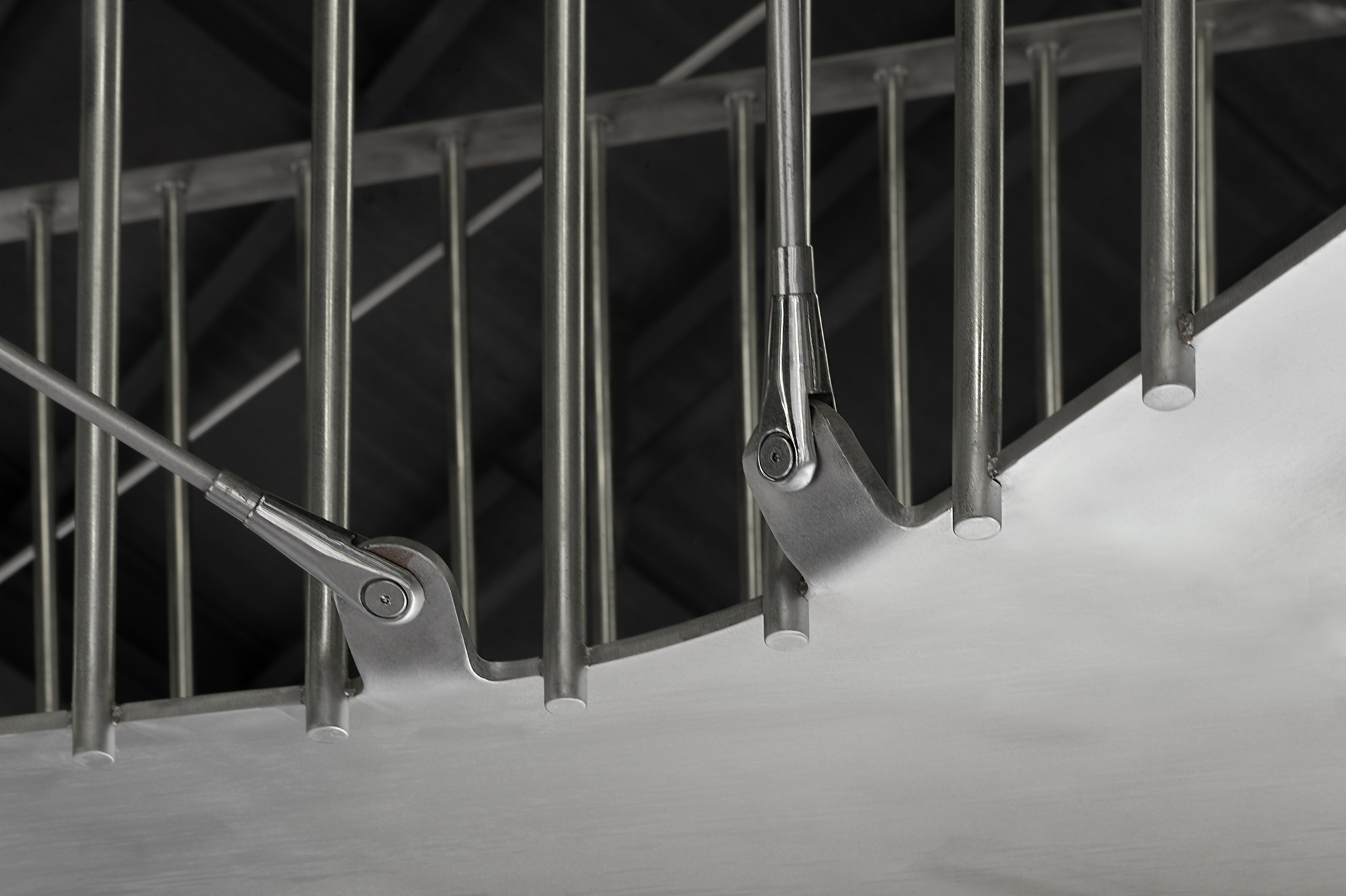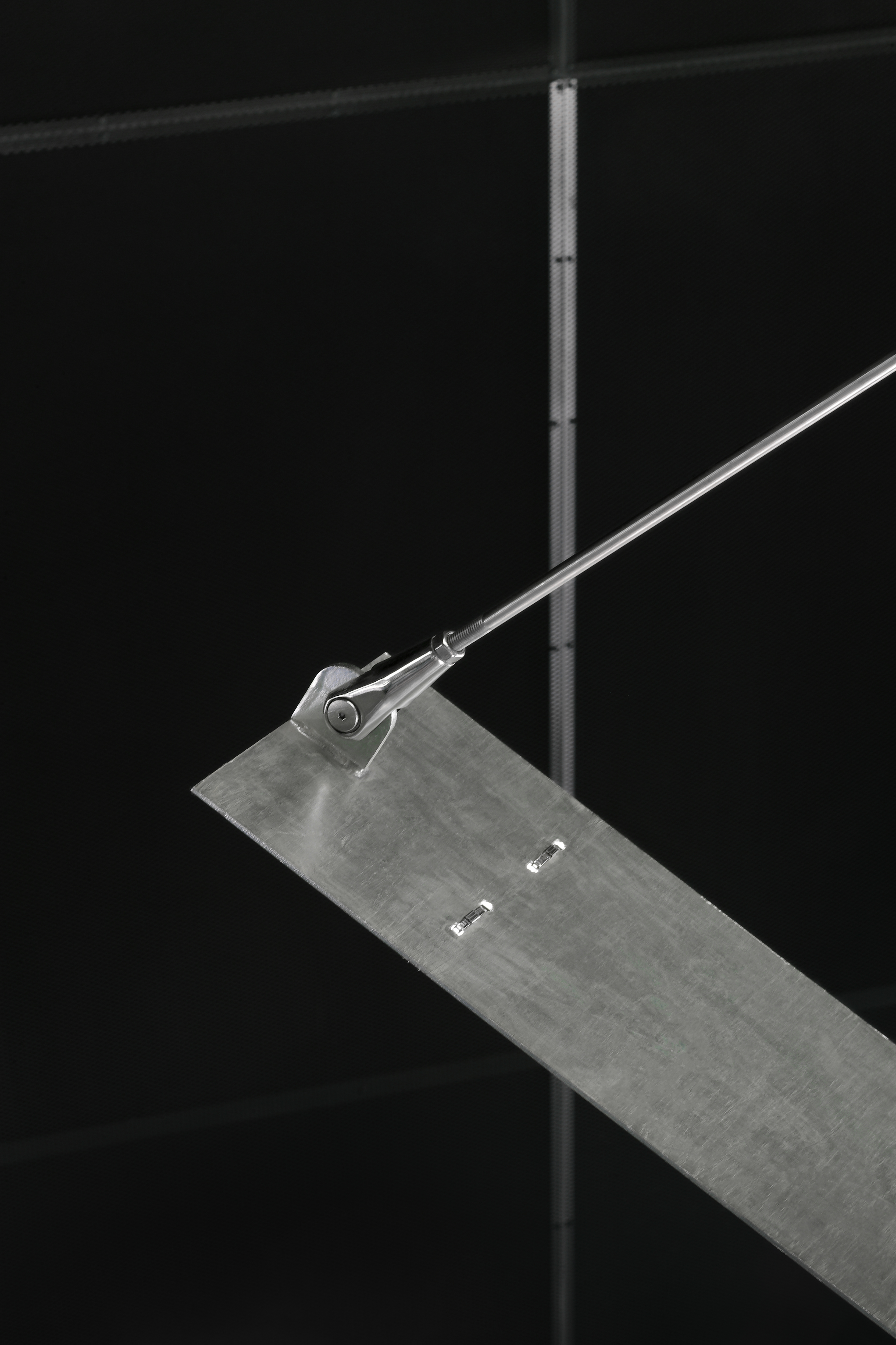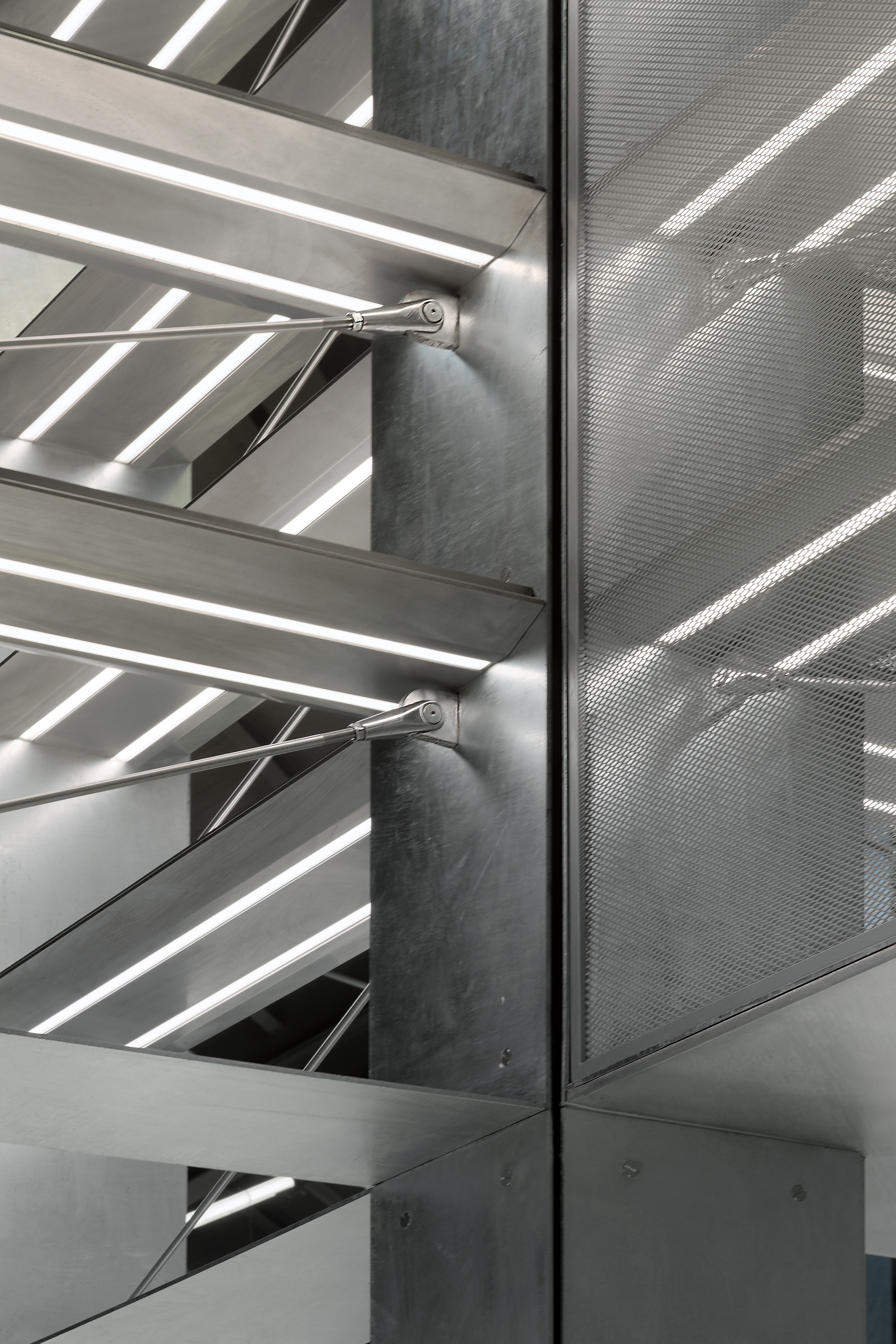 선반은 금속 프레임 네 개가 직각으로 교차하는 형태로 되어있다. 전시 선반과 브릿지의 케이블 구조 그리고 브릿지는 하나로 연결되어 계단과 브릿지, 전시 구조가 하나의 금속 판이 접히고 컷팅되어 만들어 진 것처럼 일체화된 인상을 만든다.
