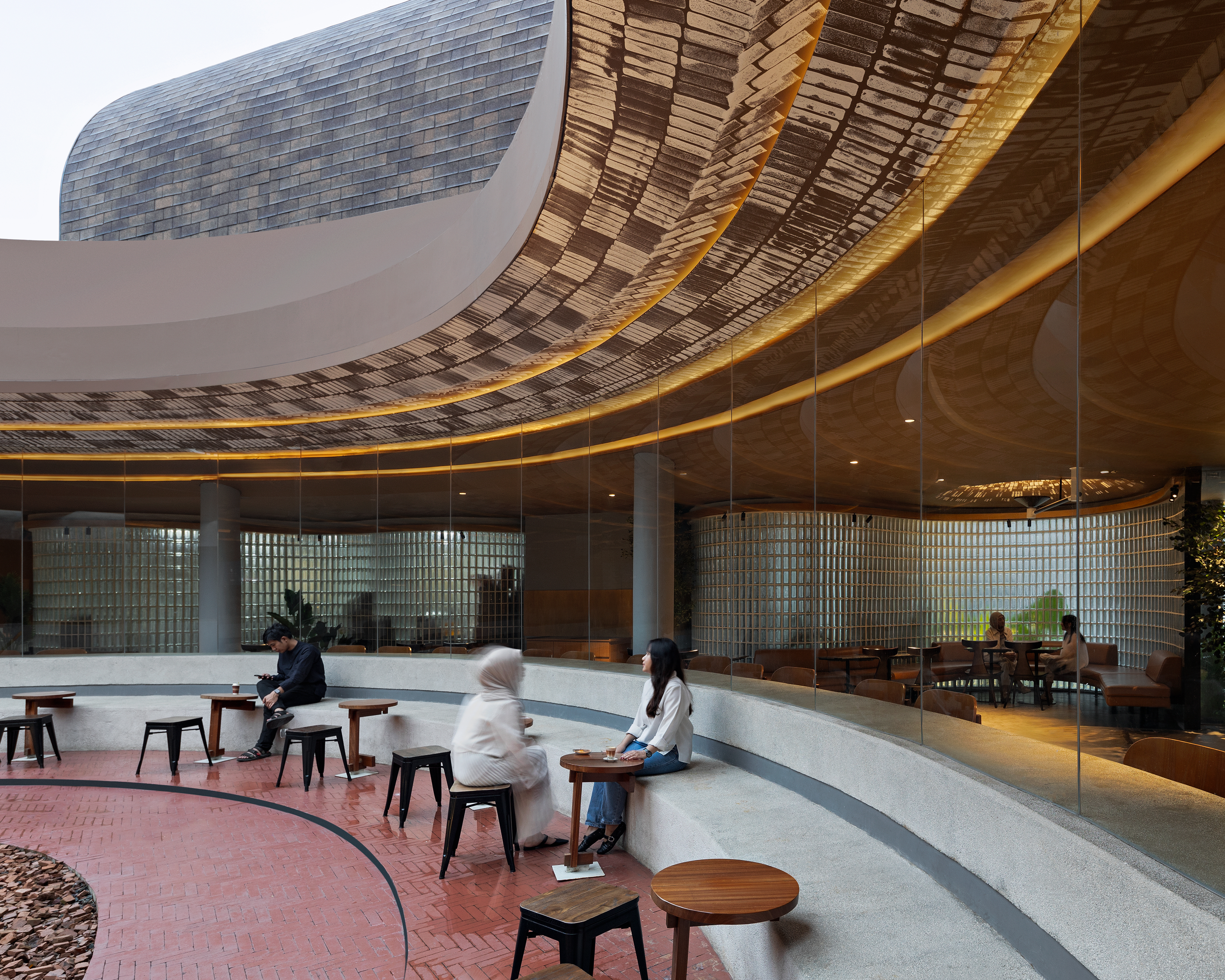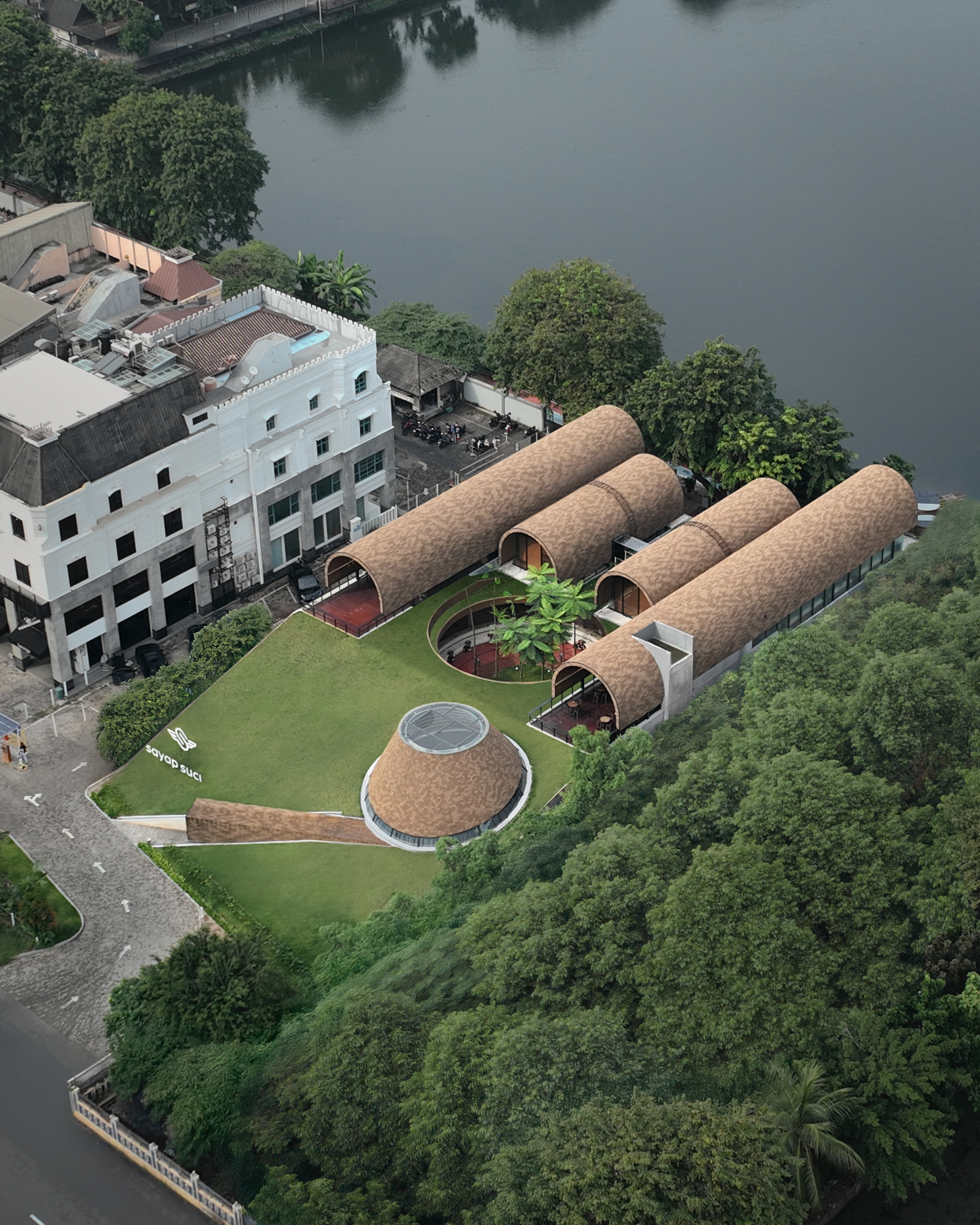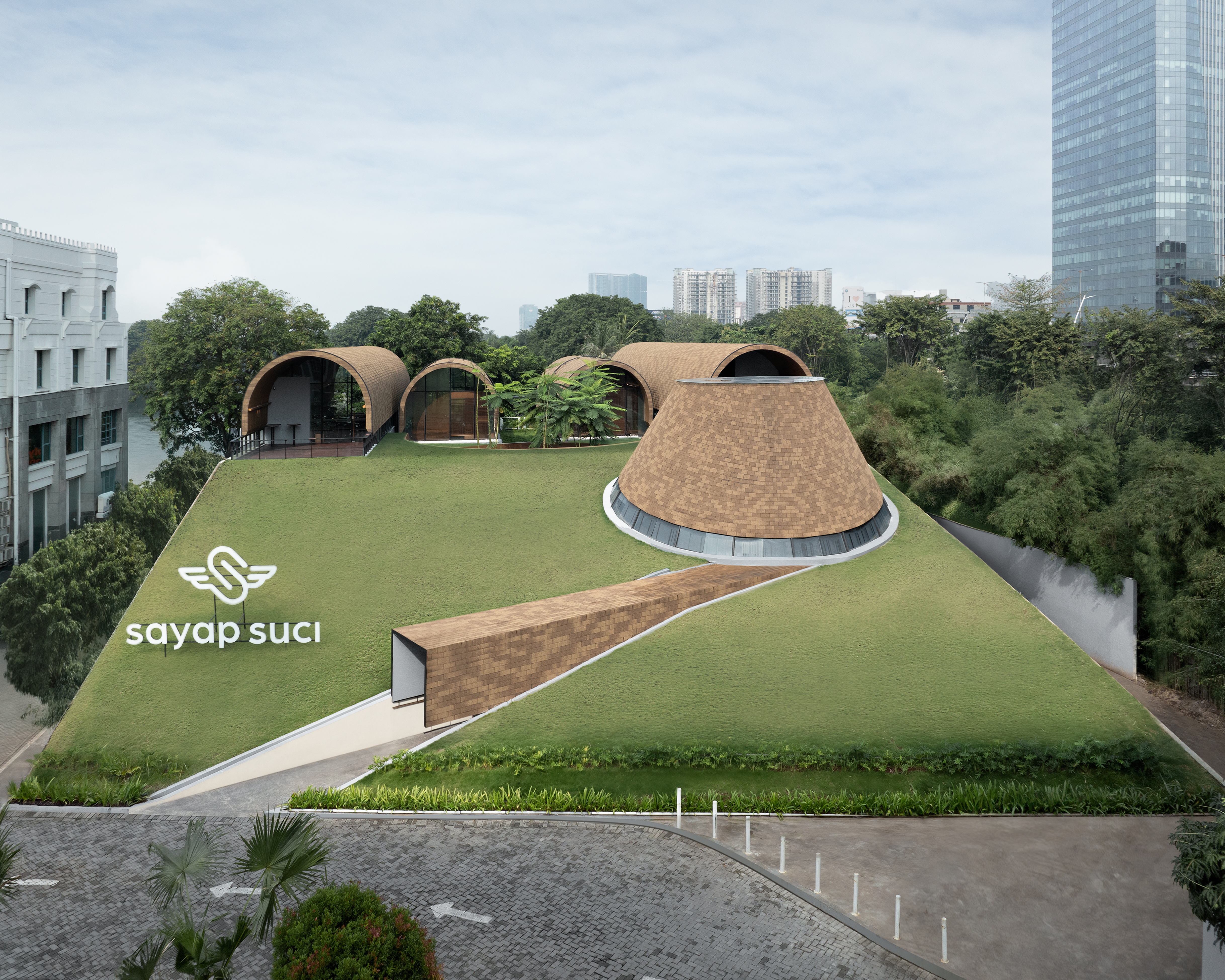 이 곳은 자카르타 중심 비즈니스 지구에 위치한 프로젝트로, 네 개의 매스가 경사진 녹지에 덮인듯 보이는 레스토랑 및 공공 공간이다.