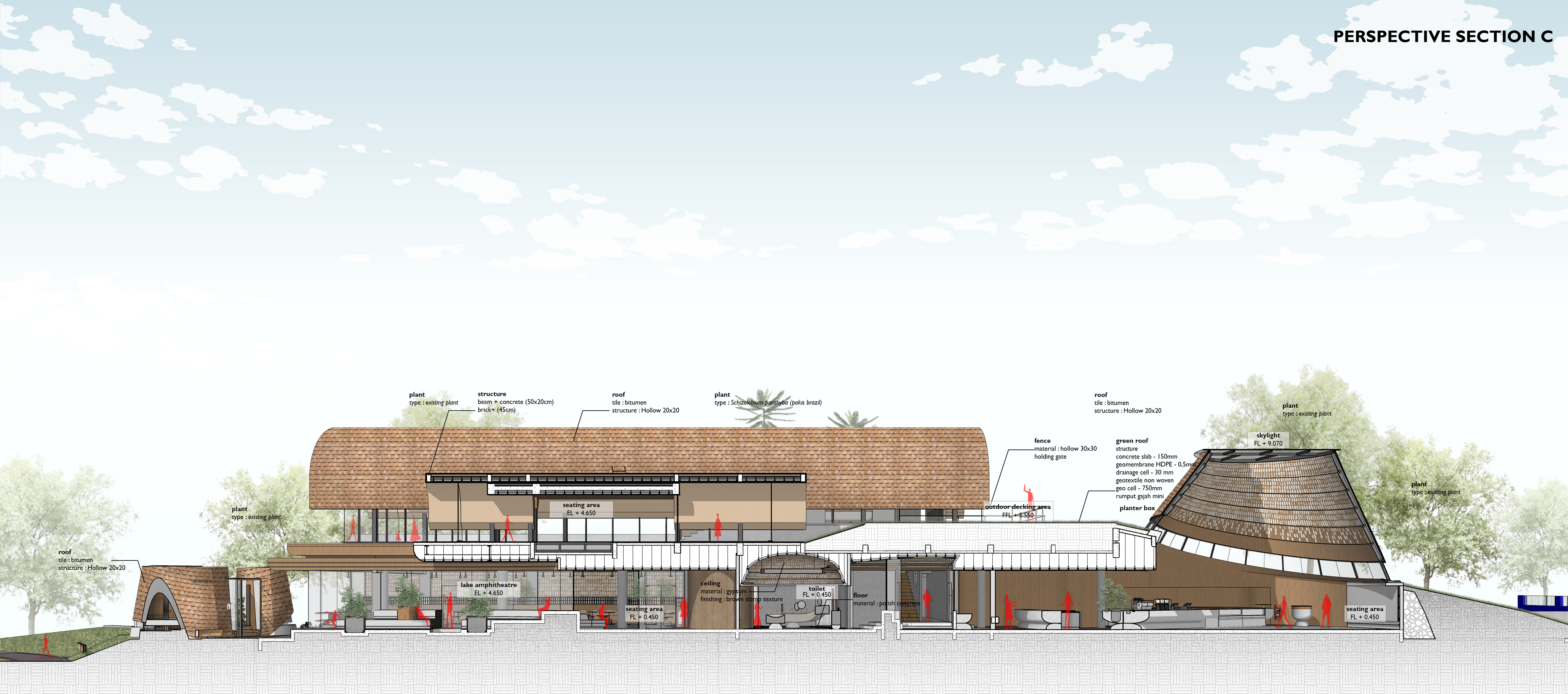 건축가는 자연과 결합된 공간을 재해석하며, 방문자가 전개되는 동선과 녹화 지붕 아래의 그늘진 공간을 경험하도록 계획하였다. 녹화 지붕은 기울어진 형태를 취하며, 공기의 흐름을 유도하고 전면의 도시 가로와 후면의 호수를 연결하는 역할을 한다. 이는 열대 기후 속에서 쾌적한 환경을 형성하는 장치로 작동한다.