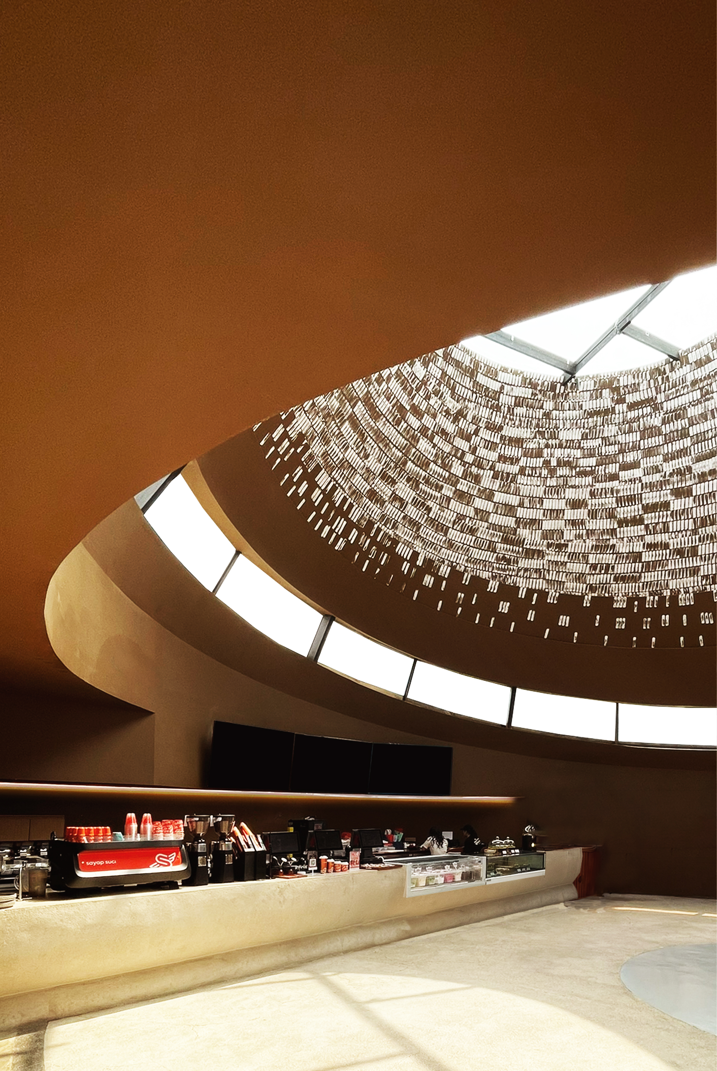 레스토랑과 바 내부에서는 높은 곡면 천장이 시선 방향으로 점차 낮아지며, 이용자가 자연스럽게 호수를 바라볼 수 있게 했다. 내부에 진입하면 방문자는 선큰 공간의 깊이와 규모에 의해 둘러싸이며 강한 감각적 경험을 얻게 된다.