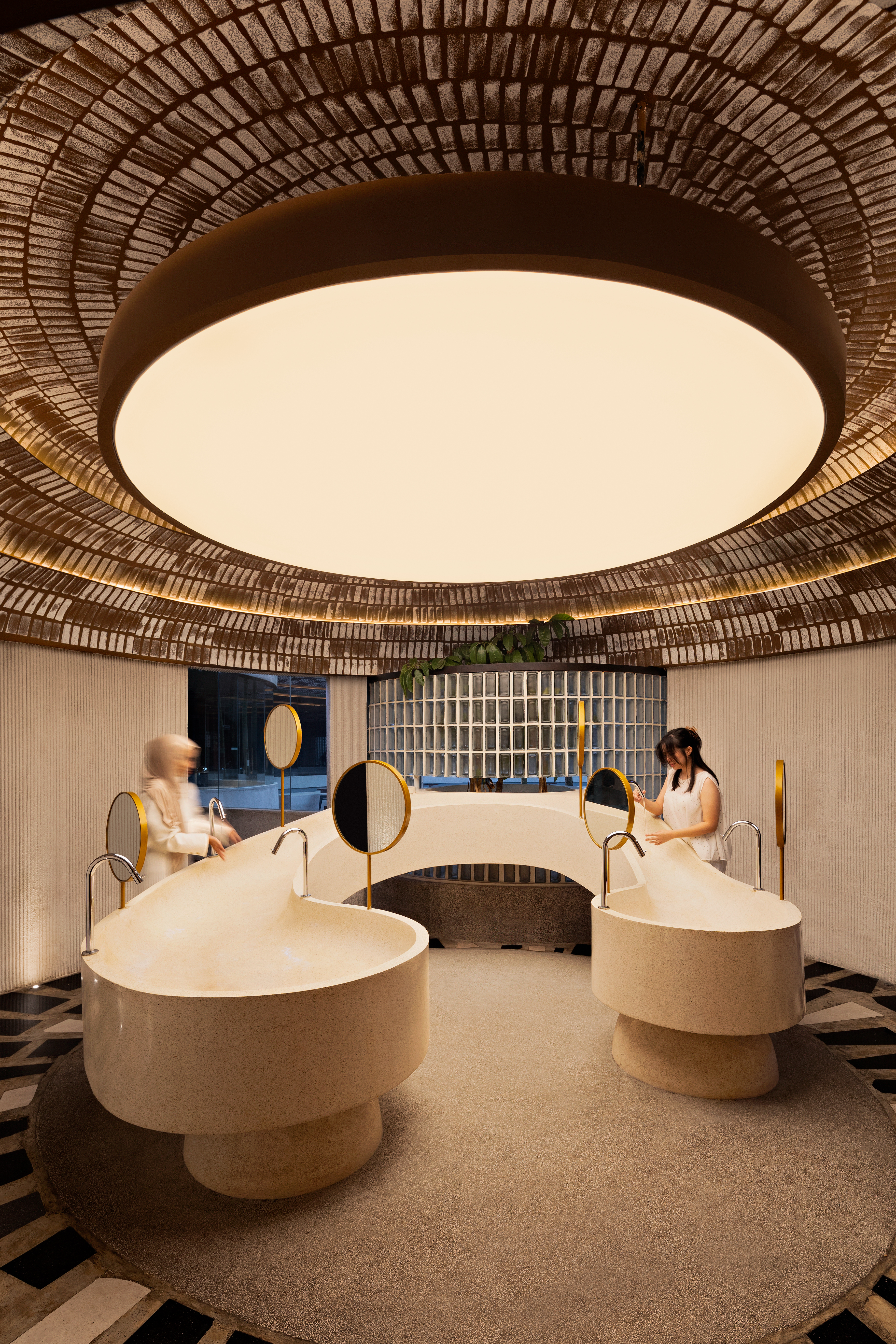 선큰 공간은 진입부에서 시작되어 경사진 지형과 자연스럽게 연결되며, 조형적인 건축 경험을 형성한다. 드롭오프 공간에서 이어지는 넓은 동선은 리셉션과 바 영역을 감싸며, 방문자를 보다 밀도 있는 전이 공간으로 유도한다. 천창으로 빛이 유입되는 로비를 지나면 주요 공간과 내부 코트로 자연스럽게 이어진다.
