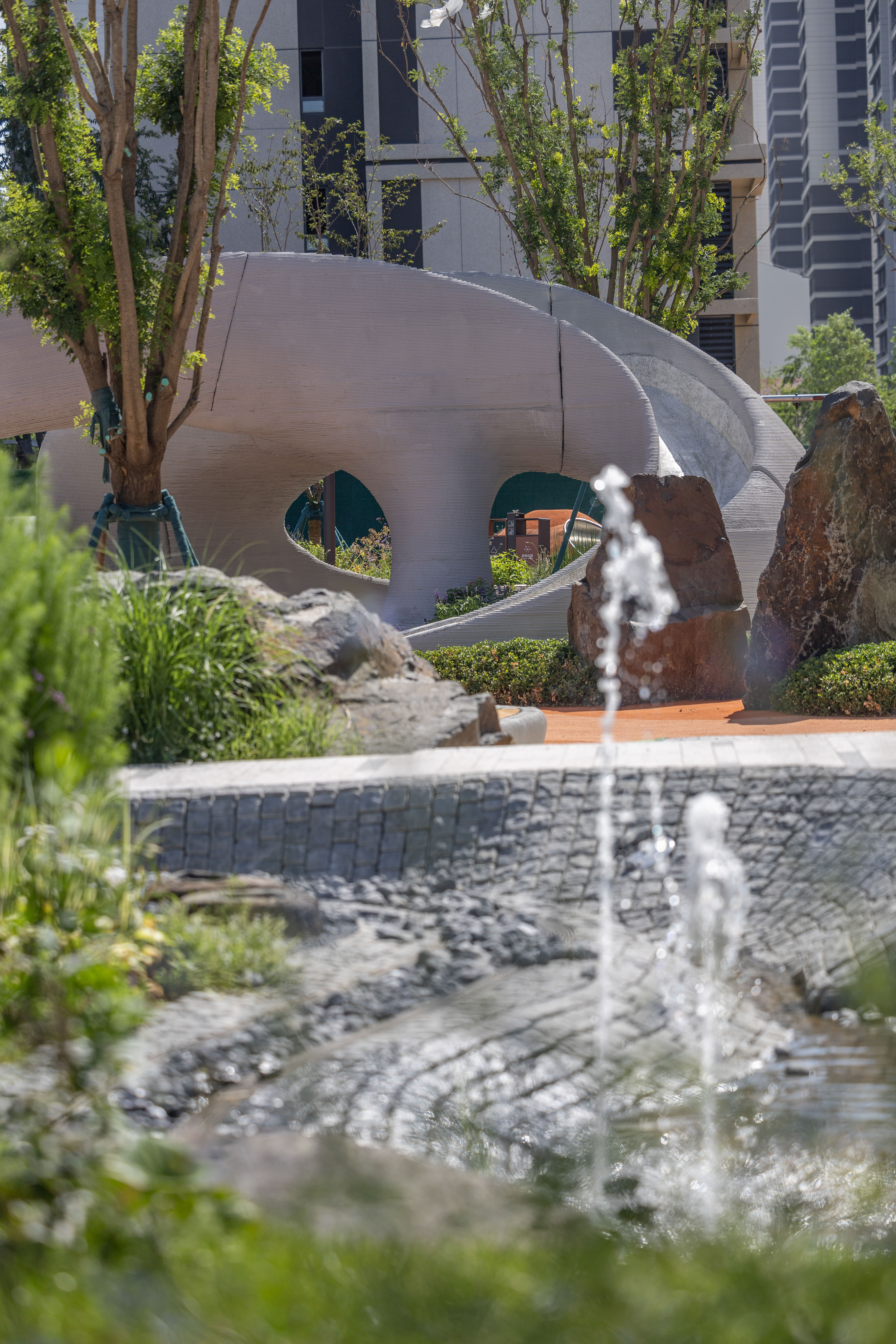 3D 프린팅 기술은 복잡한 유기적 형태를 단일 구조로 제작할 수 있게 하며, 형태의 정확도를 높이고 시공 과정에서의 오차를 줄인다. 특히 경관 구조물과 같이 비교적 하중이 적은 프로그램에서는 다양한 활용 가능성을 지닌다. 이 프로젝트에서 사용된 콘크리트는 평균 50MPa 강도를 가지며, 일반적인 C40 콘크리트를 상회하는 성능을 확보한다. 이는 대부분의 경관 구조물에 충분한 구조적 안정성을 제공한다.