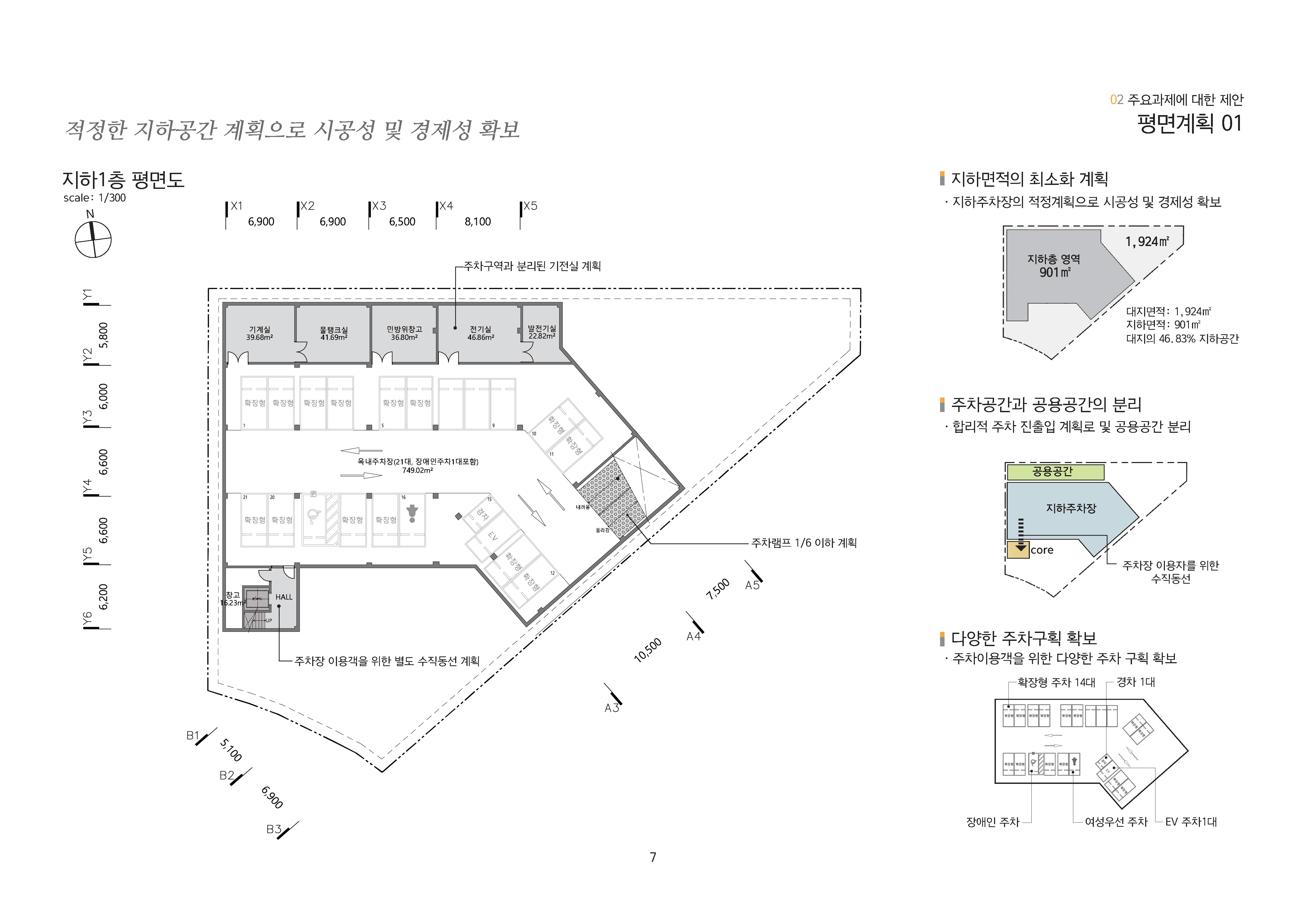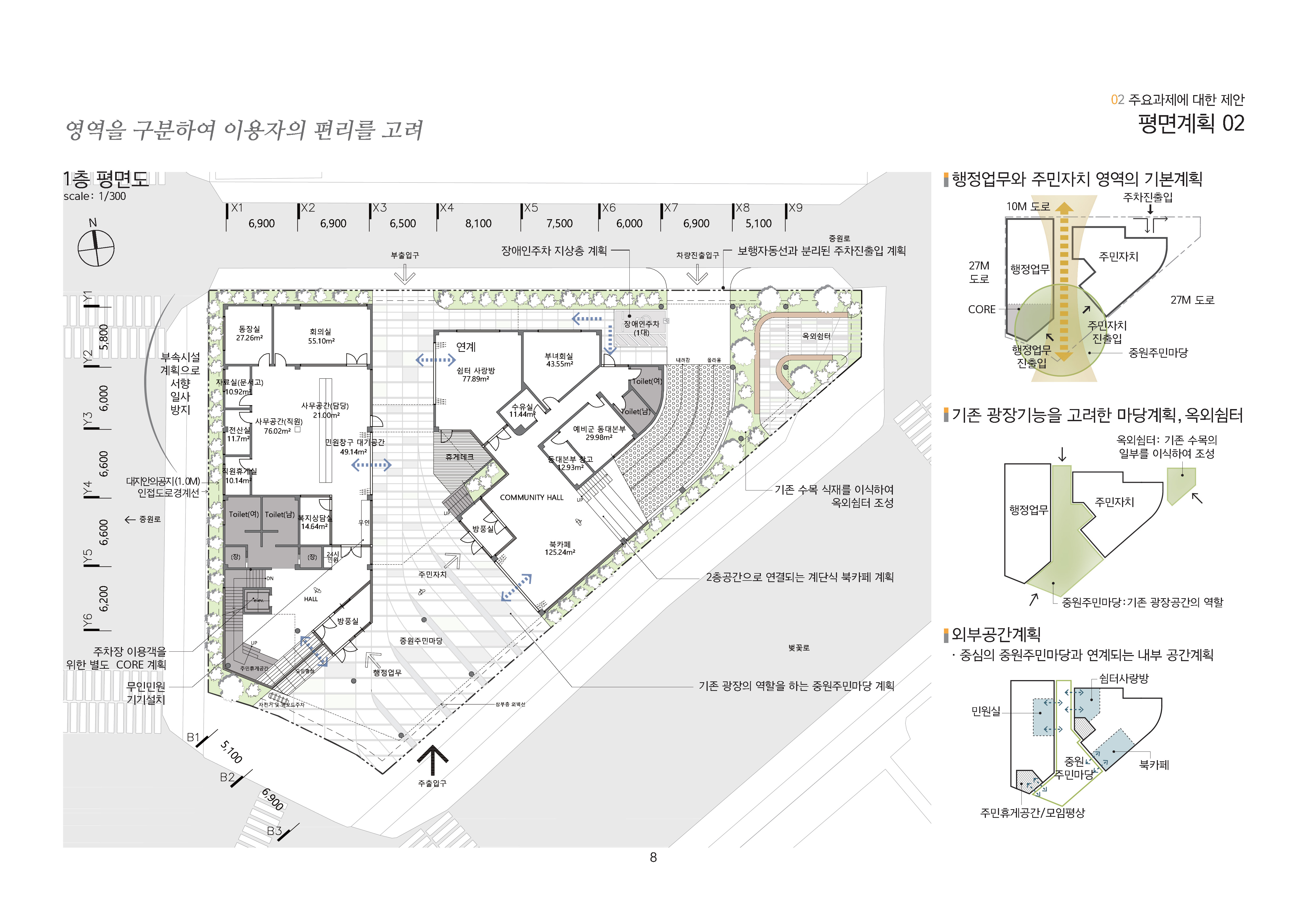 가로에 면한 장옥의 입면 지붕으로 경관의 연속성 표현하고 주변 스케일의 유사성 및 리듬감을 표현하는 입면계획으로 상징성을 표현한다. 원도심의 중심부에 위치한 대지의 특성에 부합되도록 보이드와 솔리드 공간의 적절한 계획으로 대지의 개방성을 확보한다.