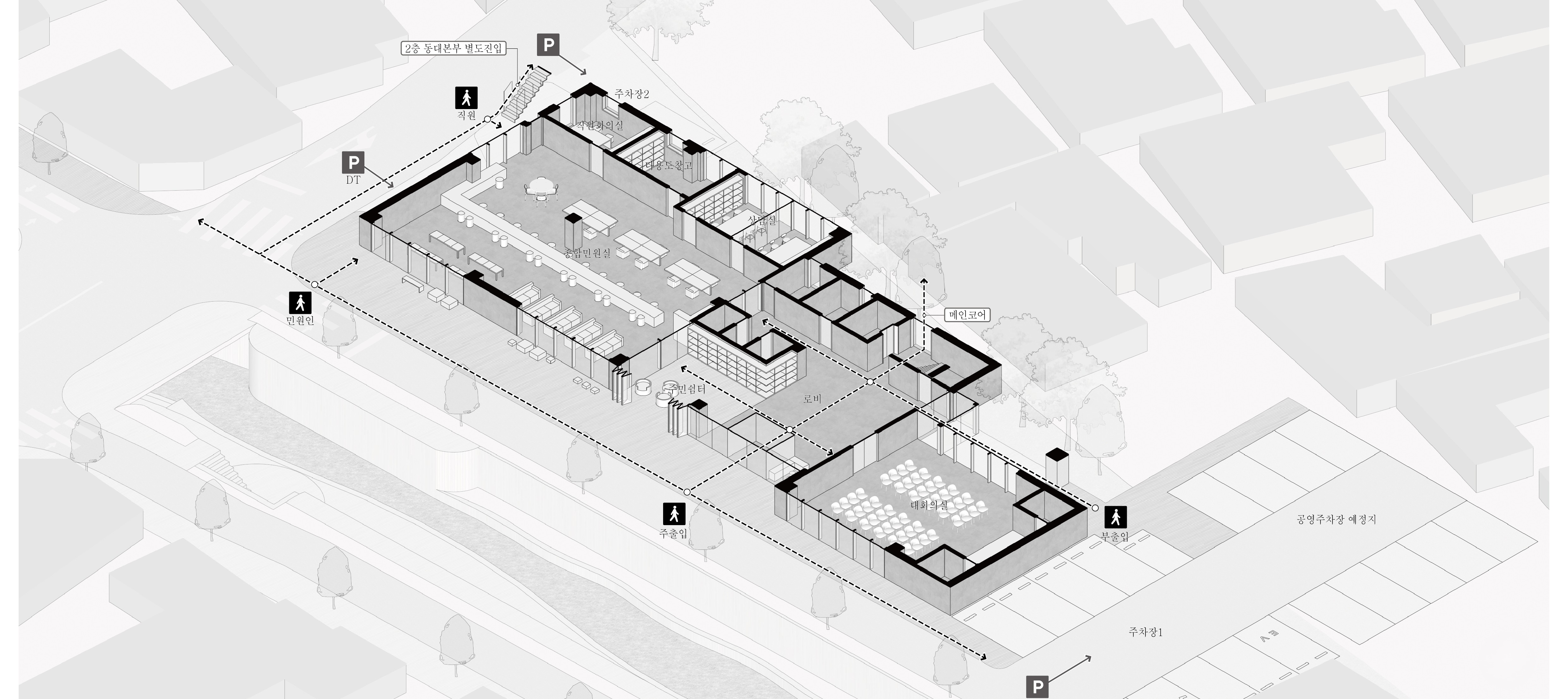 위압감을 주는 커다란 건물이 아닌, 프로그램에 의해 만들어진 작은 볼륨의 공간들은 공용공간을 통해 모이고 퍼지며 전체를 만든다. 작은 볼륨 사이공간으로는 빛과 초록이 스며들며, 내·외부공간을 엮어준다.