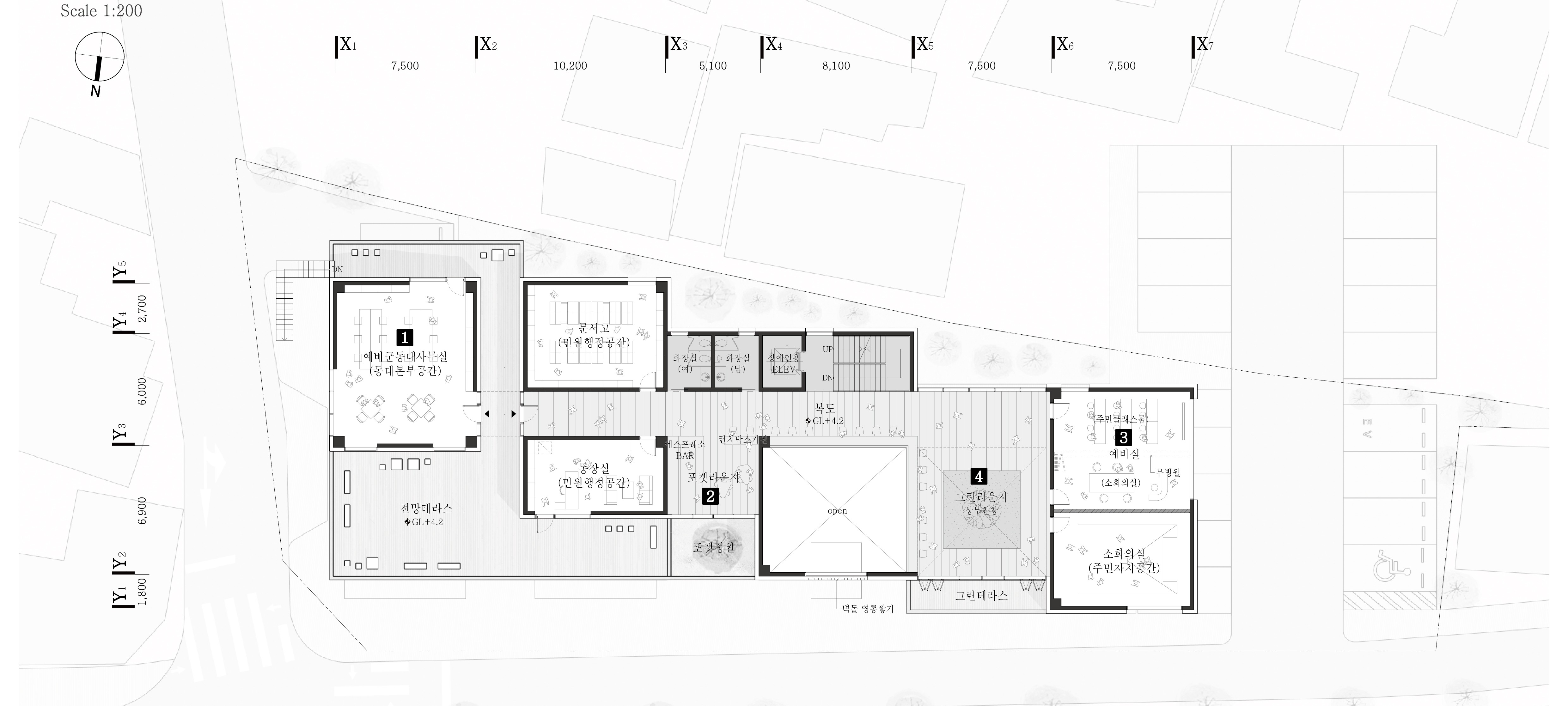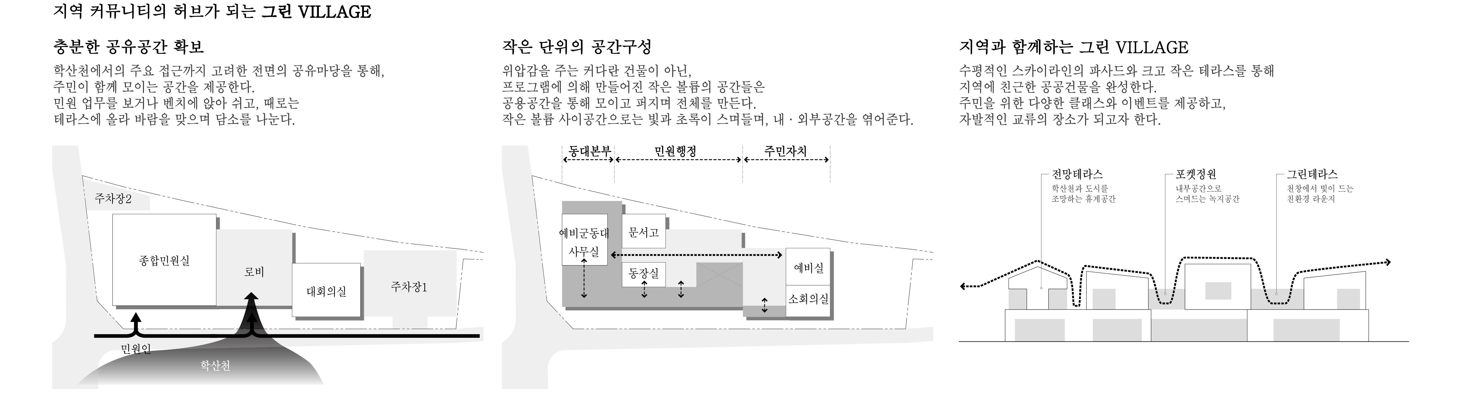 학산천에서의 주요 접근까지 고려한 전면의 공유마당을 통해, 주민이 함께 모이는 공간을 제공한다. 민원 업무를 보거나 벤치에 앉아 쉬고, 때로는 테라스에 올라 바람을 맞으며 담소를 나눈다.