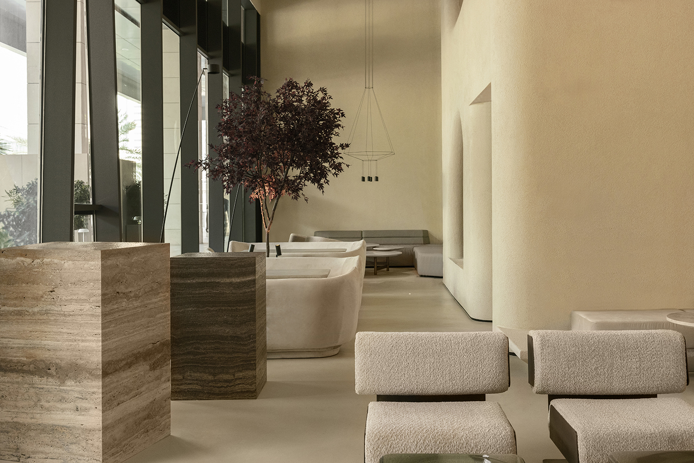프로젝트의 자리 또한 개념을 밀어 올린다. 부르즈 할리파(Burj Khalifa) 정상을 향한 전망과 더불어, 건물의 내부 구조를 ‘층위의 분절’로 만들게 한다. 파노라마 글레이징과 맞닿은 주 출입부에서 안쪽으로 들어갈수록, 공간은 단계적으로 나뉘며 시선과 동선을 조율한다. 1층 레벨은 서로 다른 종류의 트래버틴 석재 블록으로 기능적으로 분절된다. 석재는 매끈한 가공과 거친 가공을 병치해, 자연스러운 불균질 표면과 ‘손의 흔적’을 동시에 드러낸다. 이 블록의 배치는 환대 영역과 두 개의 바(bar) 영역을 정리하는 동시에, 하나의 지형처럼 실내를 구성한다.