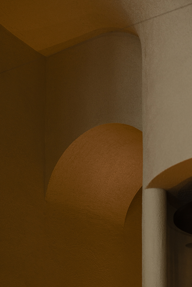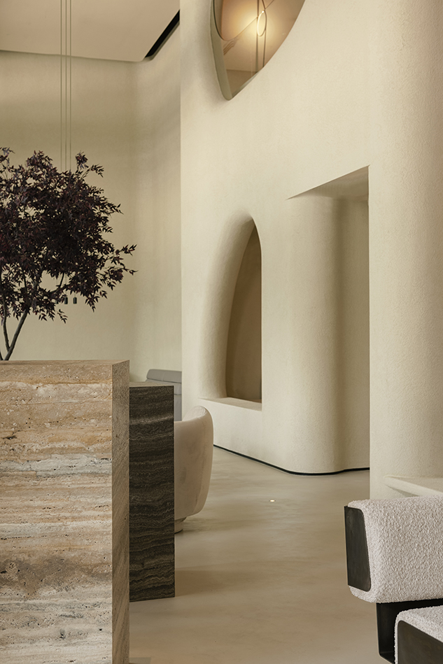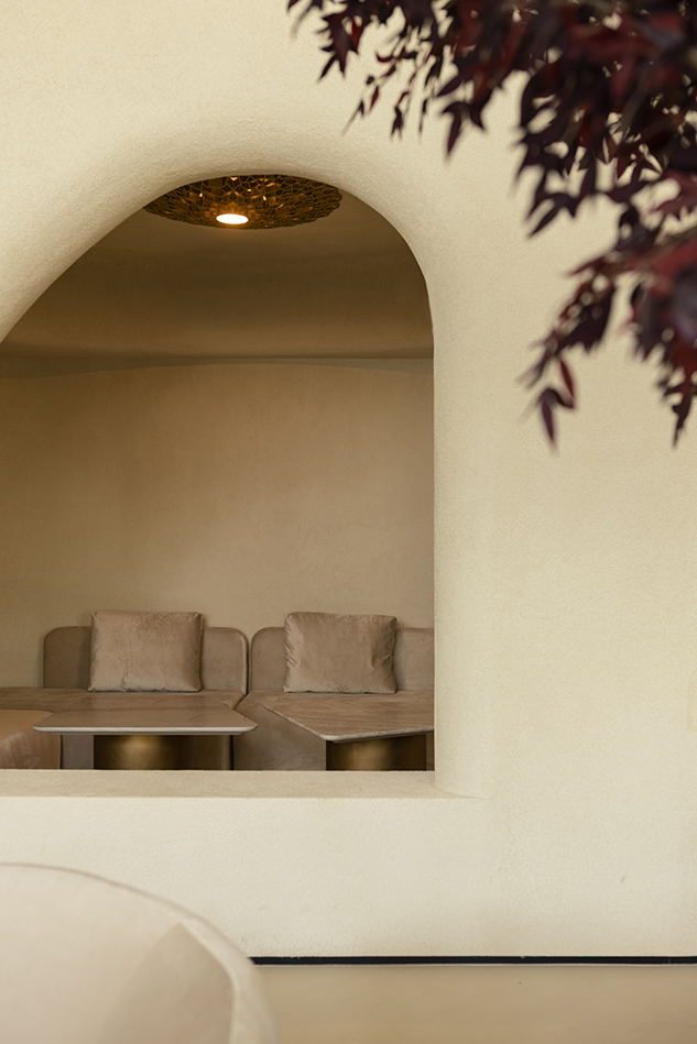 건축가가 세운 중심 개념은 사막을 ‘문화적 교류와 대화의 장소’로 읽는 태도다. 그래서 실내는 자연·전통을 흡수하는 유기적 공간으로 구성된다. 오래전부터 더운 기후의 사막 지역에서 사람들이 파내며 만들었던 거처의 기억처럼, 방들은 매끈한 타원형 윤곽을 띠고, 건축 요소의 유연한 흐름은 바람과 시간에 의해 조각된 자연 형상을 떠올리게 한다. 거칠고 매끈한 두 가지 텍스처의 미네랄 플라스터는 모래와 가까운 색감으로, 사막의 표면을 실내에서 반복한다.