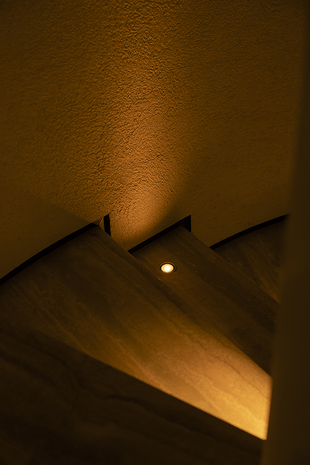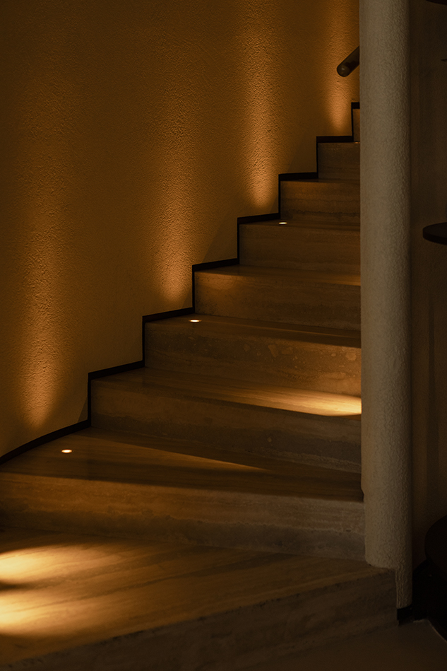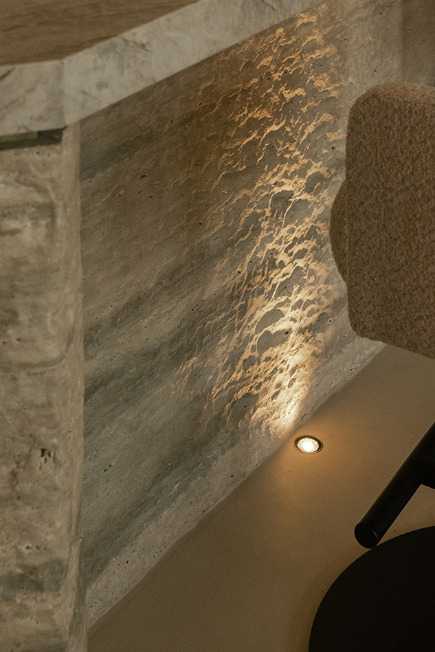 메인 홀은 벽 뒤로 두 개 층의 프라이빗 영역과 기술실로 향하는 터널을 품고있다. 2층으로 올라가는 계단은 벽의 곡률을 따라 상승하고, 상부 레벨에서는 낮은 조도와 테이블 그리고 포디움 위의 둘레형 소파가 느슨한 체류를 만든다. 바위 몸체에 파낸 듯한 개구부를 통해 테라스 풍경이 크게 열리는 순간, 실내는 더 이상 인테리어에 머물지 않고 ‘지형의 내부’처럼 읽힌다.