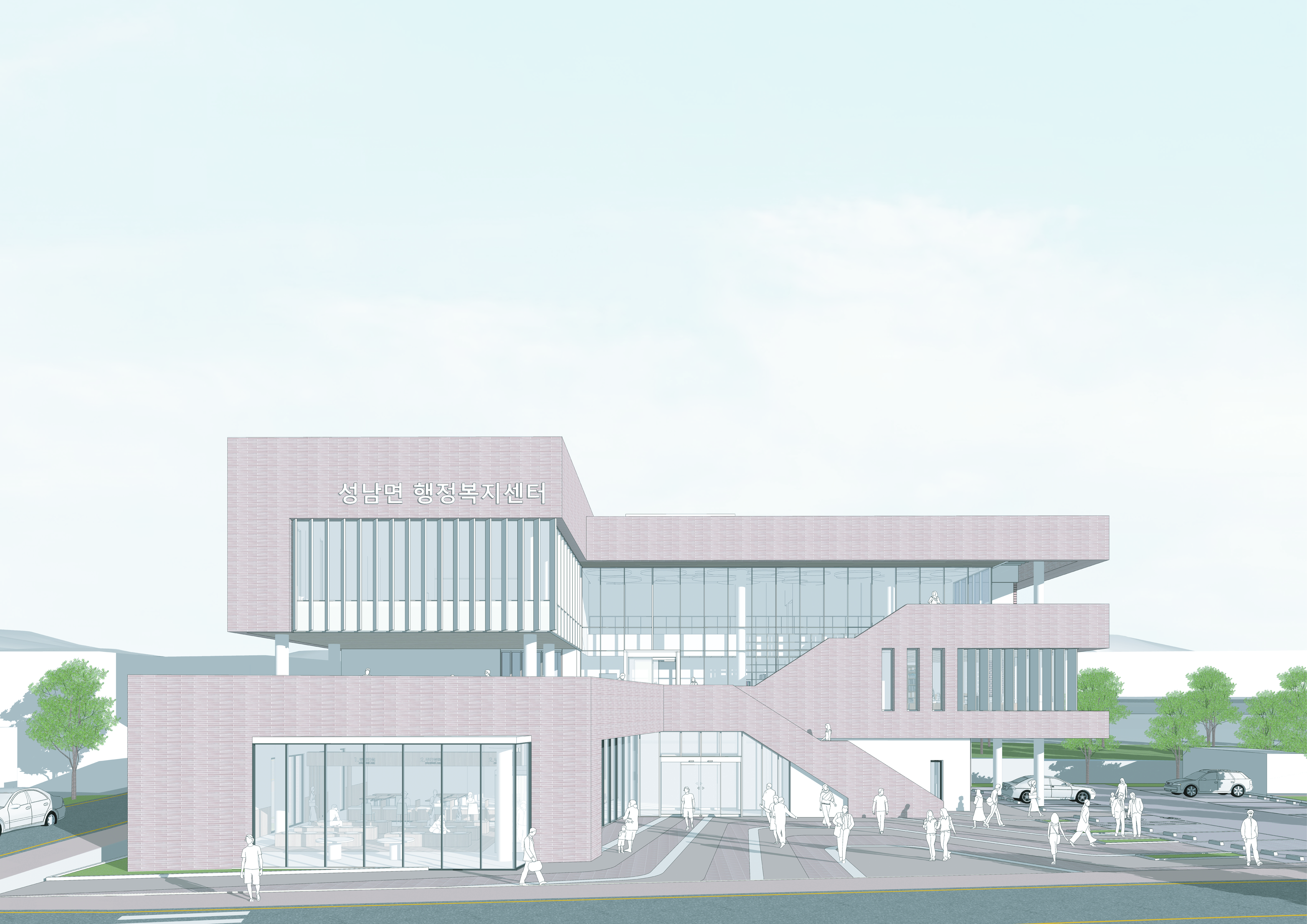 마을 풍경과 조화를 이루는 점토벽돌을 주재료로 선정하여 주민들에게 친근하고 따뜻한 이미지를 전달합니다. 벽돌의 다양한 쌓기 방식(치장쌓기, 영롱쌓기 등)을 통해 다채로운 표정을 연출하고, 에너지 효율을 높이는 동시에 현대적인 세련미를 더했습니다. 중첩되고 뻗어 나간 매스 디자인은 느티나무 그늘 아래처럼 편안한 쉼터를 제공하며, 성남면의 새로운 상징적 풍경이 될 것입니다.