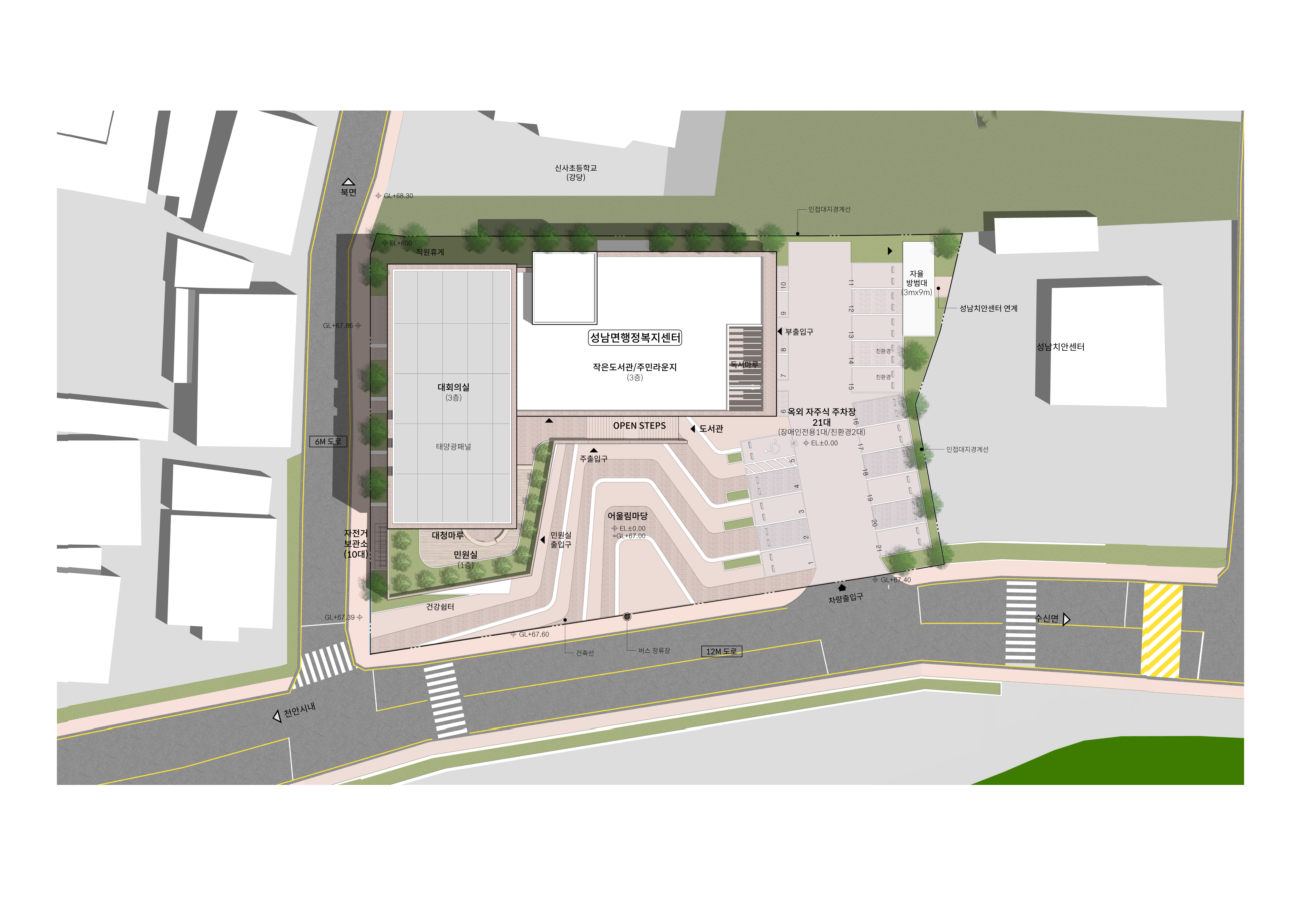 대지의 물리적 한계를 극복하고 이용자의 편의를 최우선으로 고려하여 최적의 배치를 실현했습니다. 남쪽의 ‘새터들’ 방향으로 열린 배치를 통해 우수한 채광과 조망을 확보하였으며, 전면도로와 접한 부분에 어울림마당을 배치하여 지역 주민의 자연스러운 유입을 유도합니다. 특히 보행 영역과 차량(서비스) 영역을 명확히 분리하여 안전성을 높이고, 주민 접근성을 극대화한 개방형 공간 구성을 완성했습니다.
